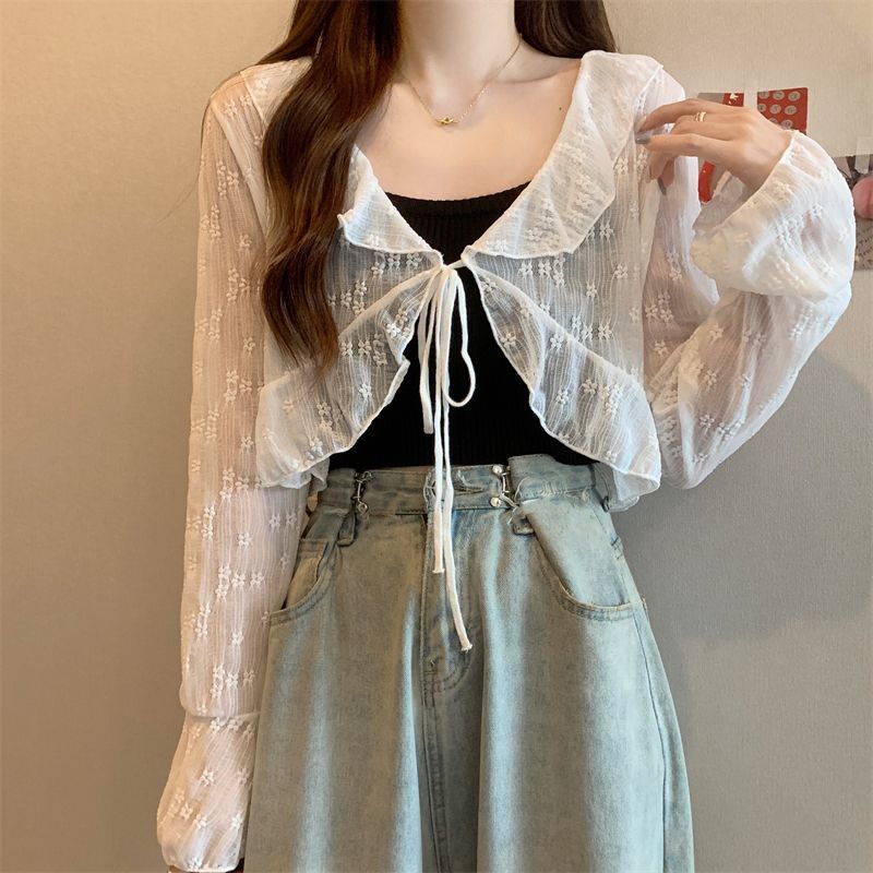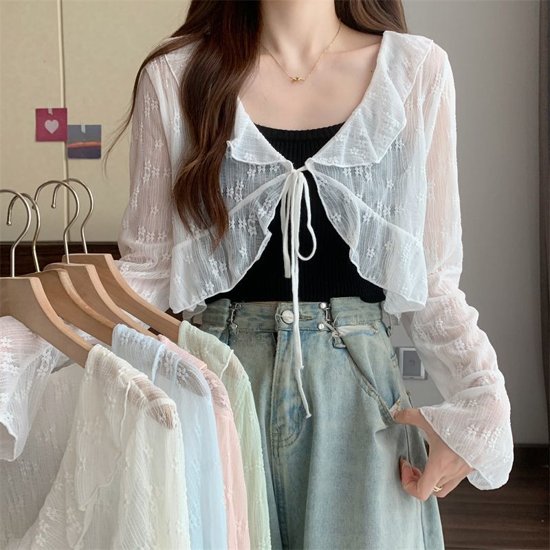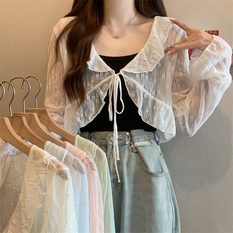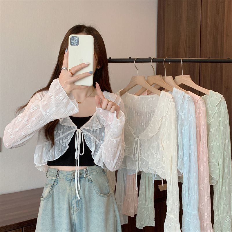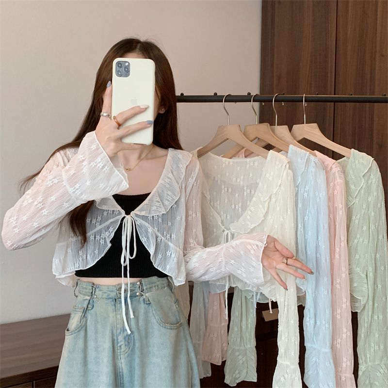디자인 센스 레이스 업 러플 레이스 카디건 여성 여름 통기성 선 스크린 재킷 슬링 아우터 스트랩 탑 핑크스토어 가기