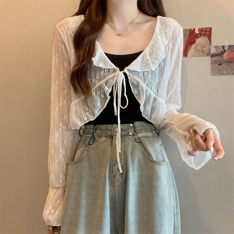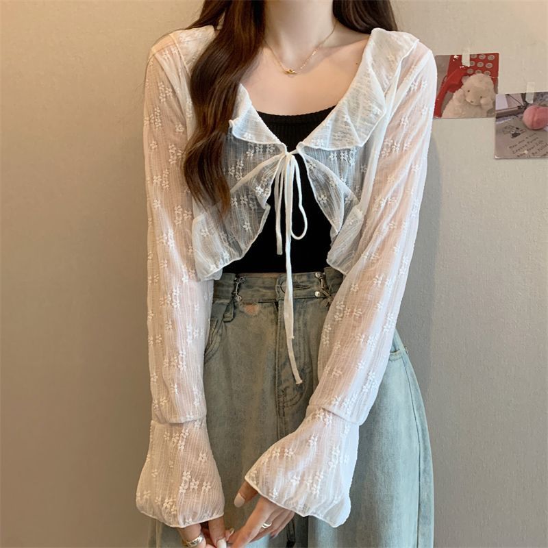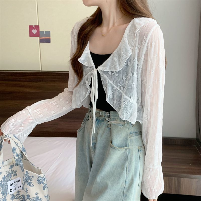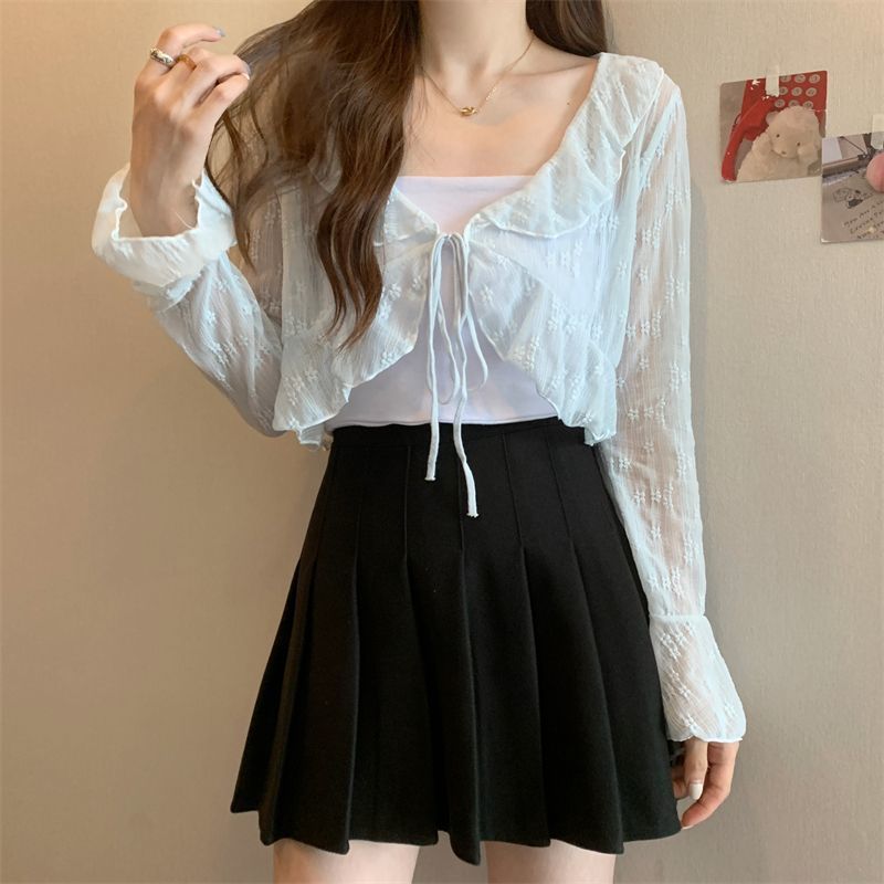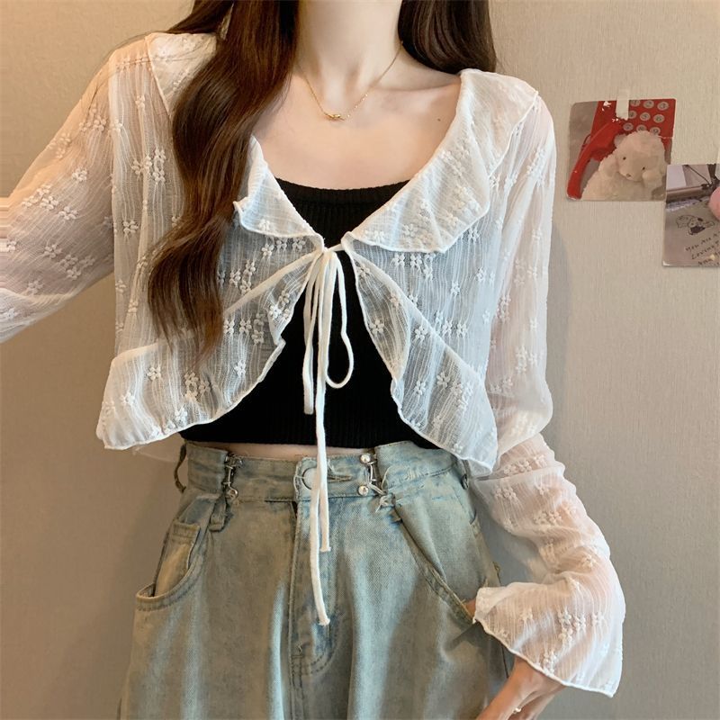 디자인 센스 레이스 업 러플 레이스 카디건 여성 여름 통기성 선 스크린 재킷 슬링 아우터 스트랩 탑 핑크스토어 가기