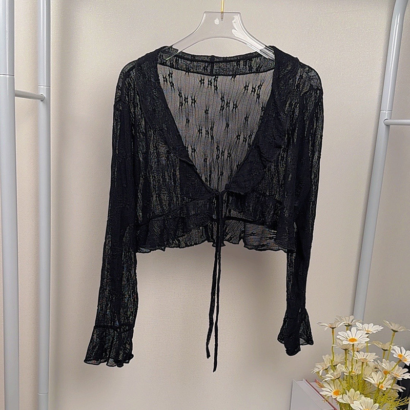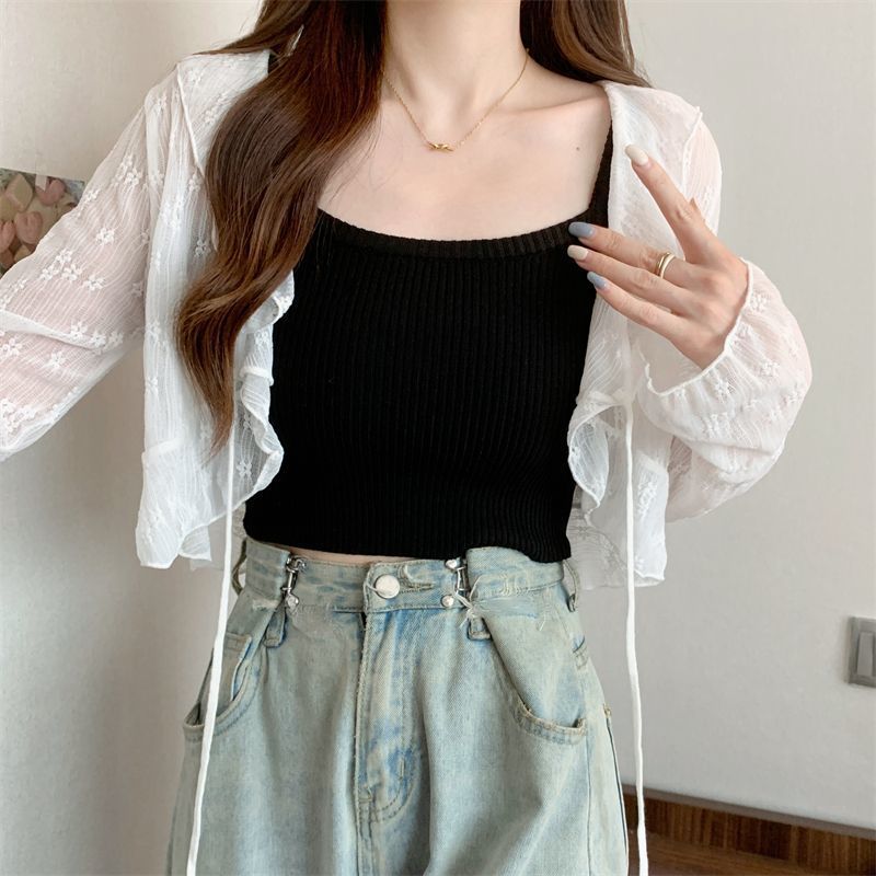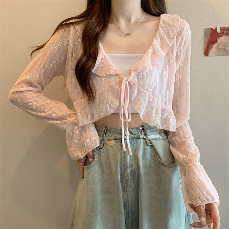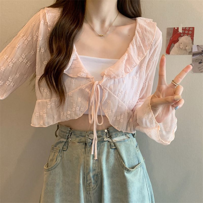 디자인 센스 레이스 업 러플 레이스 카디건 여성 여름 통기성 선 스크린 재킷 슬링 아우터 스트랩 탑 핑크