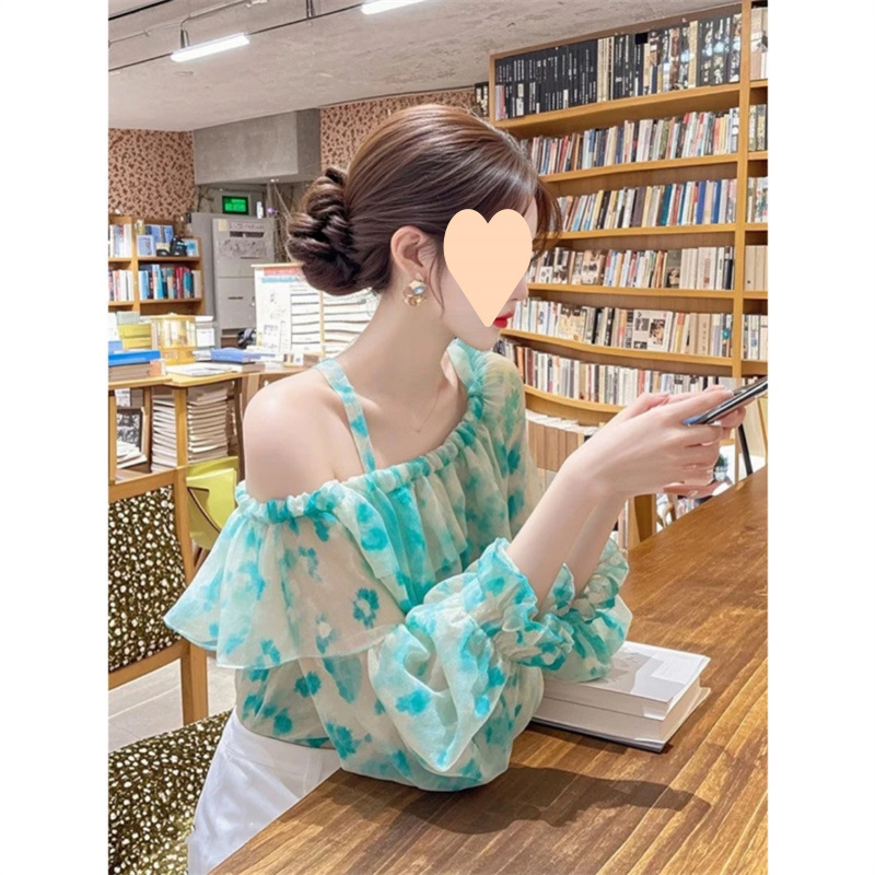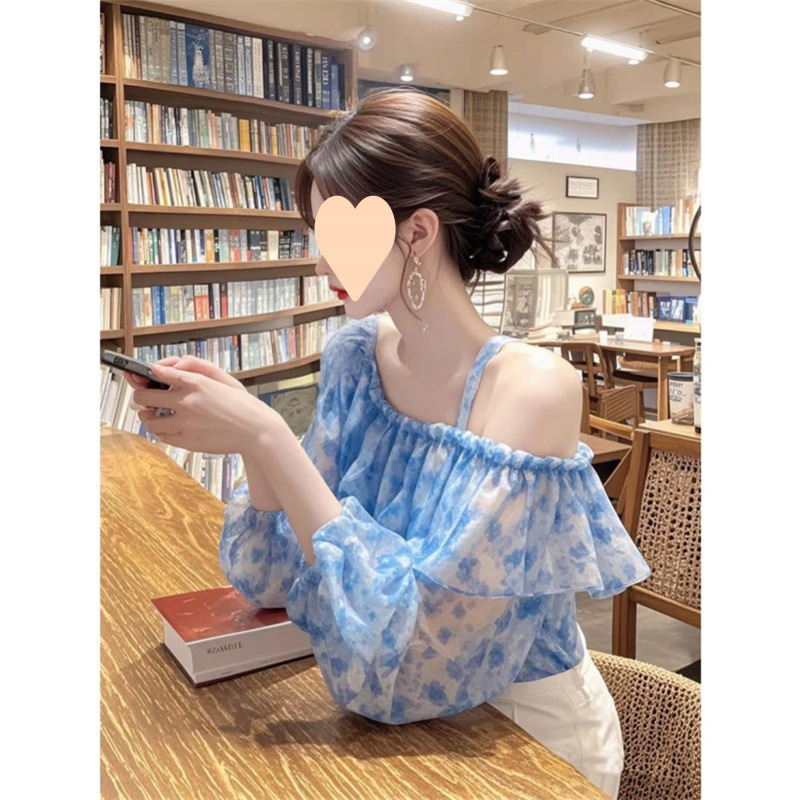 2025 봄과 여름 새로운 디자인 센스 틈새 오프 숄더 꽃 거품 긴팔 셔츠 우아한 올 매치 핑크 셔츠스토어 가기
