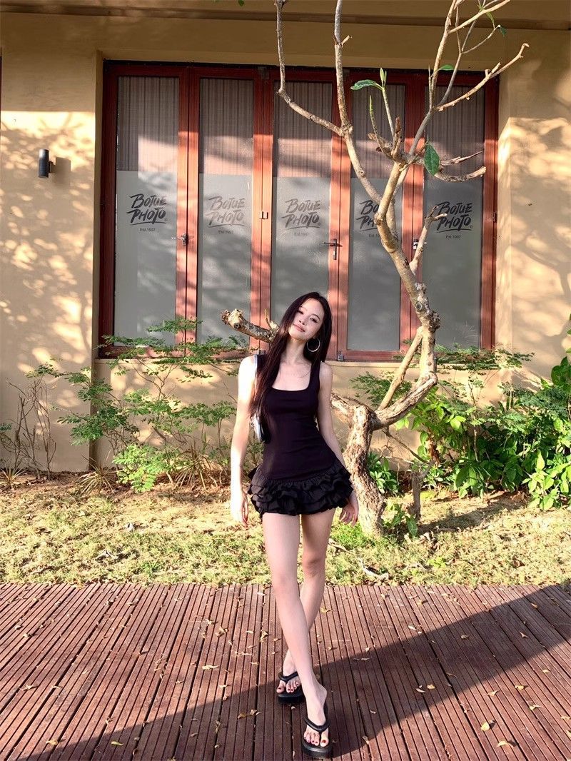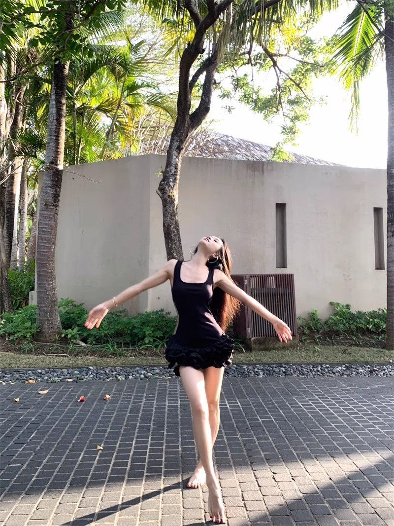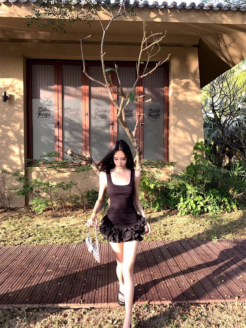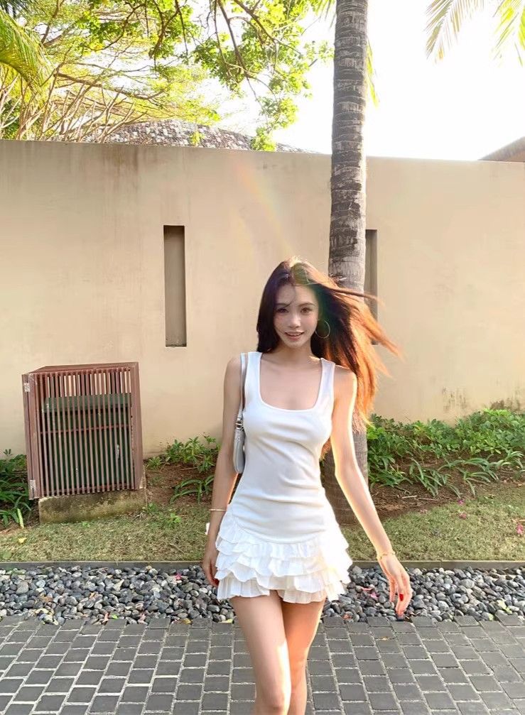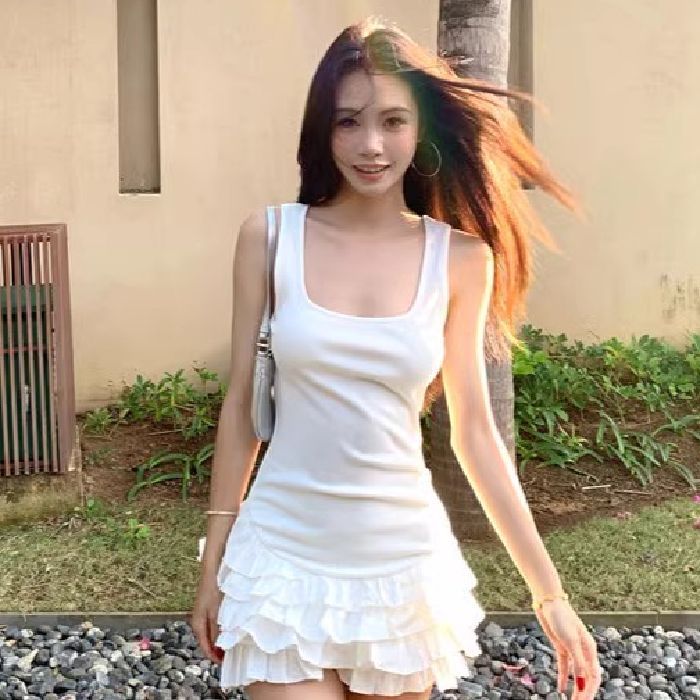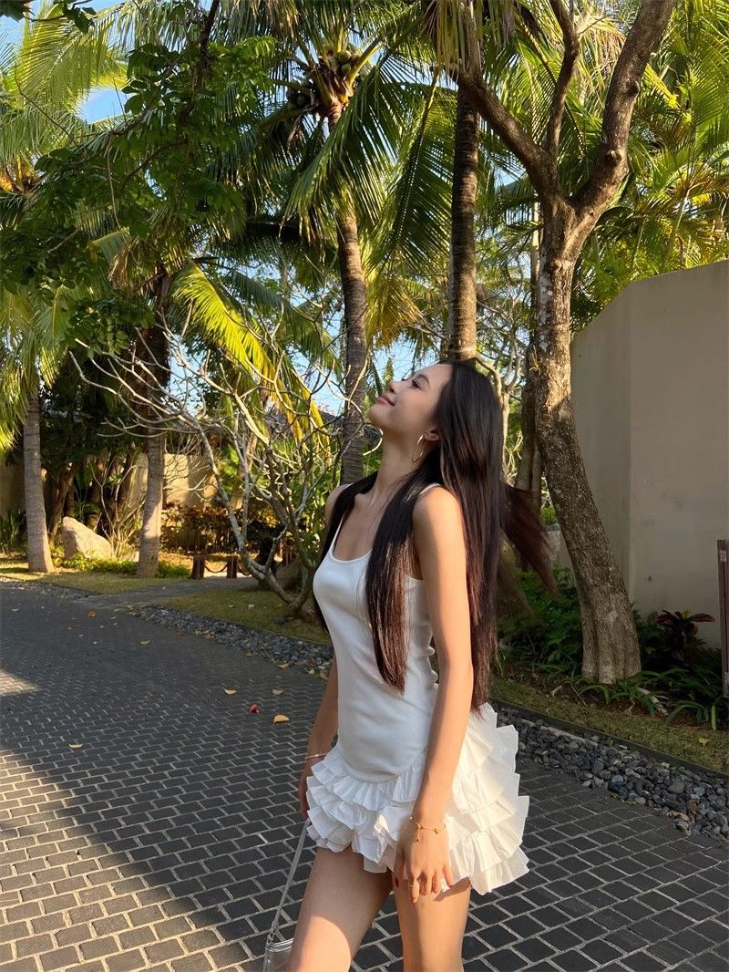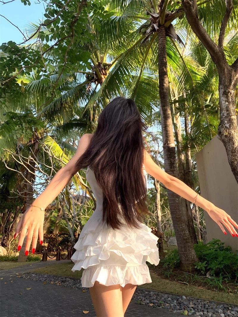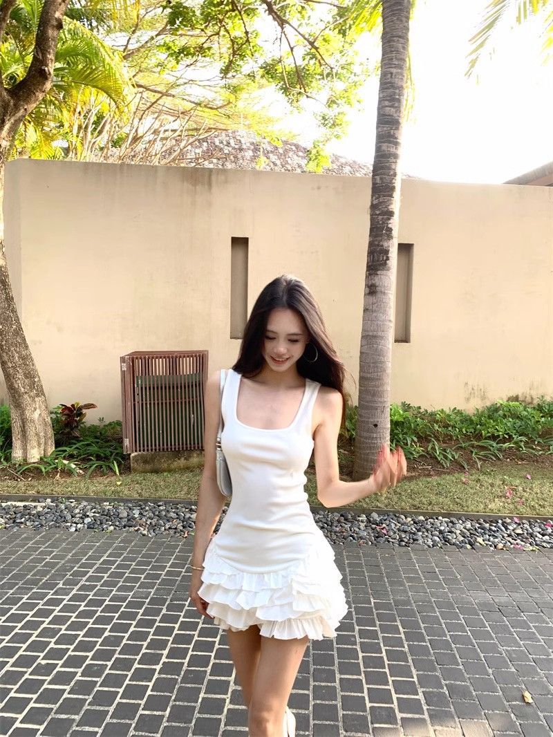 달콤한 스타일 화이트 슬링 원피스 여성 의류 여름 독특한 러플 스커트 발레 스타일 A 라인 스커트스토어 가기