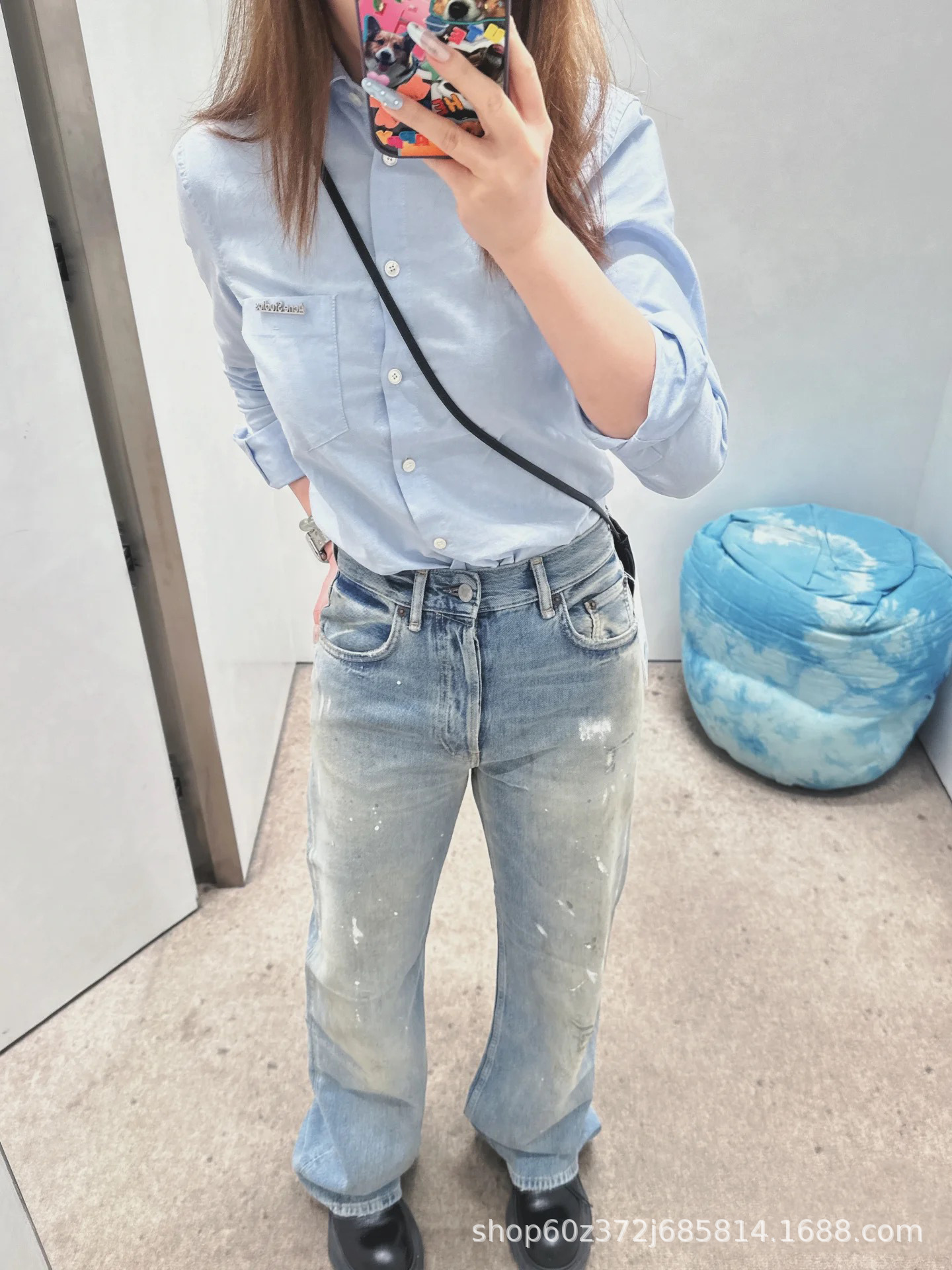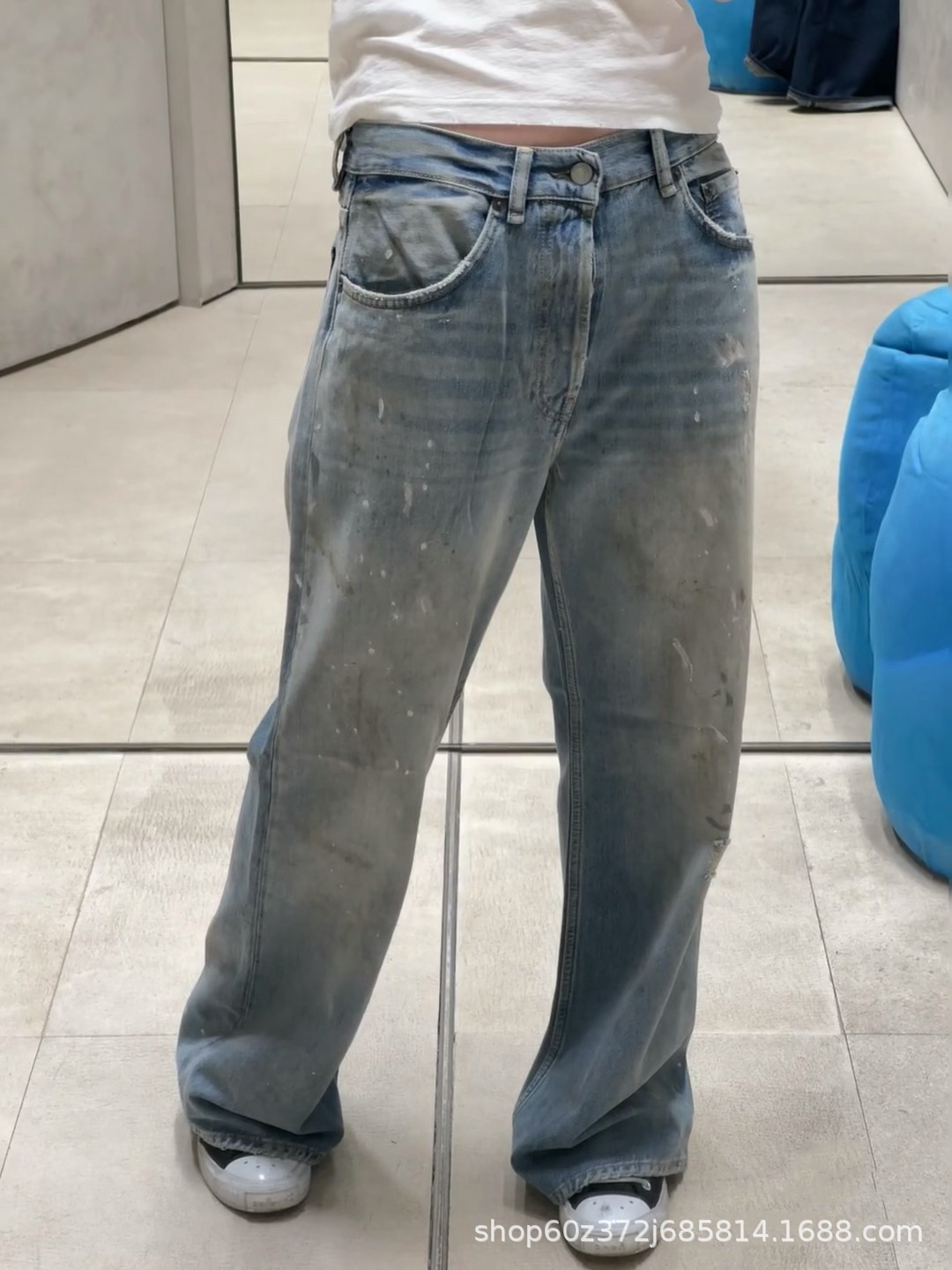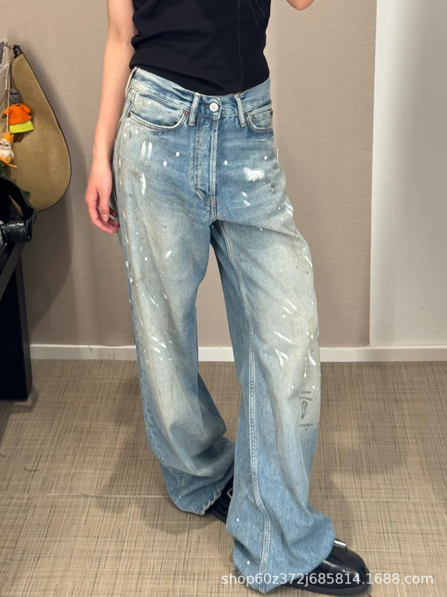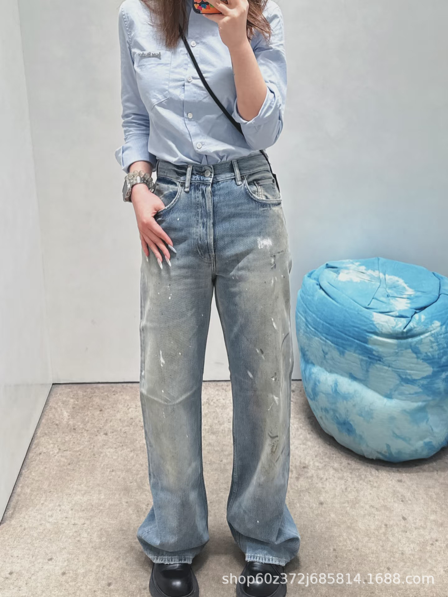 1981년 백징팅 하이웨이스트 디자인 스플래시 잉크 데미지 레트로 워싱 스트레이트 데님 팬츠 남녀공용 캐주얼 만능템