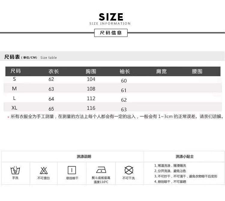 关于洗涤:深色衣物初次清洗可能会有轻微的浮色;属于正常现象哦;洗涤时务必与浅色衣物分开清洗,所有的衣物勿用温水/开水洗涤;禁止机洗 机洗摩擦力太强 禁止浸泡 轻柔手洗。
