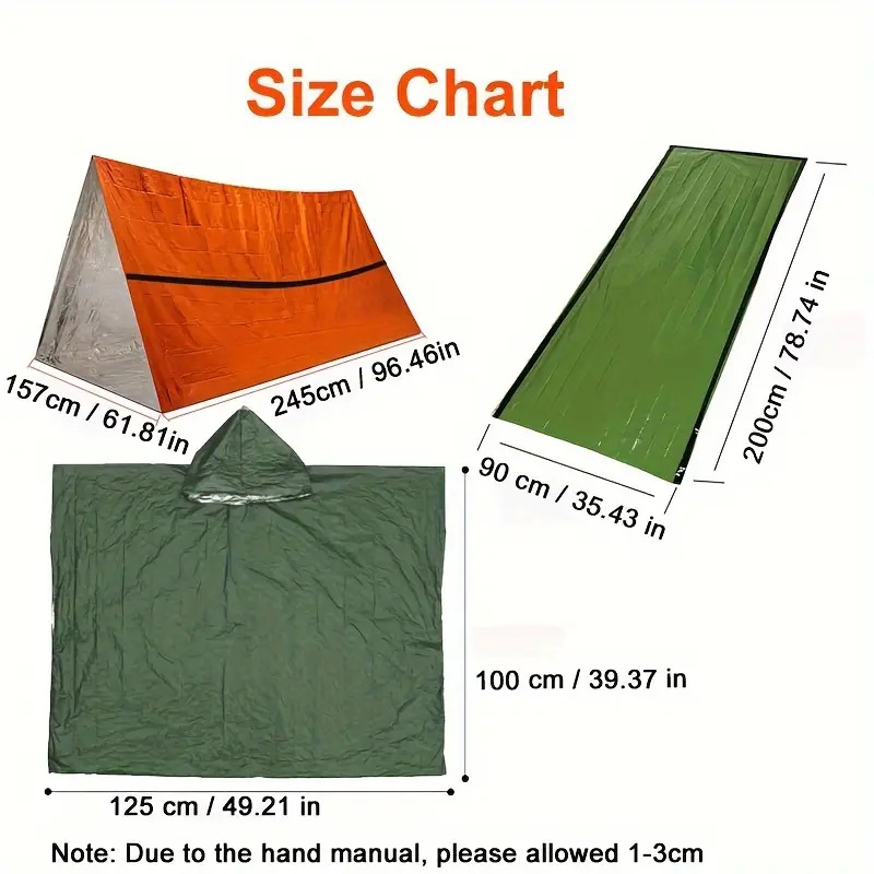 3개 세트 - 야외 비상 대피소 세트 - SOS 신호가 포함된 보온 담요, 생존 튜브 텐트, 판초