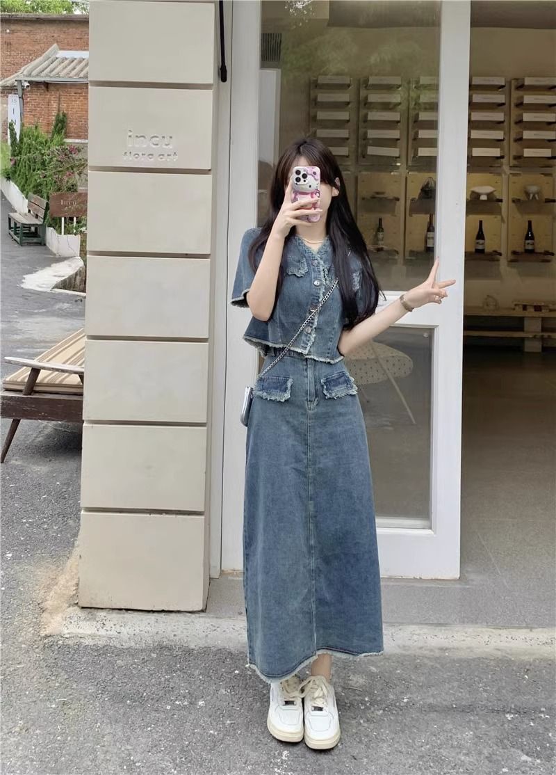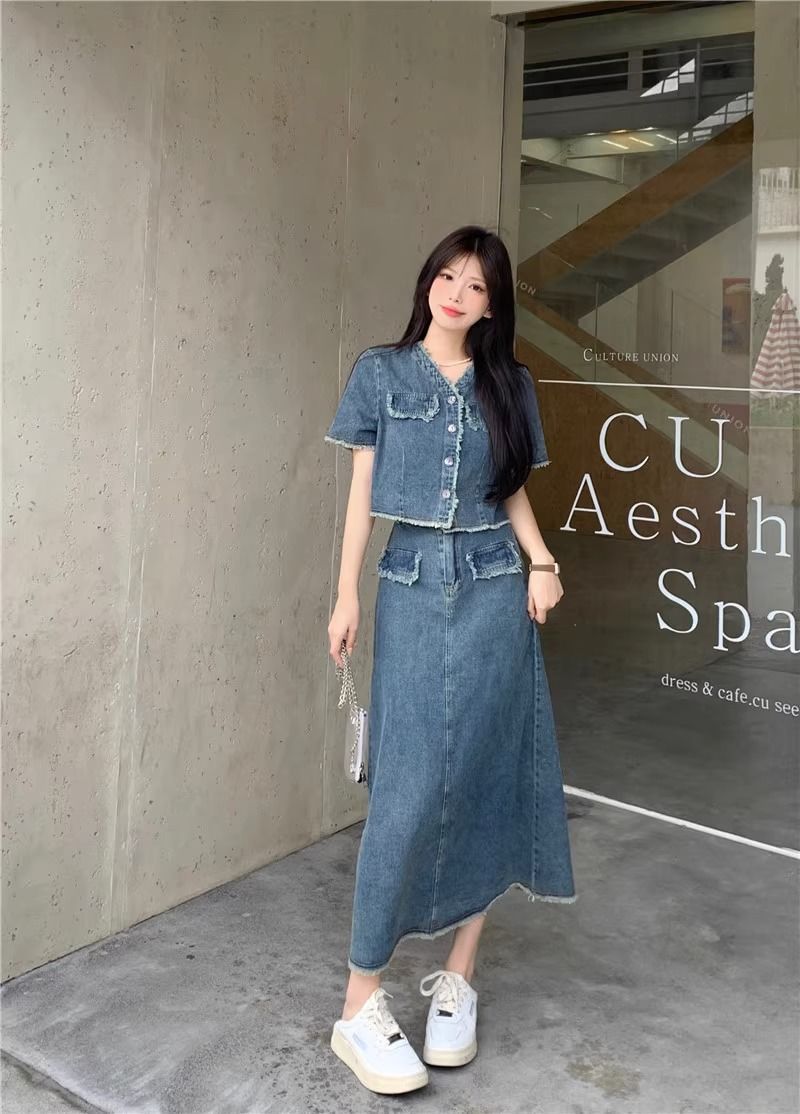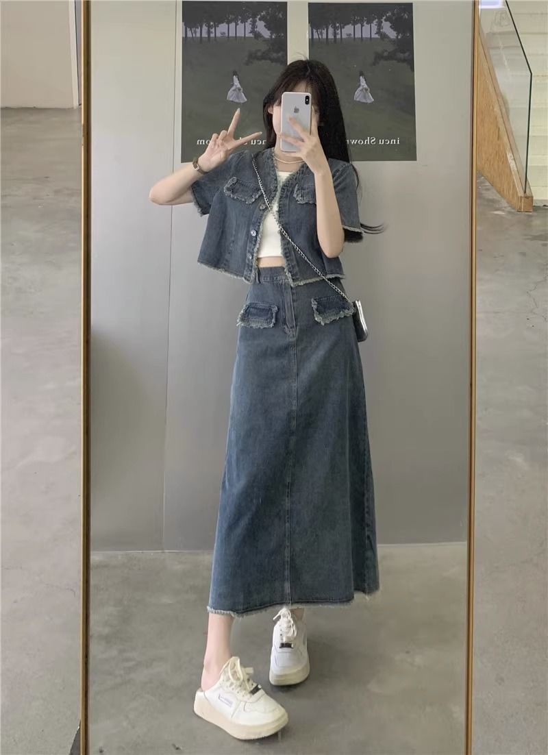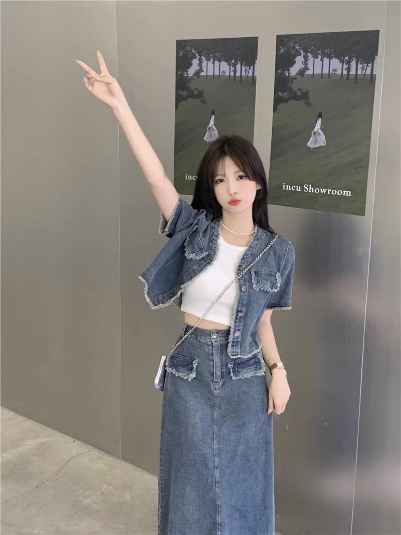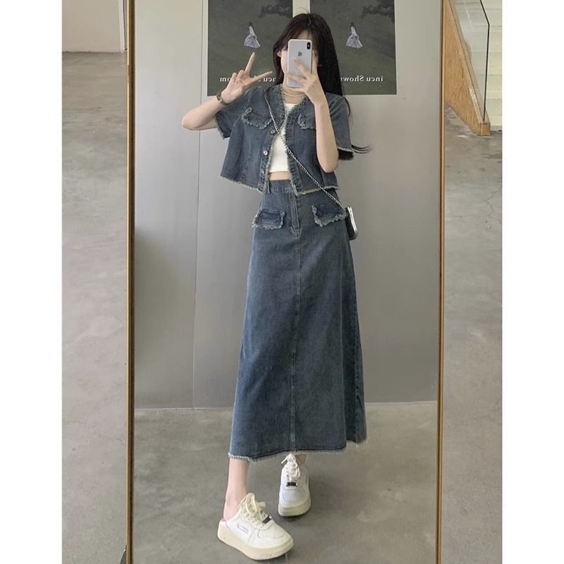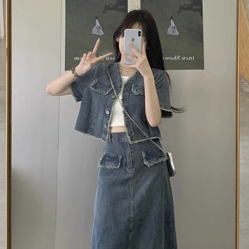 고급 레트로 스파이스 소녀 반팔 데님 세트 여성 여름 디자인 스커트 투피스 틈새스토어 가기