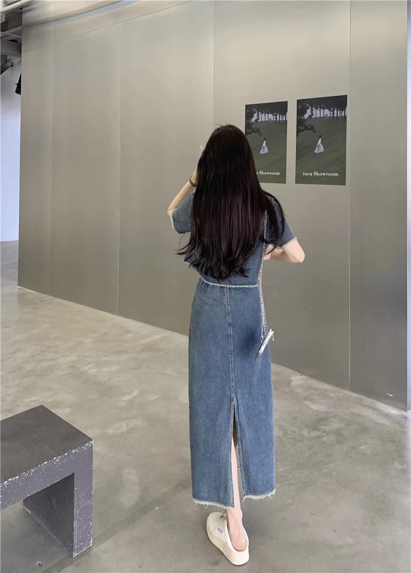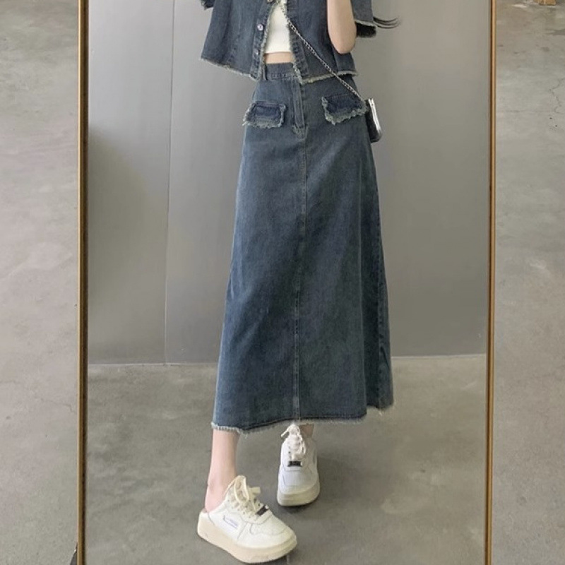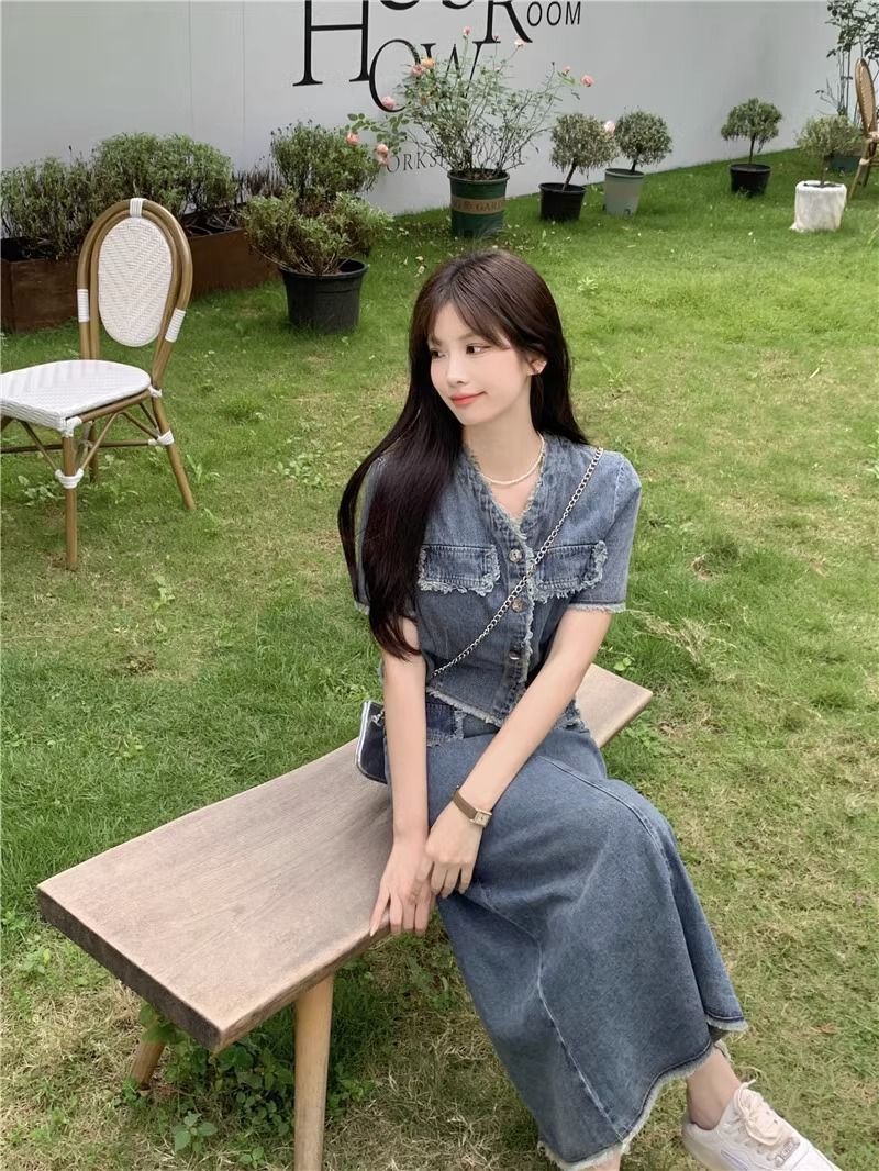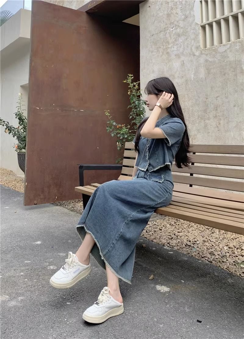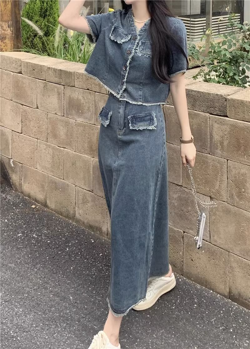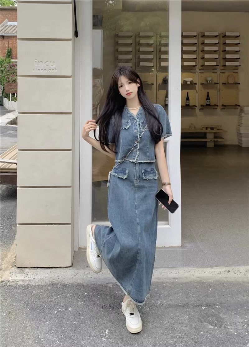 고급 레트로 스파이스 소녀 반팔 데님 세트 여성 여름 디자인 스커트 투피스 틈새스토어 가기