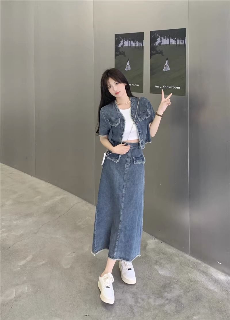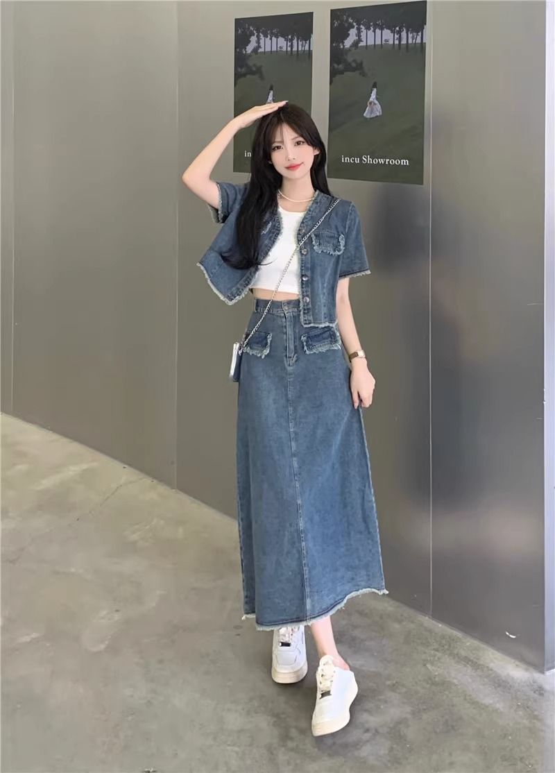고급 레트로 스파이스 소녀 반팔 데님 세트 여성 여름 디자인 스커트 투피스 틈새