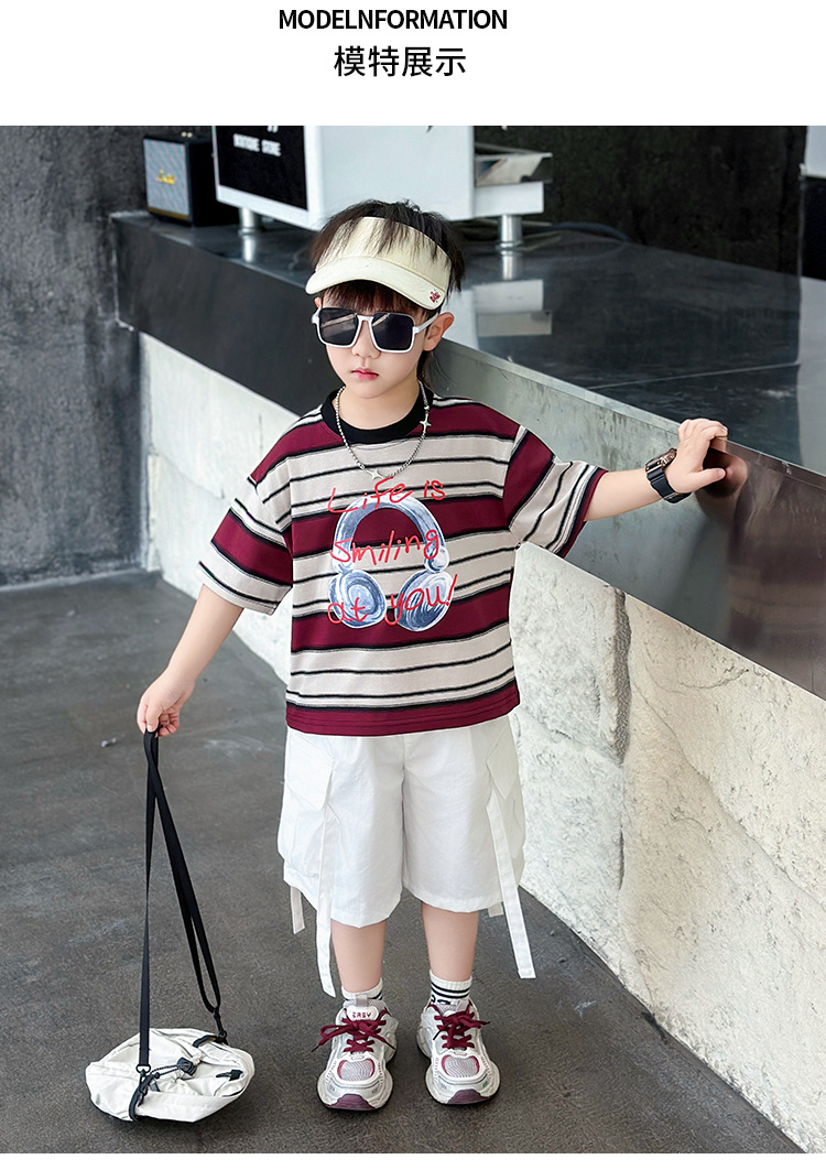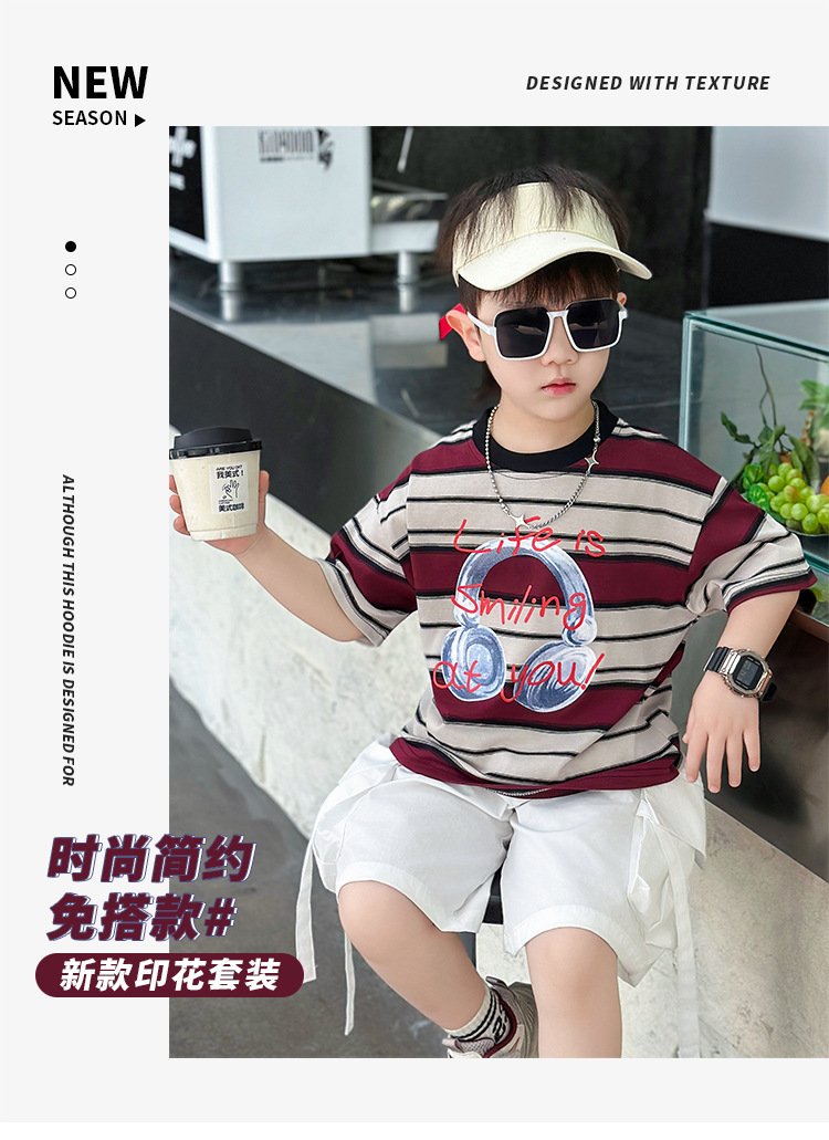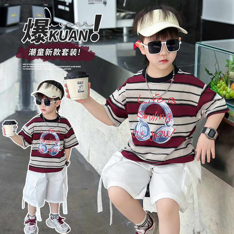 소년 여름 정장 2025 새로운 어린이 여름 얇은 스포츠 잘 생긴 소년 스트라이프 반팔 투피스 세트 유행스토어 가기