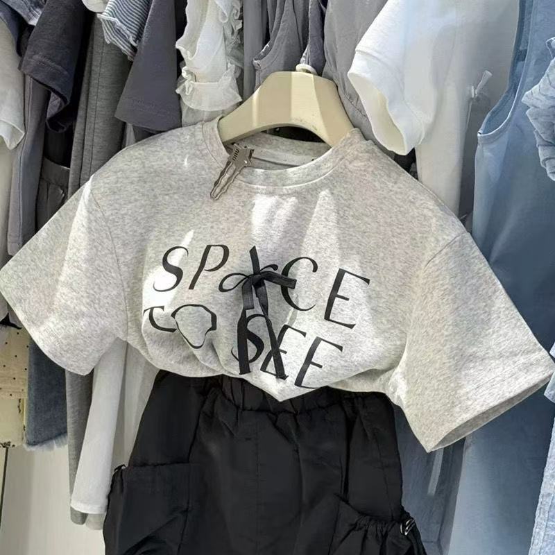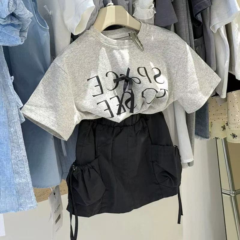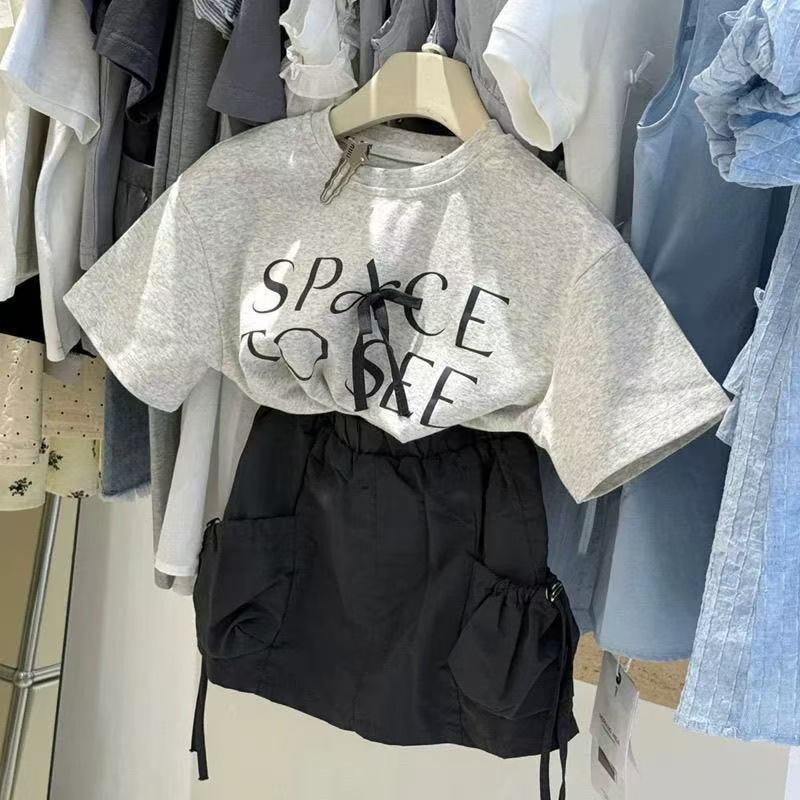 여자 티셔츠 2025 여름 원피스 소녀 활 편지 캐주얼 반팔 최고 서양식 어린이 작업복 치마