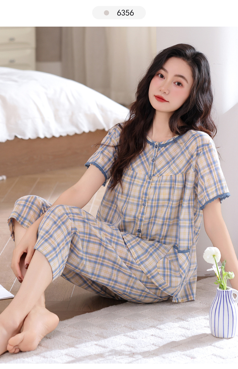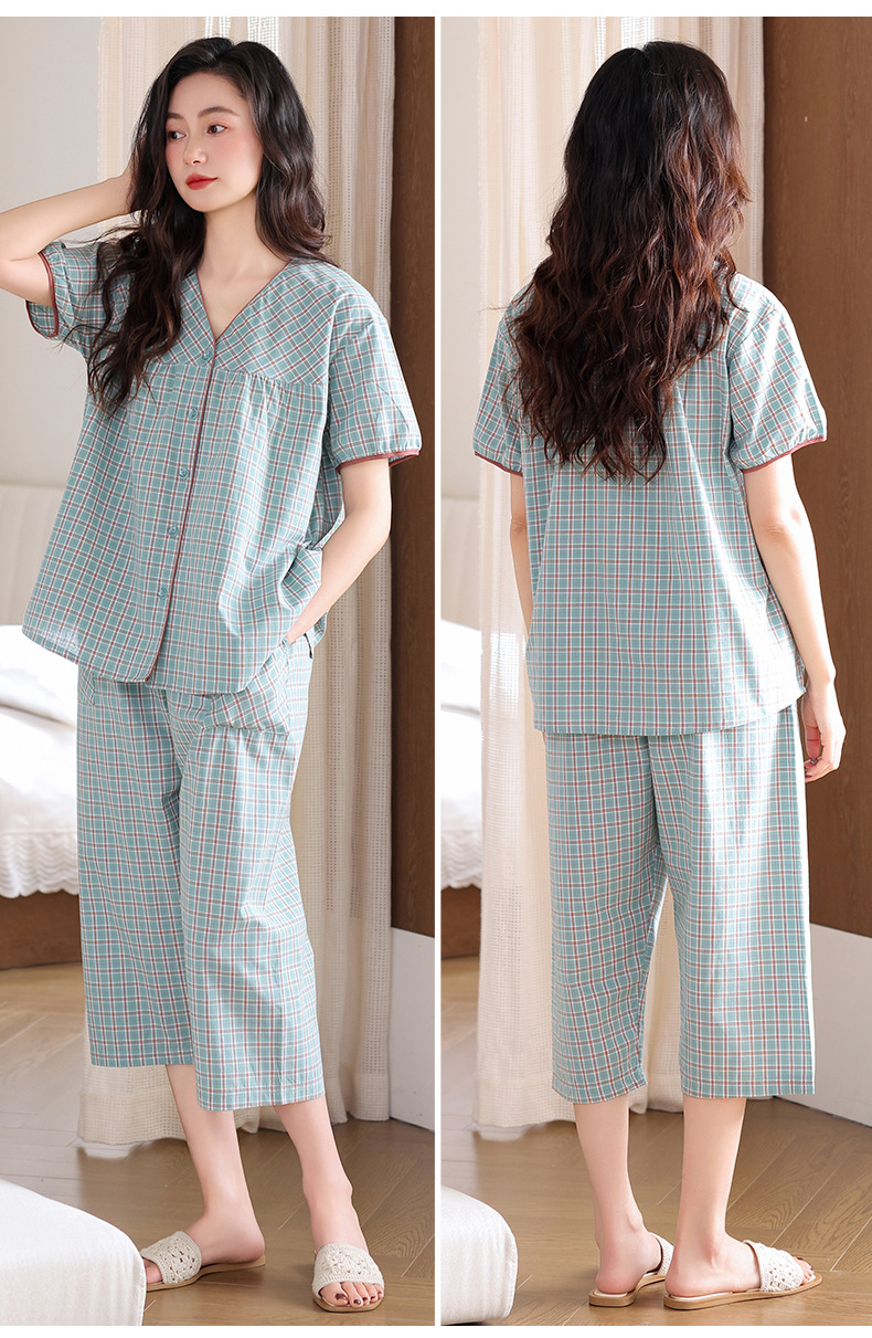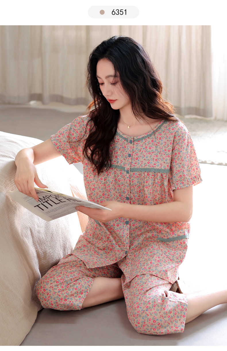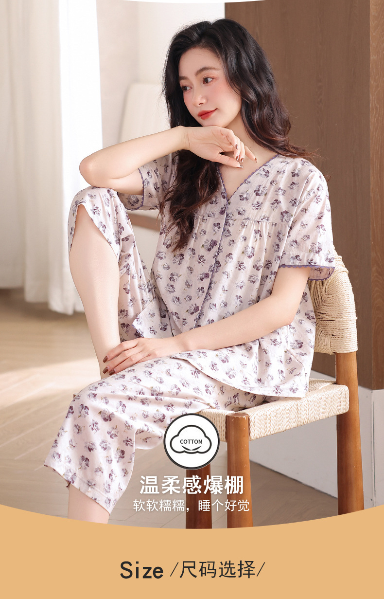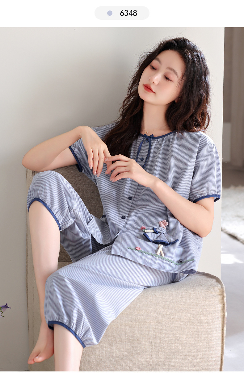 짠 면 잠옷 여성 여름 반팔 카프리 바지 얇은 2025 새 여름 홈 의류 면화 세트스토어 가기