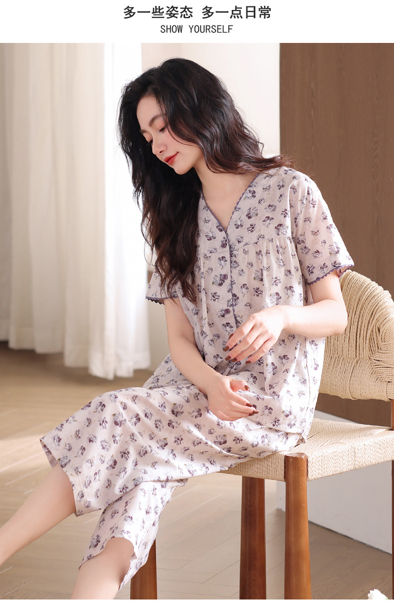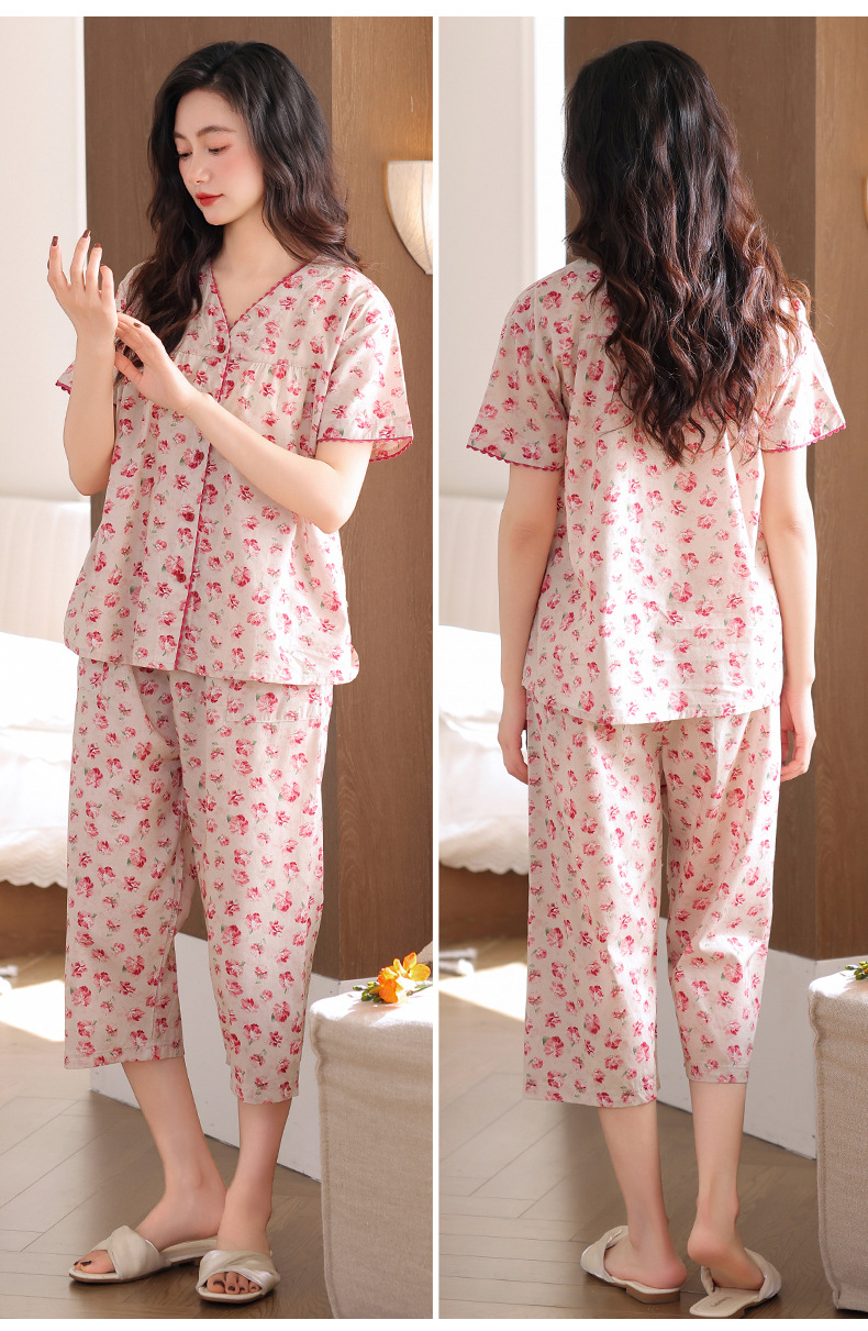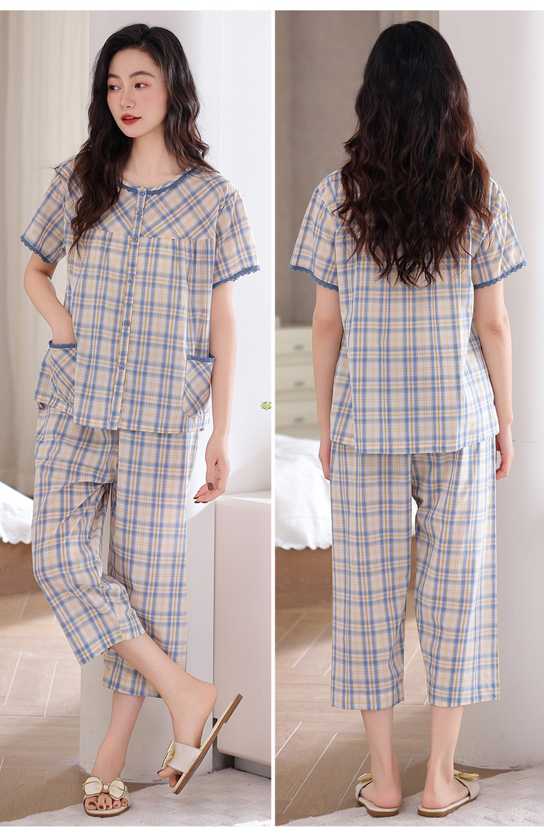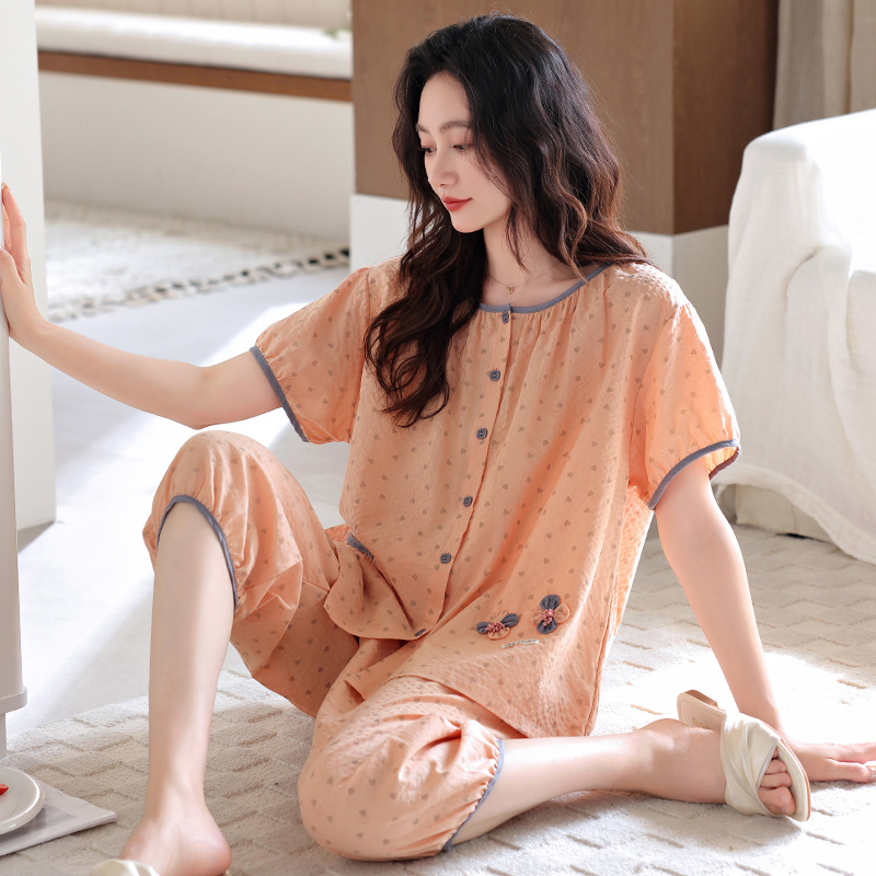짠 면 잠옷 여성 여름 반팔 카프리 바지 얇은 2025 새 여름 홈 의류 면화 세트스토어 가기