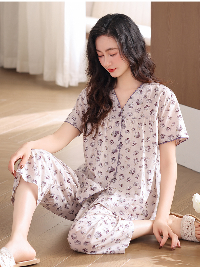 짠 면 잠옷 여성 여름 반팔 카프리 바지 얇은 2025 새 여름 홈 의류 면화 세트
