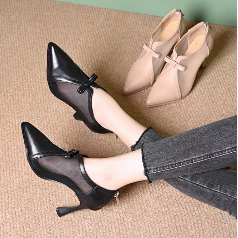 프렌치 스타일의 우아하고 편안한 스틸레토 힐 여름 중공 부드러운 가죽 뾰족한 신발 통기성 메쉬 깊은 입 보우 하이힐