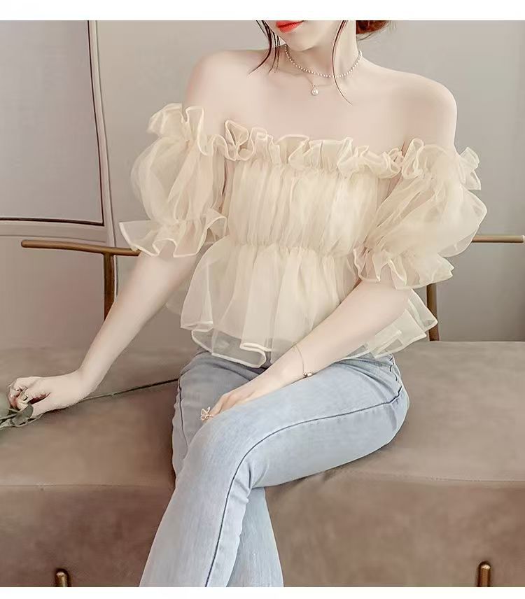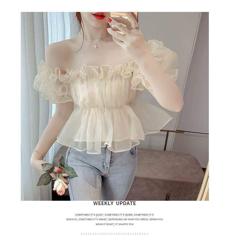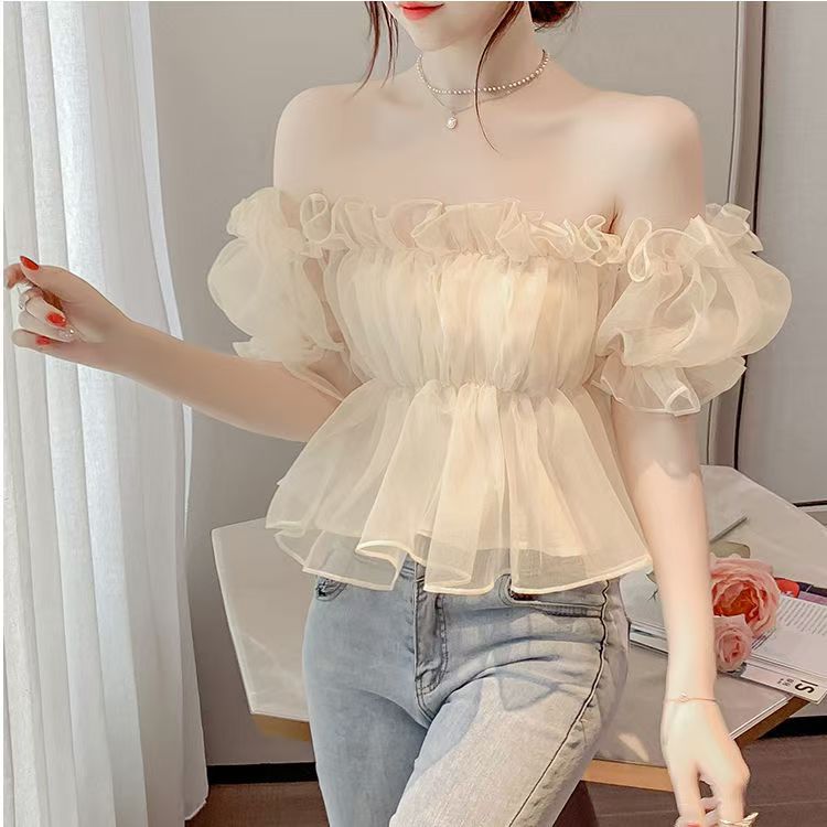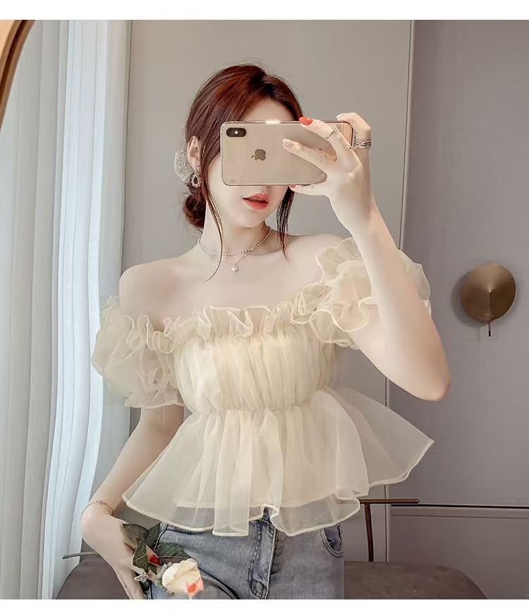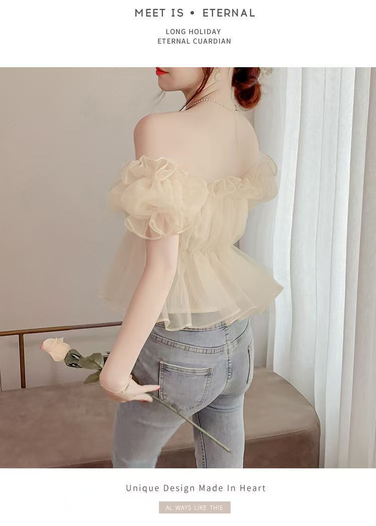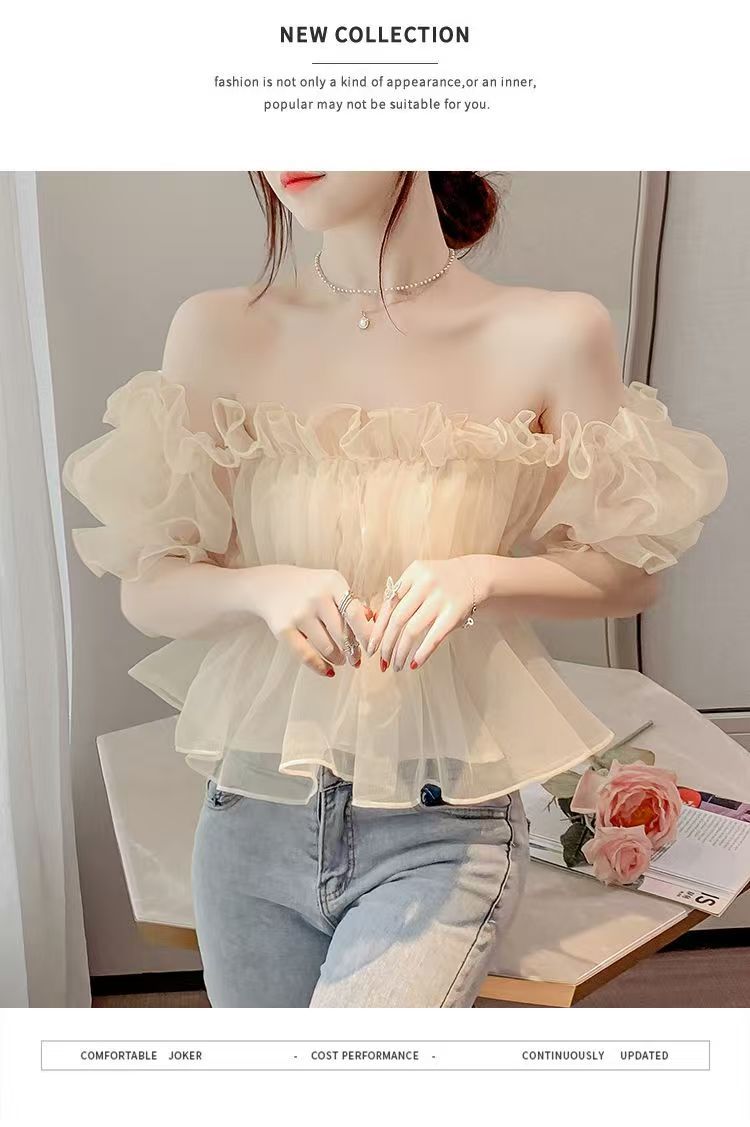 여성용 어깨 솔리드 컬러 작은 셔츠 2025 여름 새로운 슬리밍 달콤한 오프 숄더 스퀘어 칼라 퍼프 슬리브 탑 트렌디스토어 가기