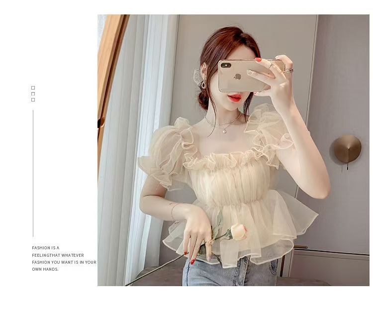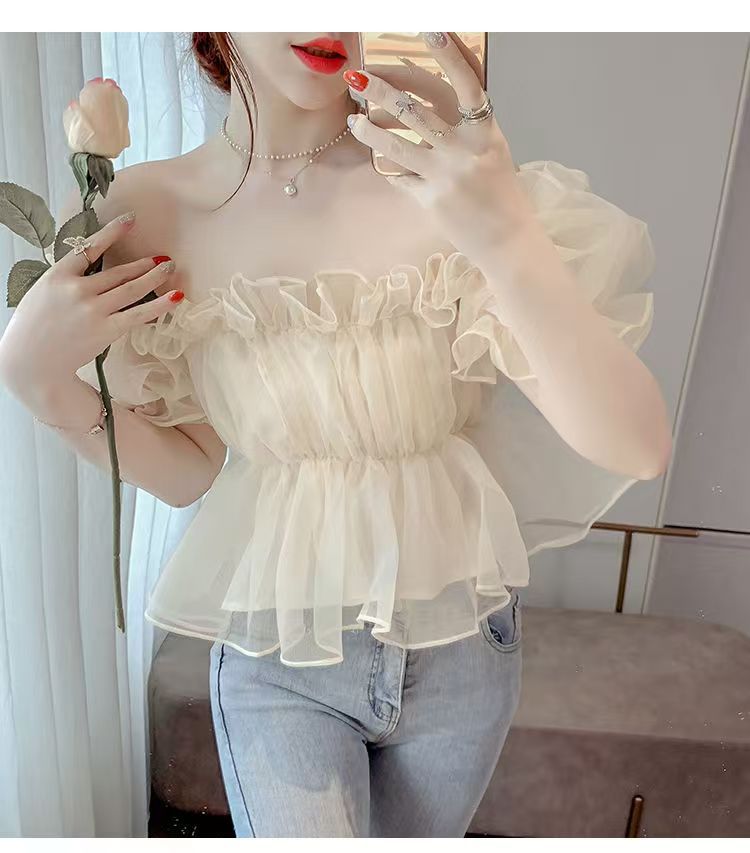 여성용 어깨 솔리드 컬러 작은 셔츠 2025 여름 새로운 슬리밍 달콤한 오프 숄더 스퀘어 칼라 퍼프 슬리브 탑 트렌디