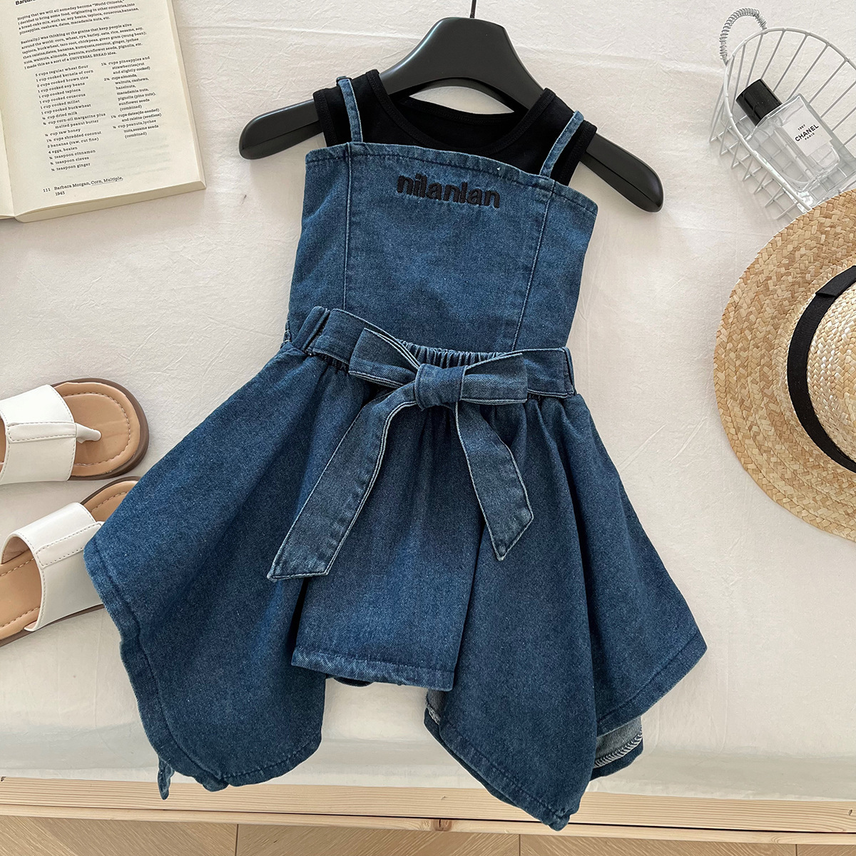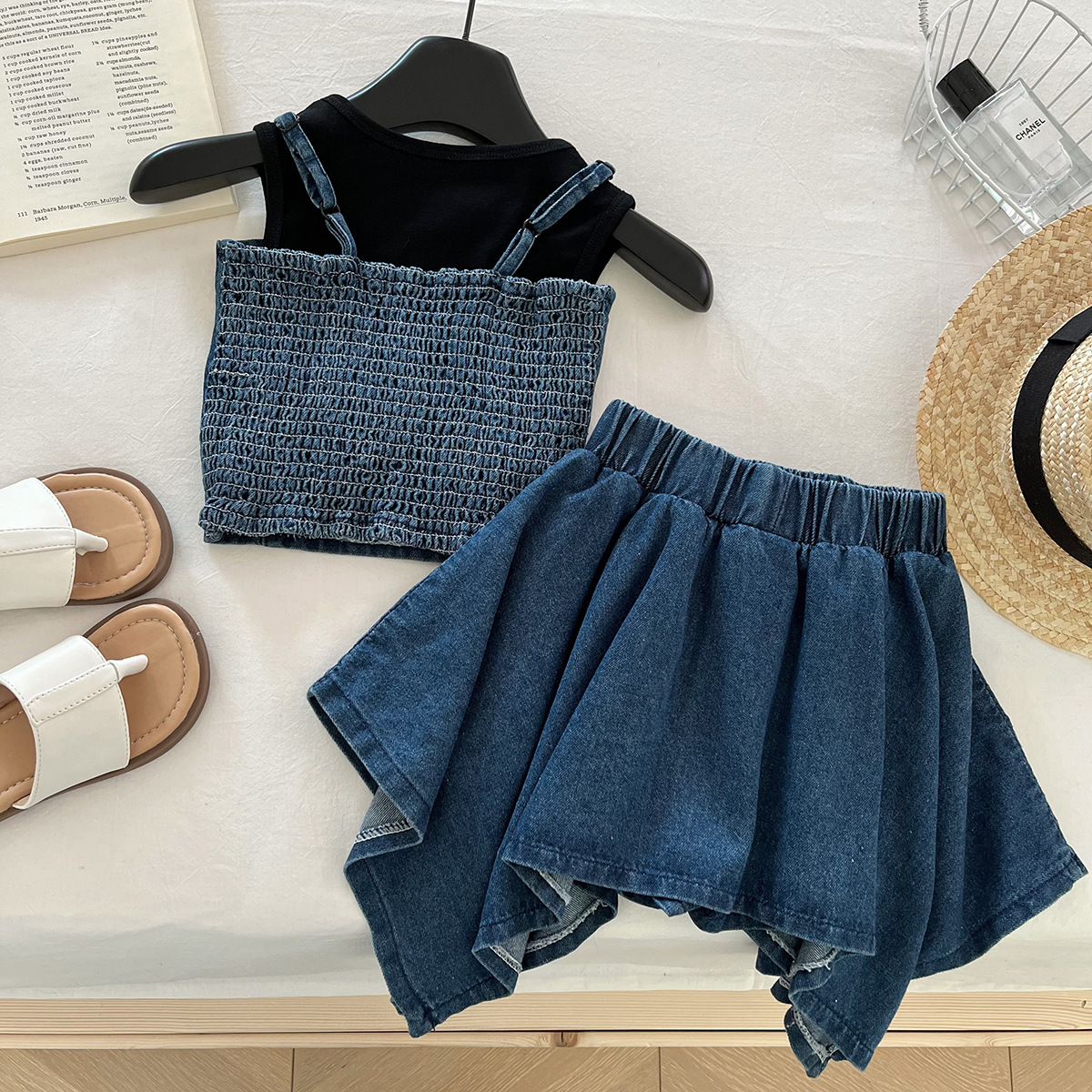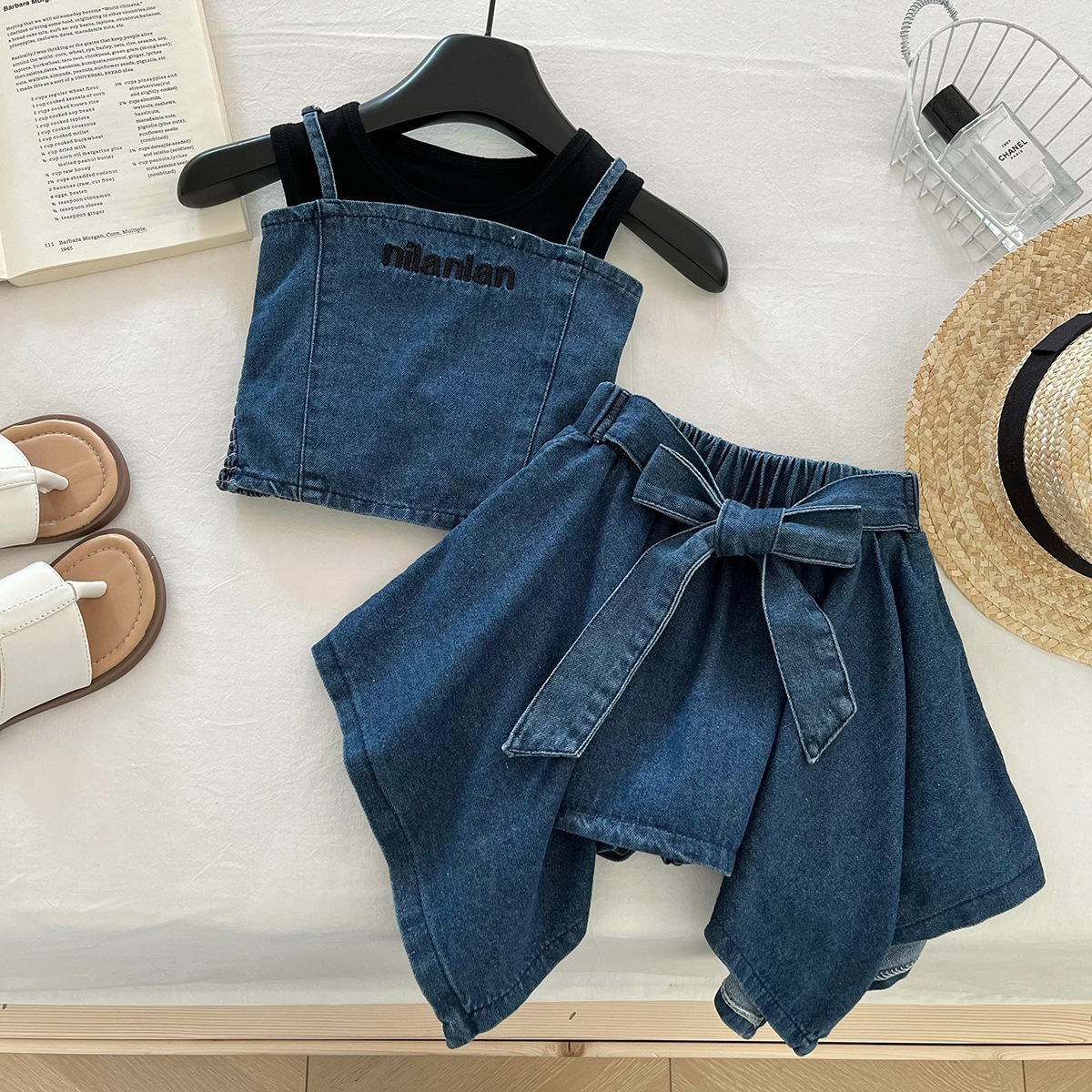 소녀 세트 2025 여름 새로운 민소매 데님 조끼 최고 어린이 데님 스커트 3 피스 세트