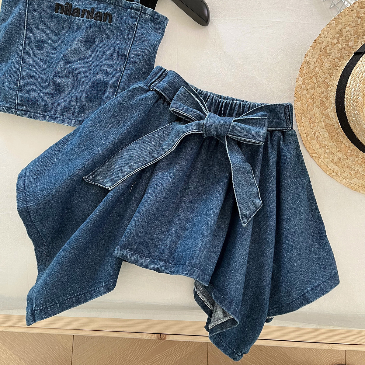 소녀 세트 2025 여름 새로운 민소매 데님 조끼 최고 어린이 데님 스커트 3 피스 세트스토어 가기