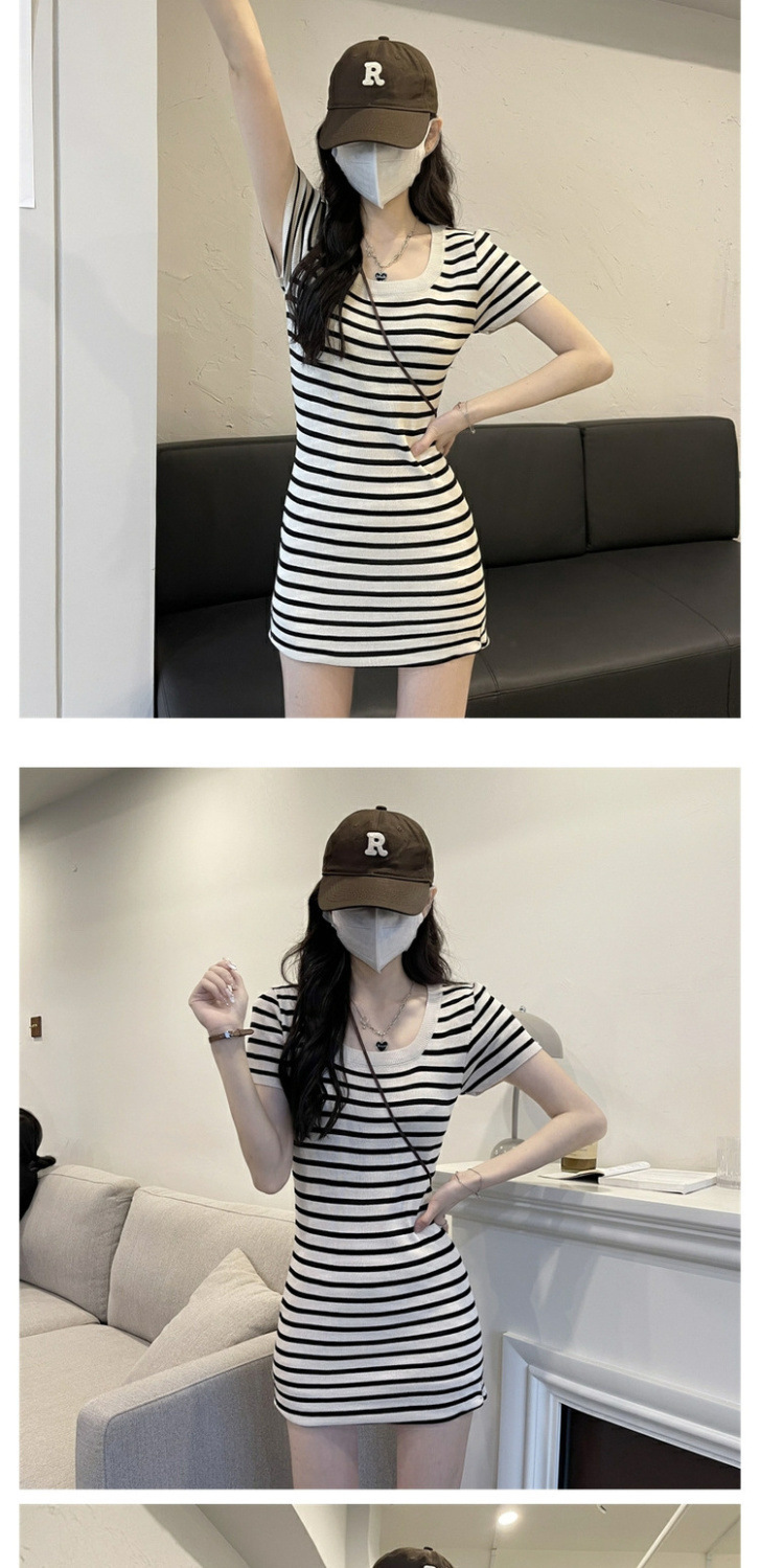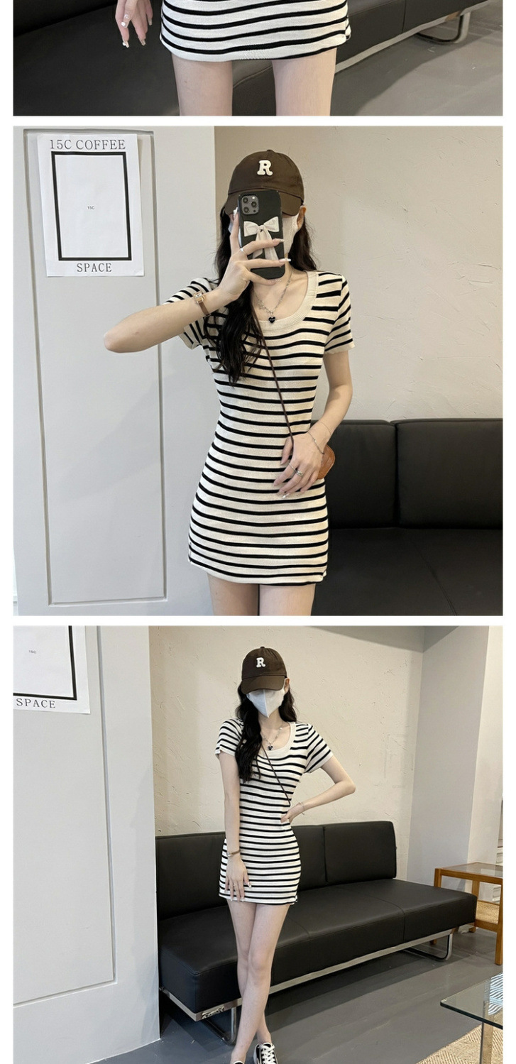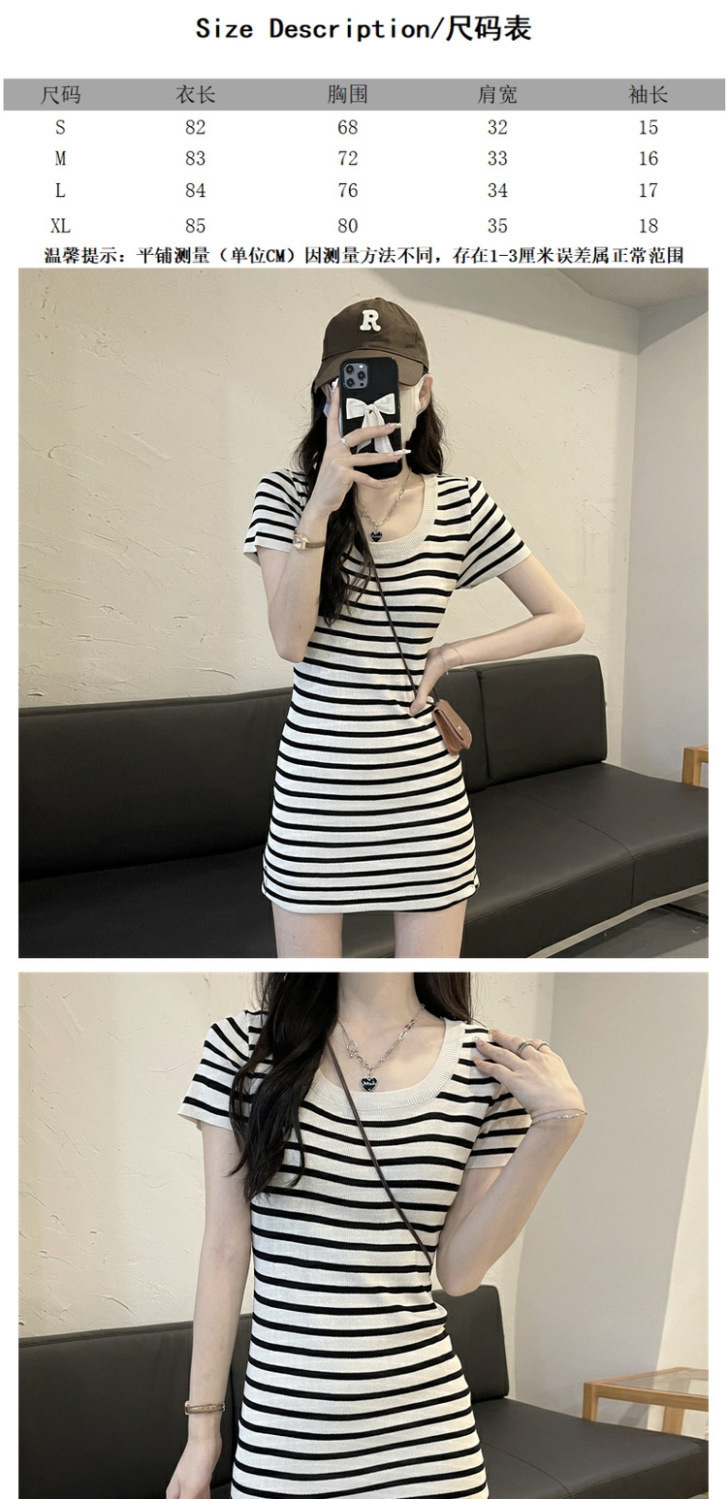 스퀘어 칼라 스트라이프 아이스 실크 니트 반팔 원피스 여성 2025 년 새 여름 칼집 슬림 핏 슬리밍 스커트스토어 가기