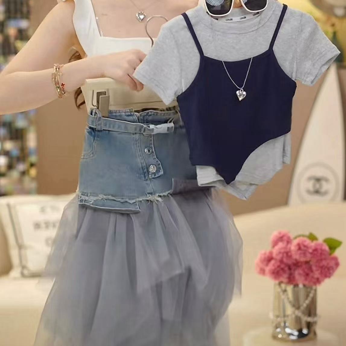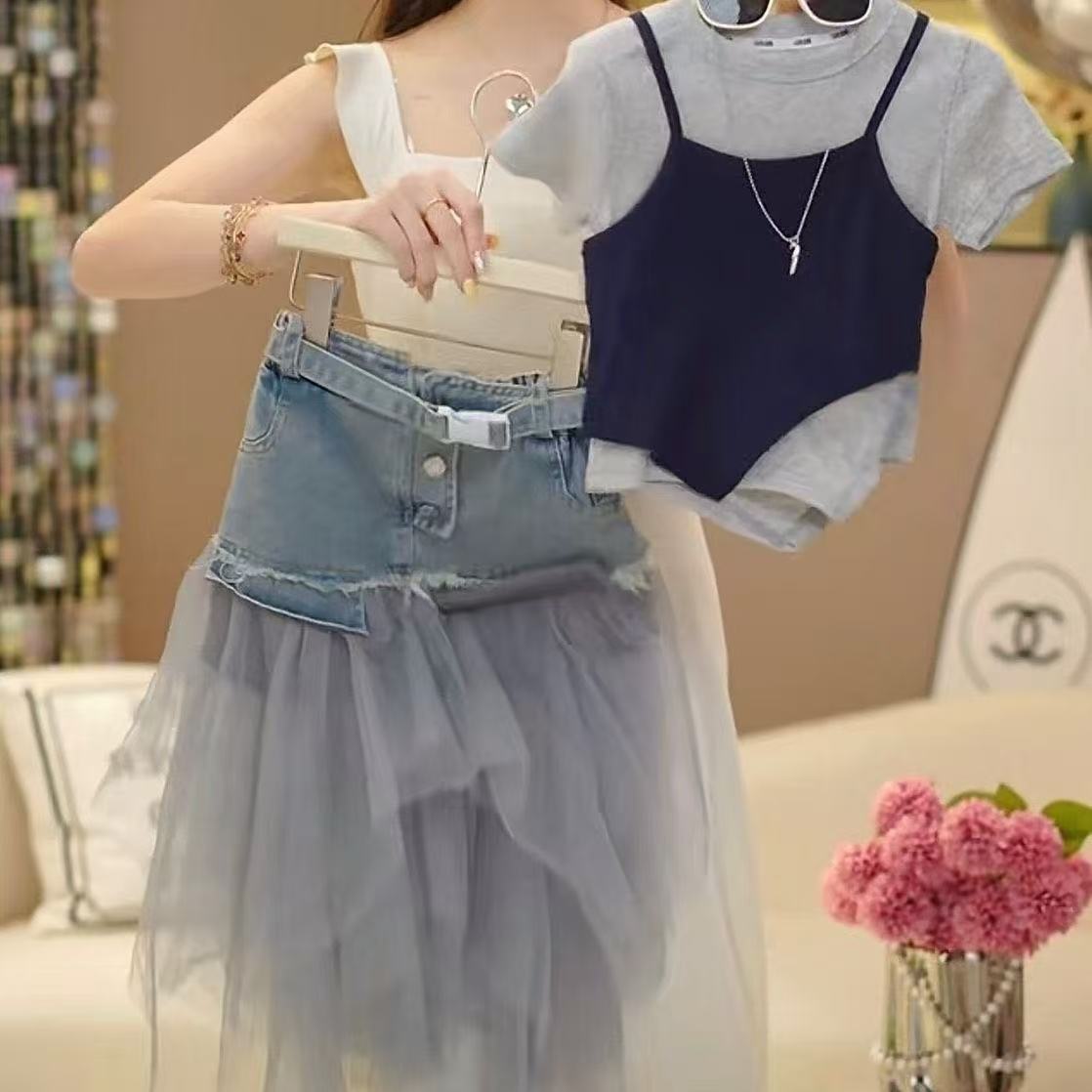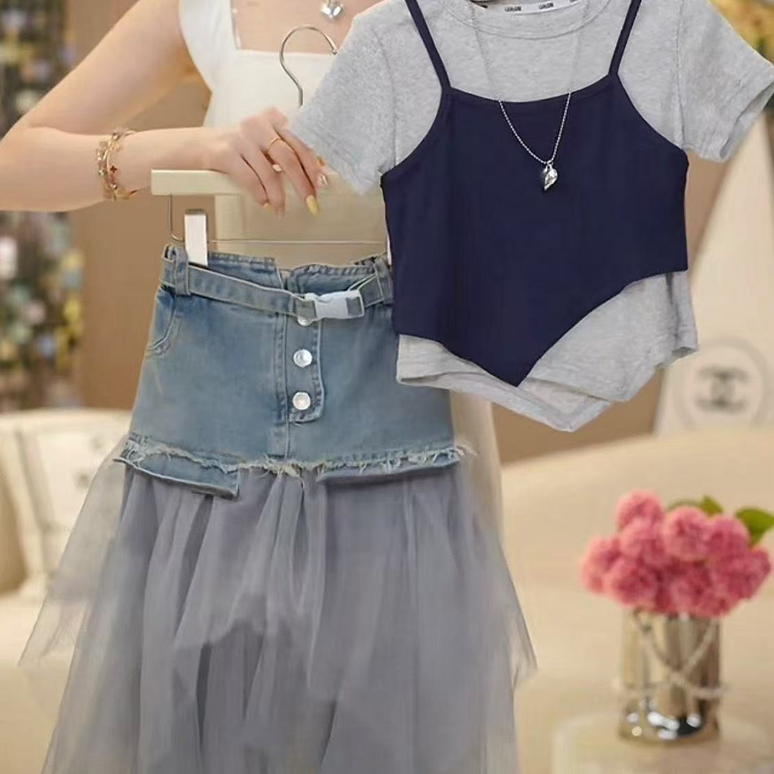소녀 세트 2025 년 여름 서양식 새로운 도착 한국 스타일 짧은 소매 조끼 사이버 축하 스티칭 메쉬 데님 스커트스토어 가기