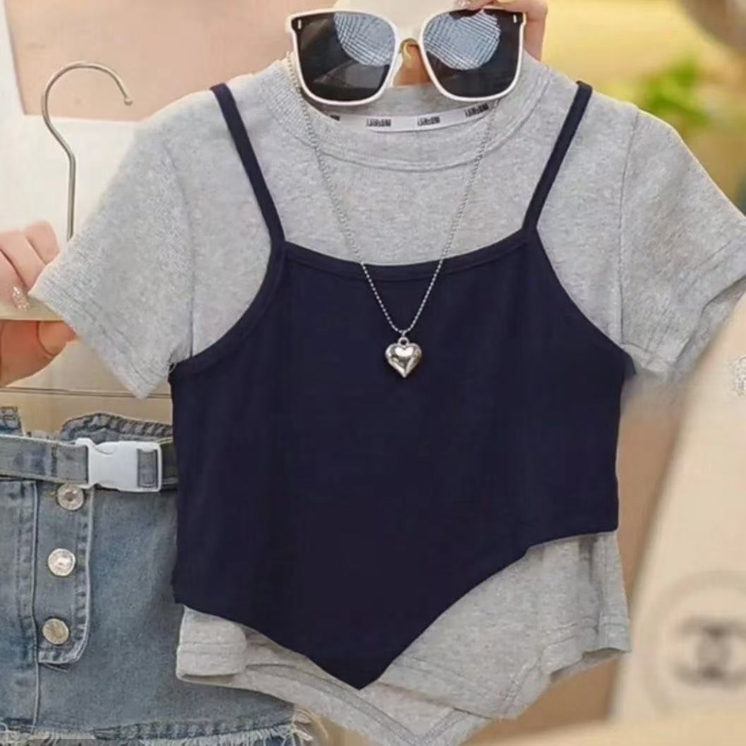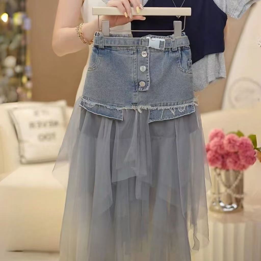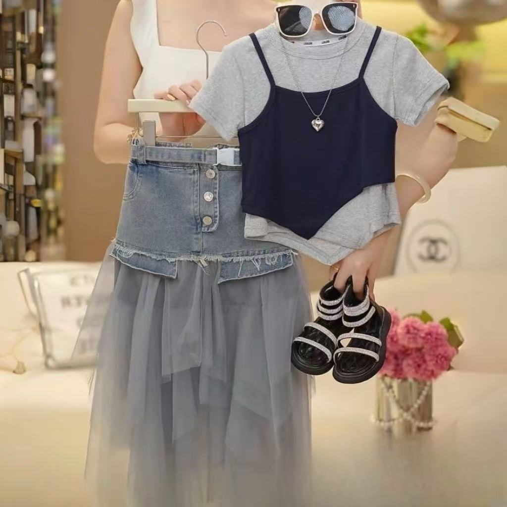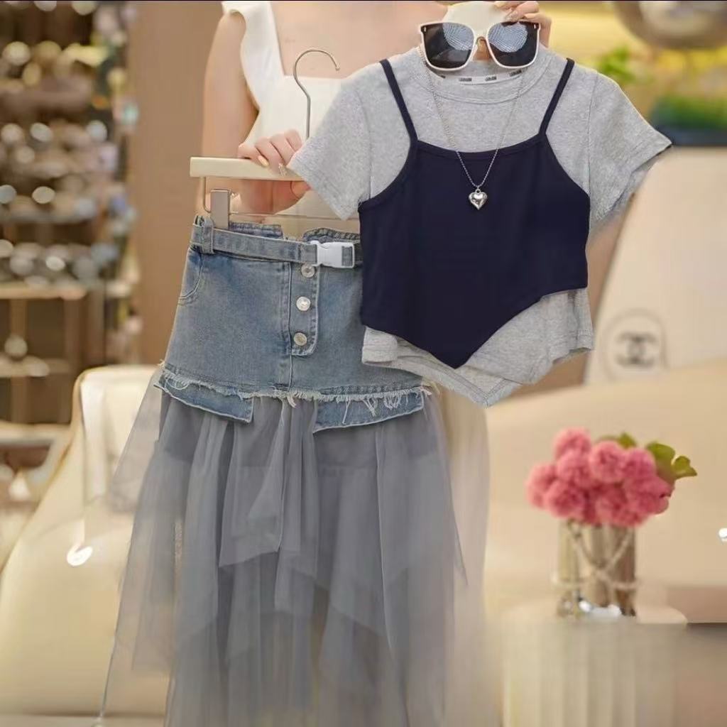 소녀 세트 2025 년 여름 서양식 새로운 도착 한국 스타일 짧은 소매 조끼 사이버 축하 스티칭 메쉬 데님 스커트