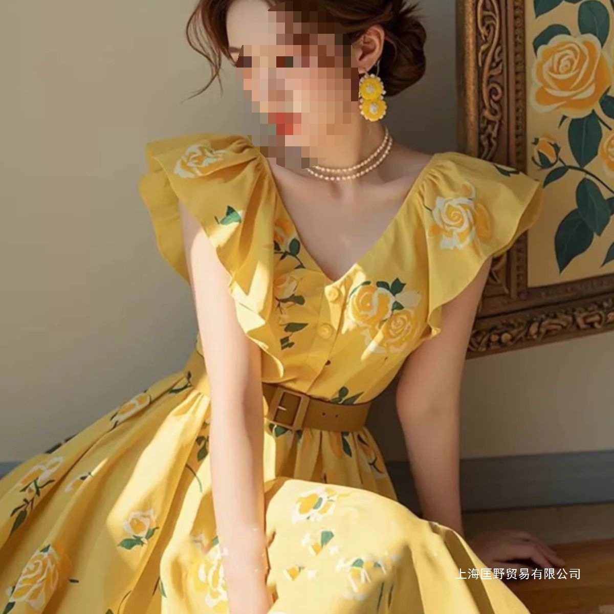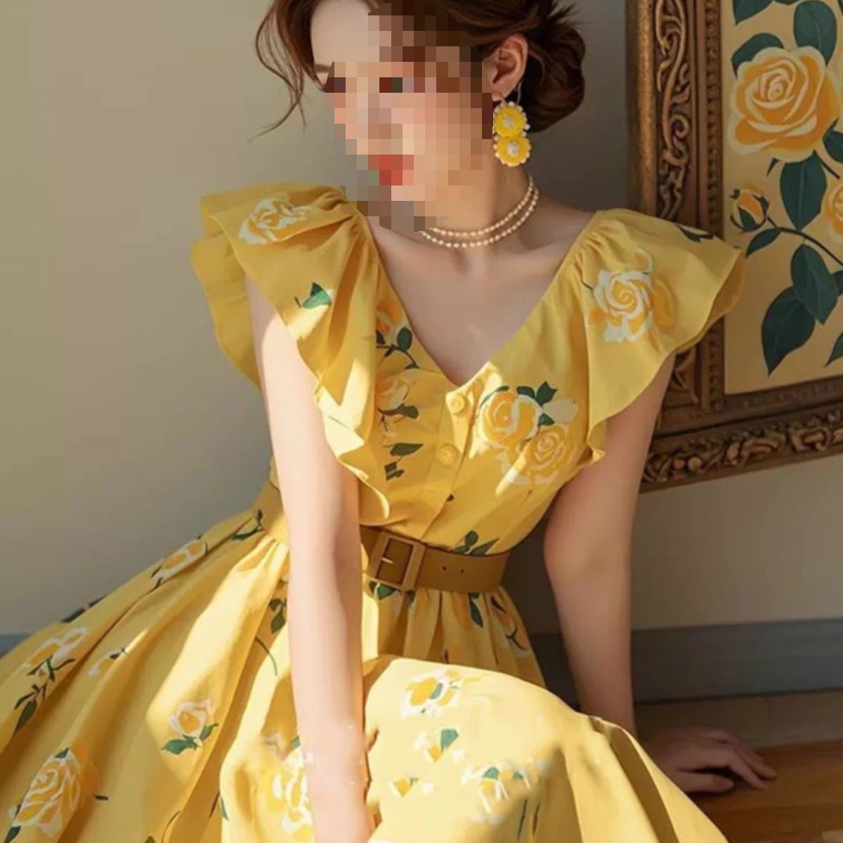 2025 새로운 여름 프랑스 기질 해변 여름 꽃 황혼 노란 장미 슬링 원피스 다른 사람