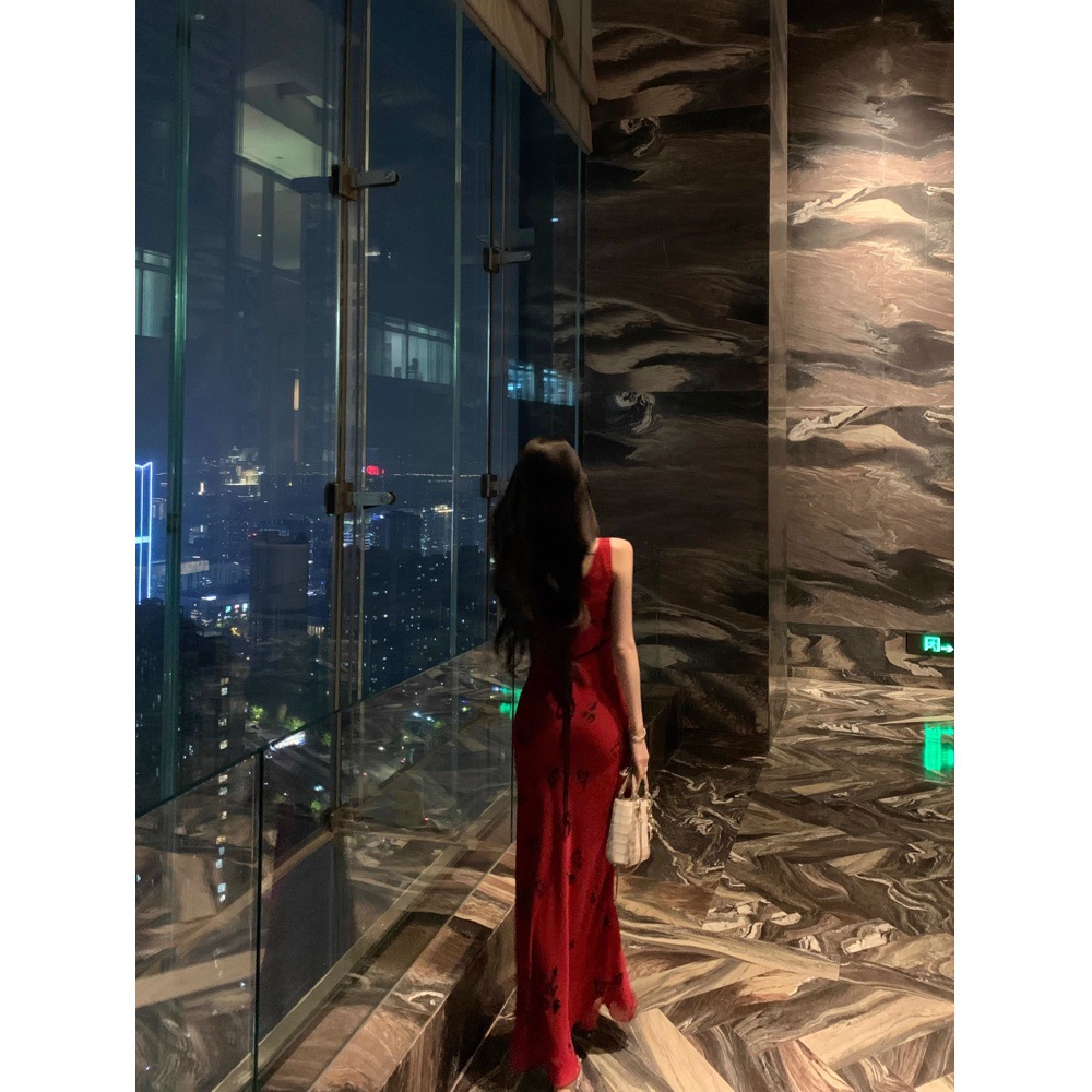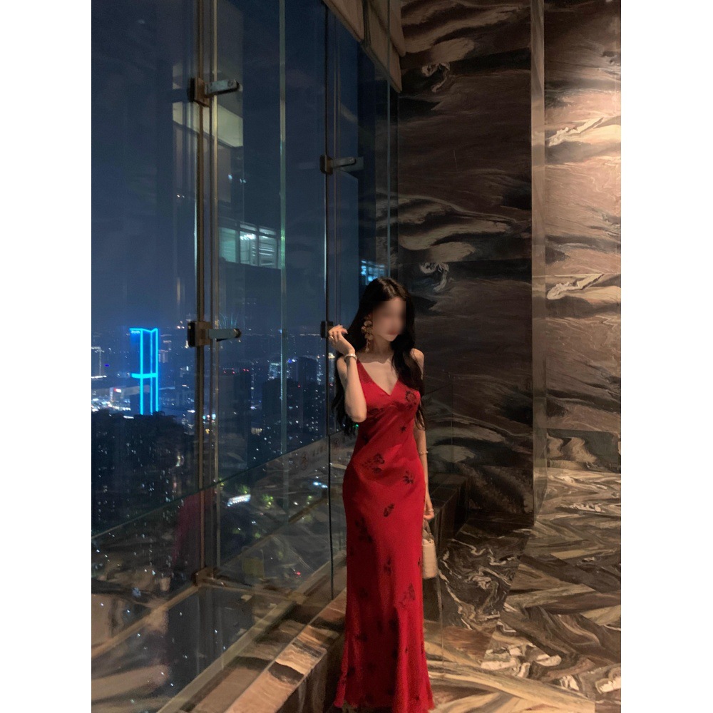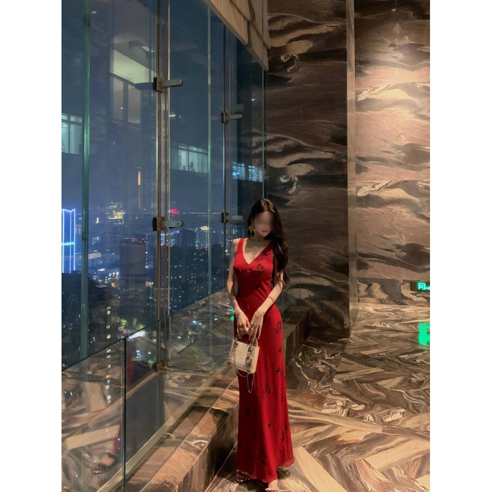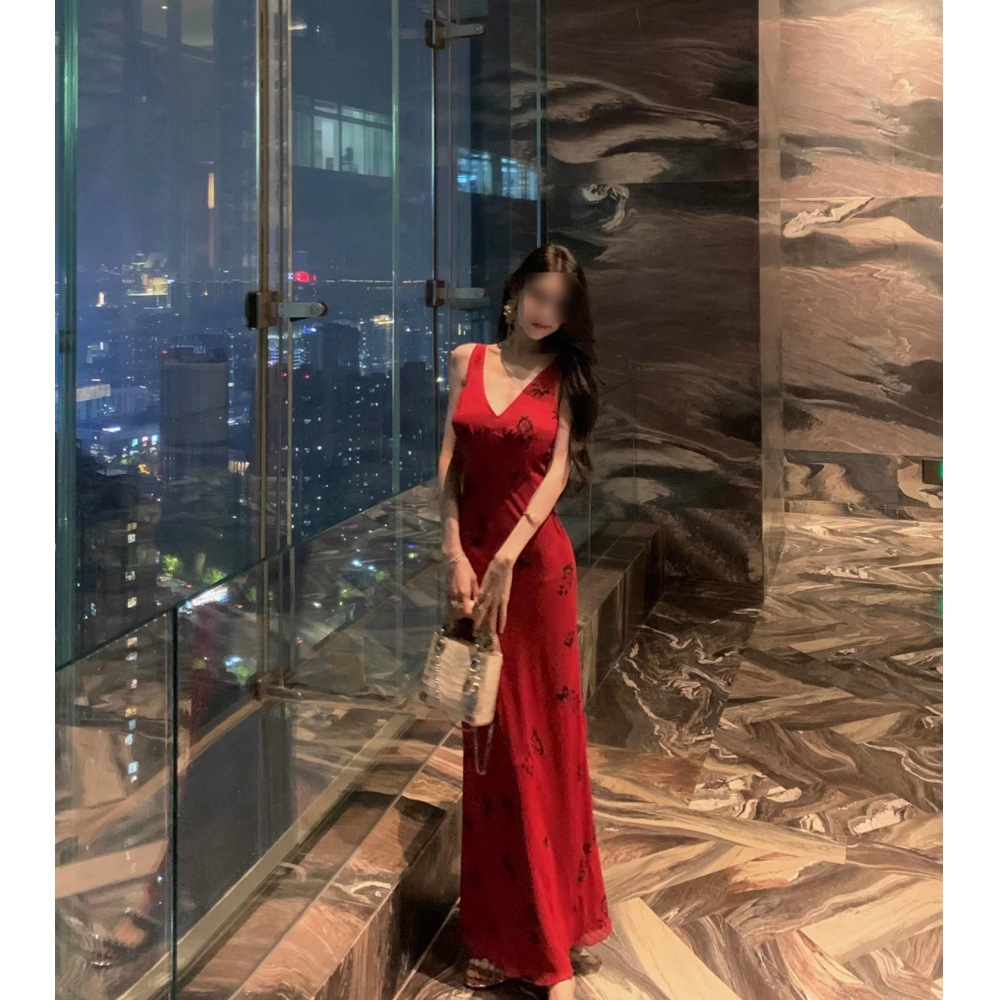 2025 온라인 상점 긴 원피스 깊은 V-넥 슬림 핏 원피스 여름 레드 원피스 해변 휴일 스타일 원피스스토어 가기
