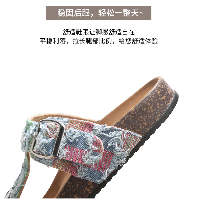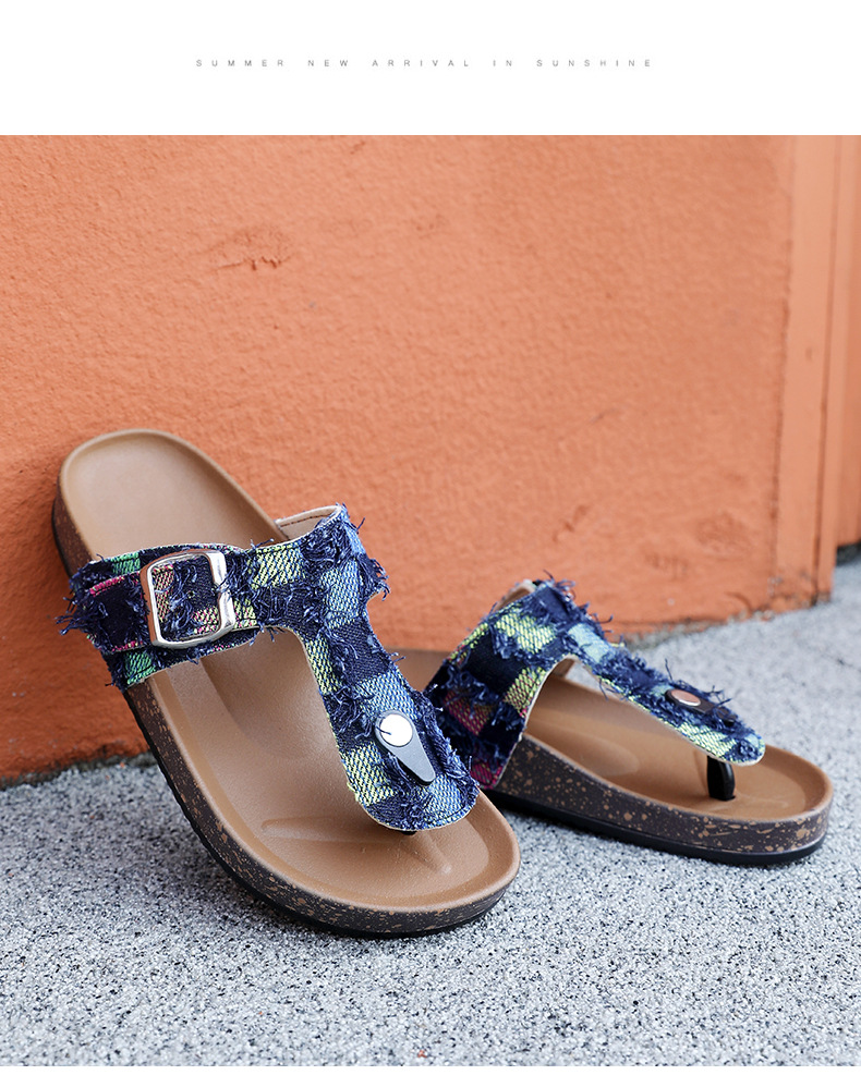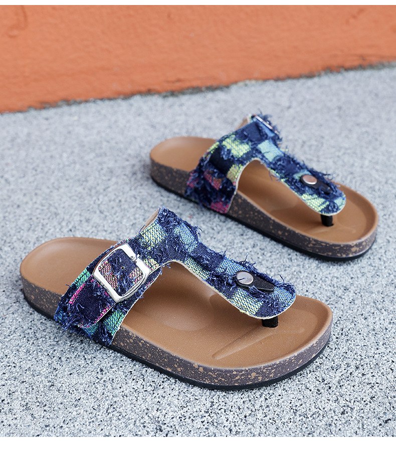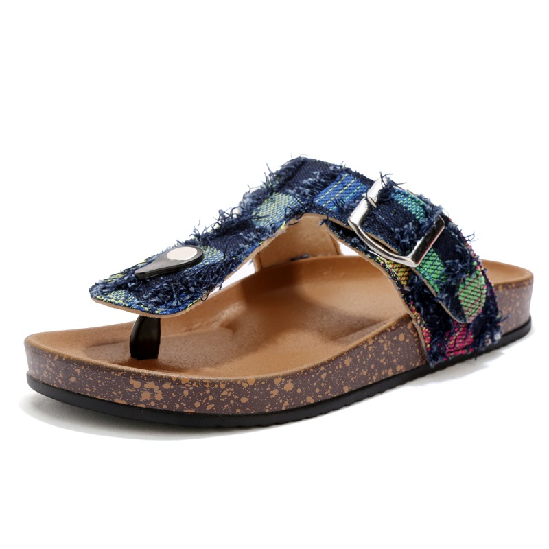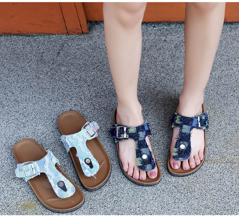 여름 헤링본 신발, 부드러운 밑창 플랫 슬리퍼, 헤링본 데님 여학생 비치 슬리퍼, 여성용 슬리퍼, 크로스보더