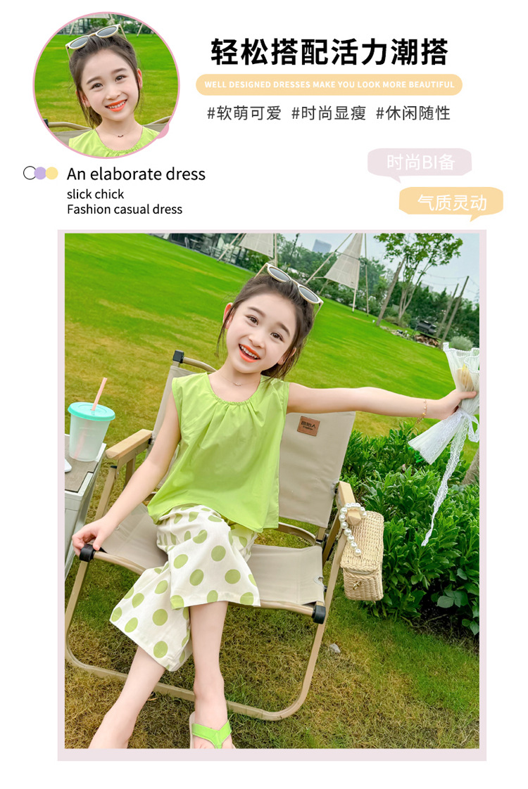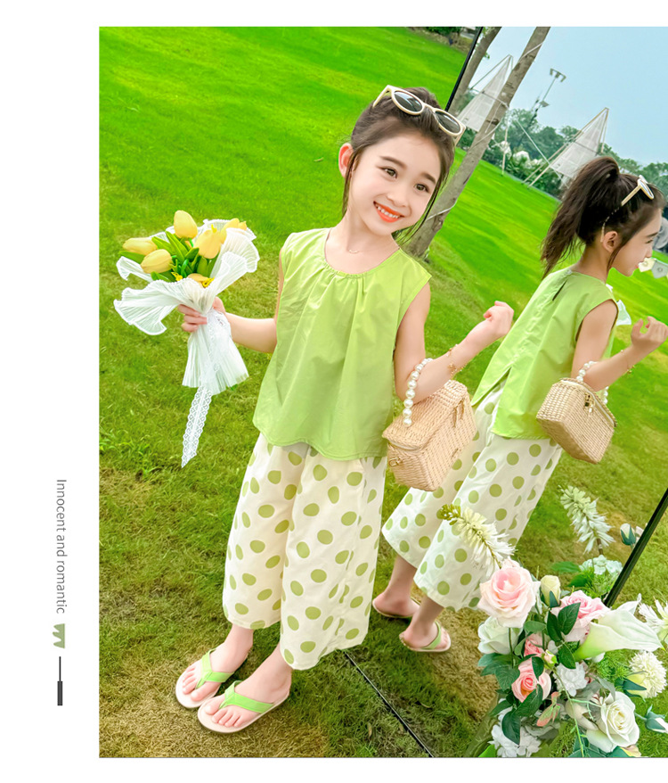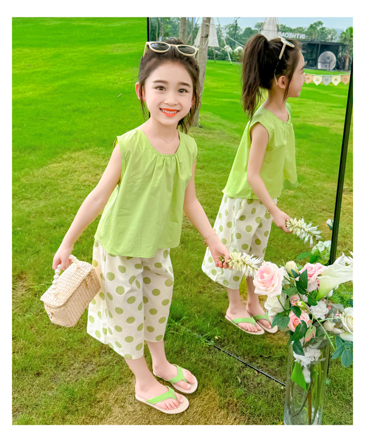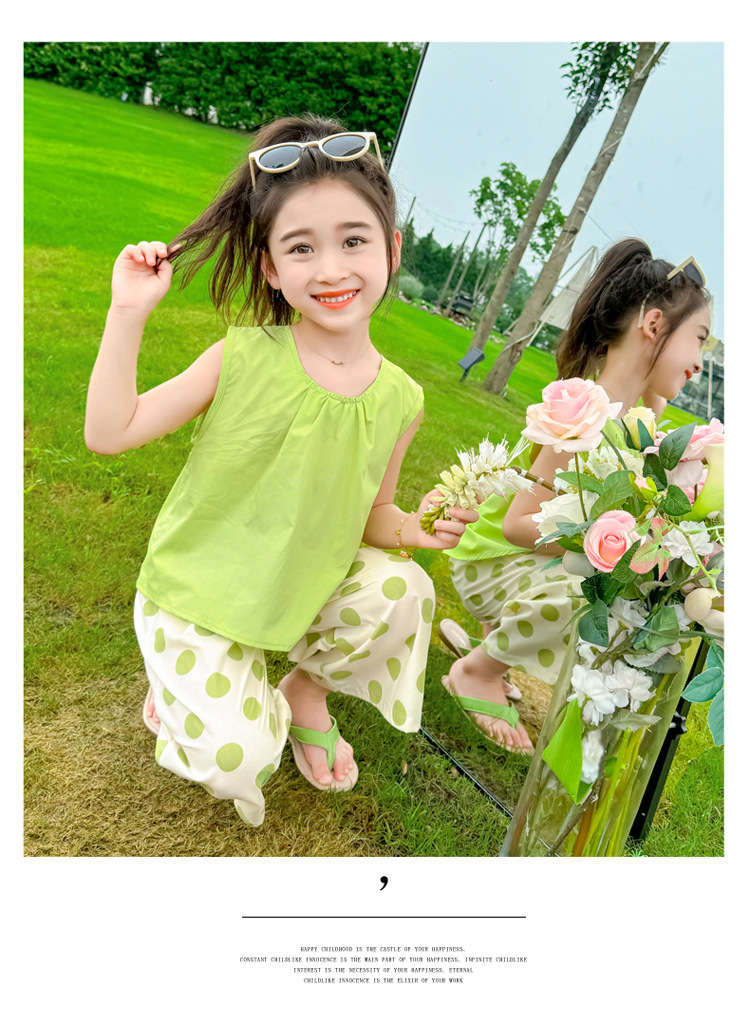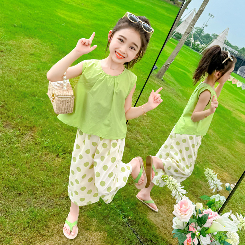 소녀 그린 닷 바지 세트 2025 여름 새로운 패션 소녀 세련된 투피스 세트 어린이 여름 원피스