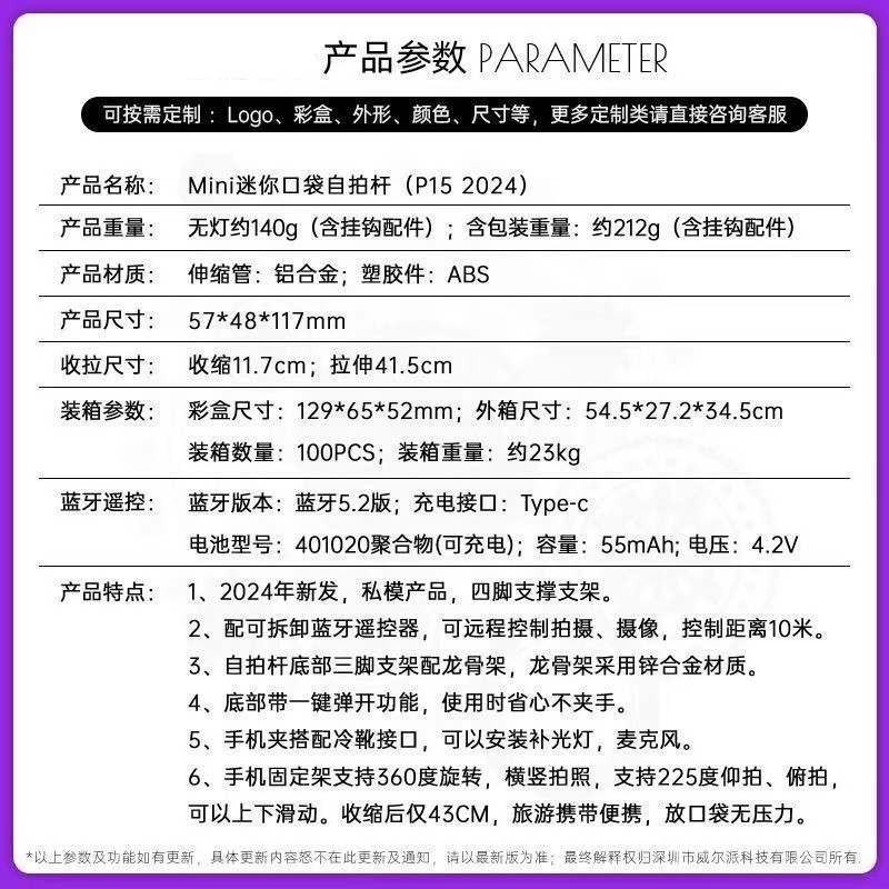 국경 폭발 휴대용 P15MINI 전화 셀카 스틱 마그네틱 블루투스 원격 제어 원격 전화 카메라 브래킷스토어 가기