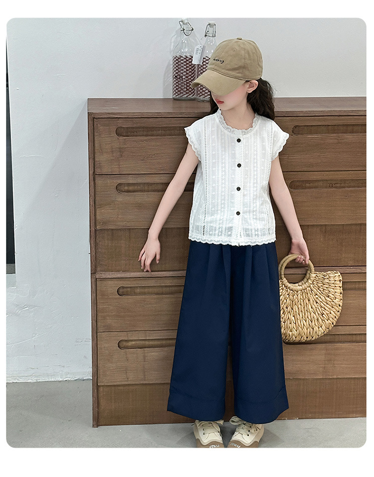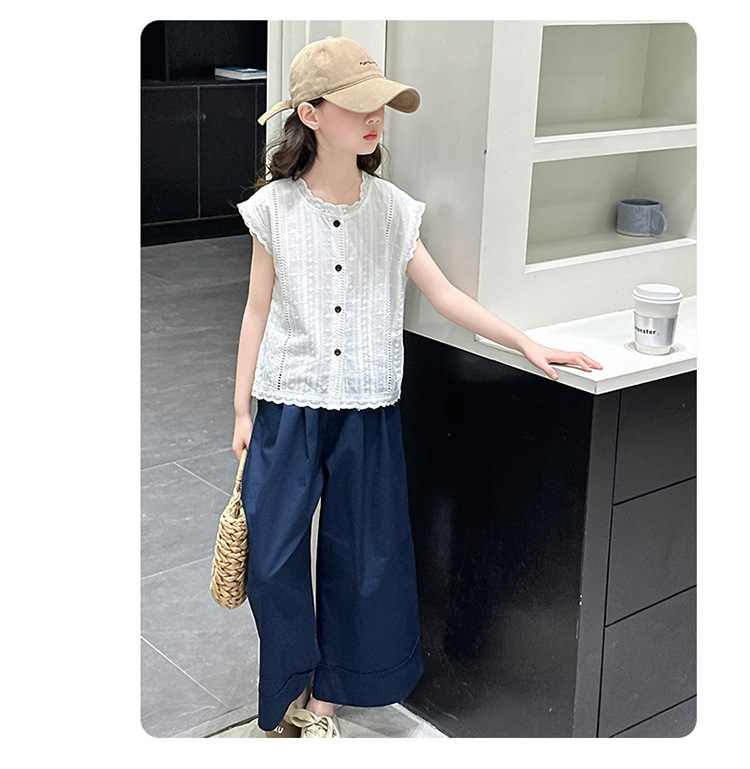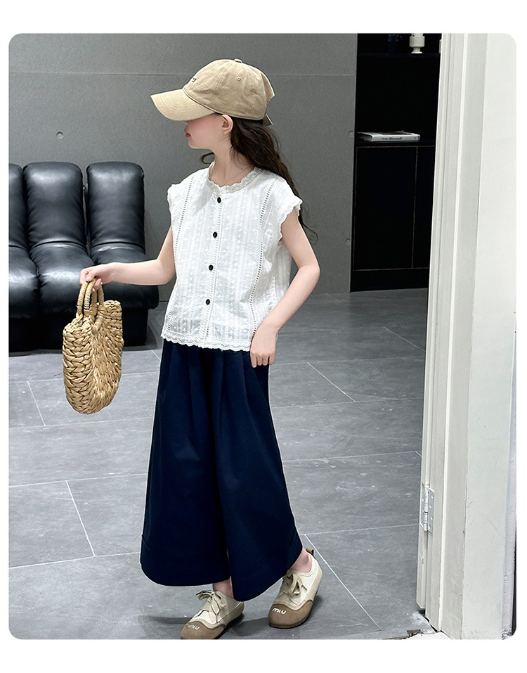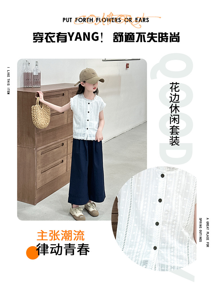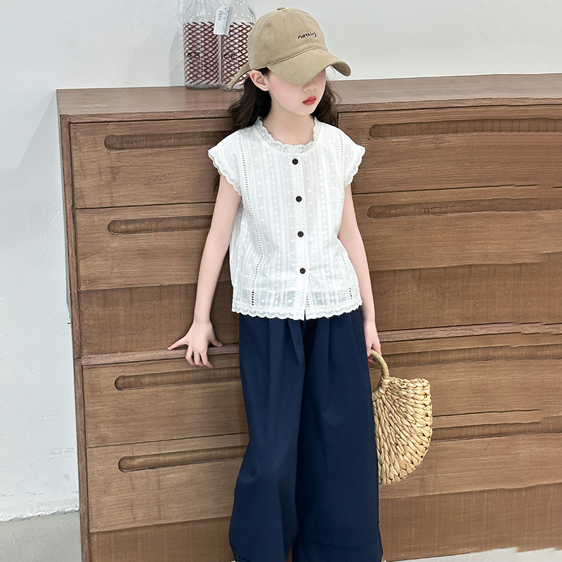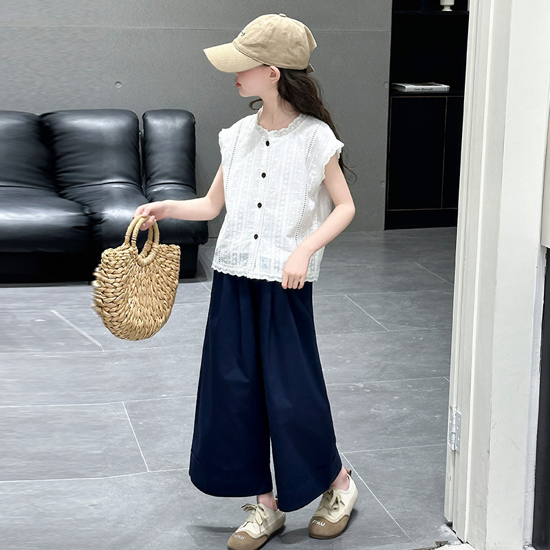 소녀 세트 여름 2025 새로운 어린이 패션 우아한 중공 레이스 조끼 투피스 소녀의 여름 패션