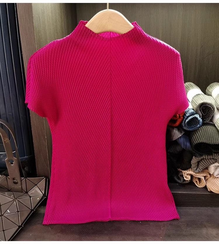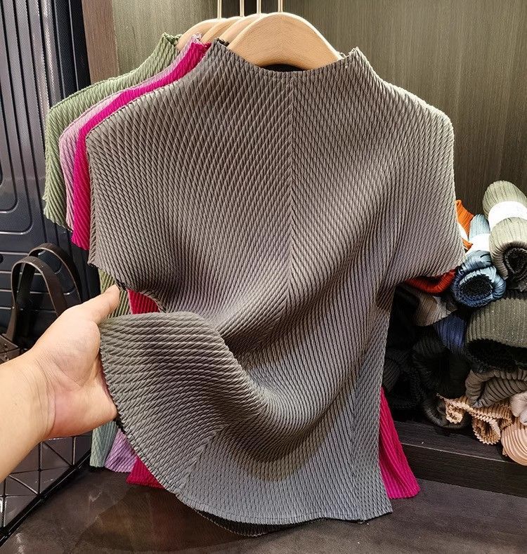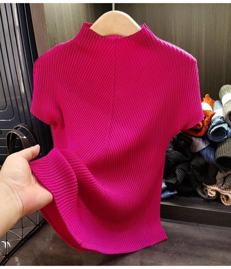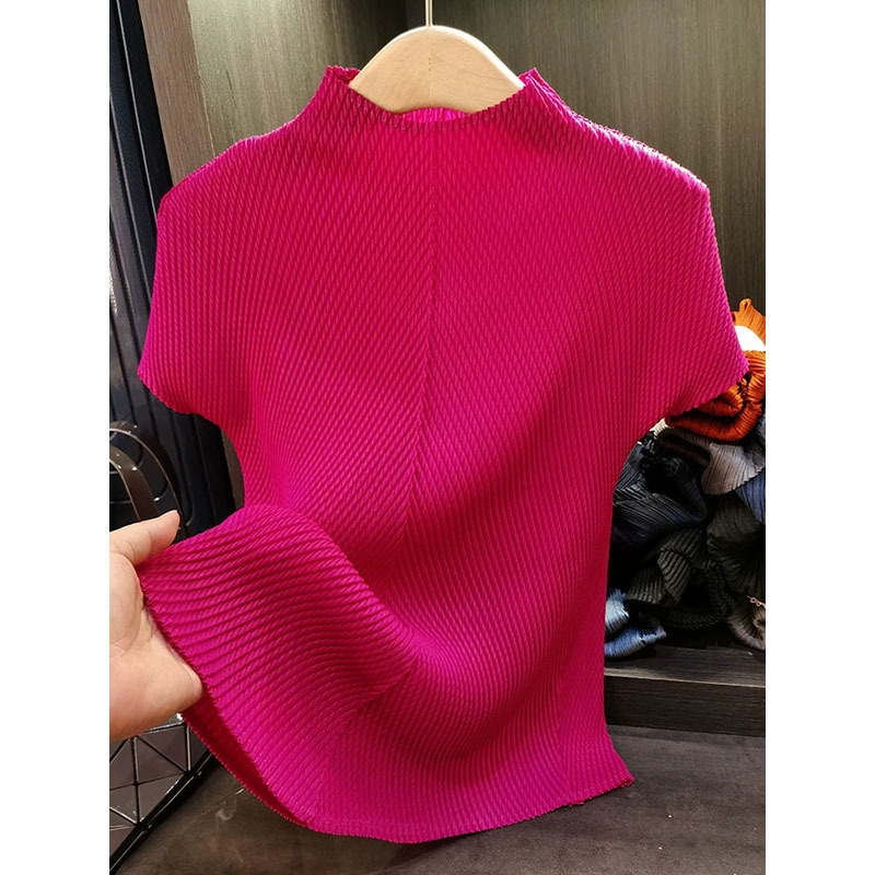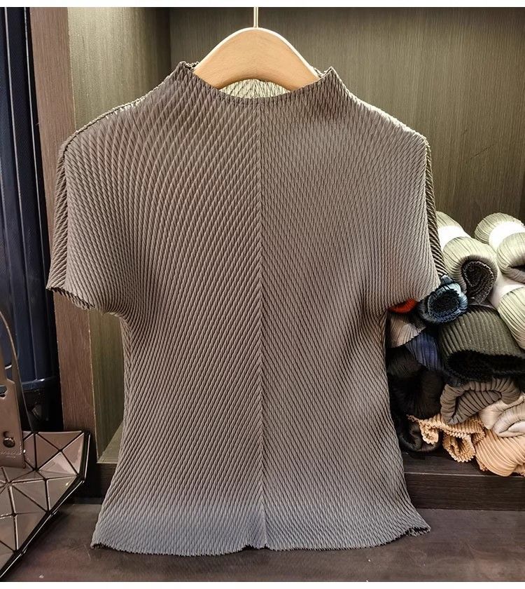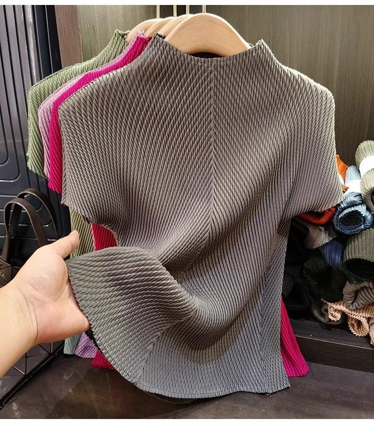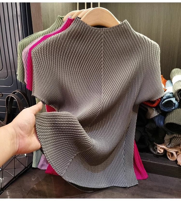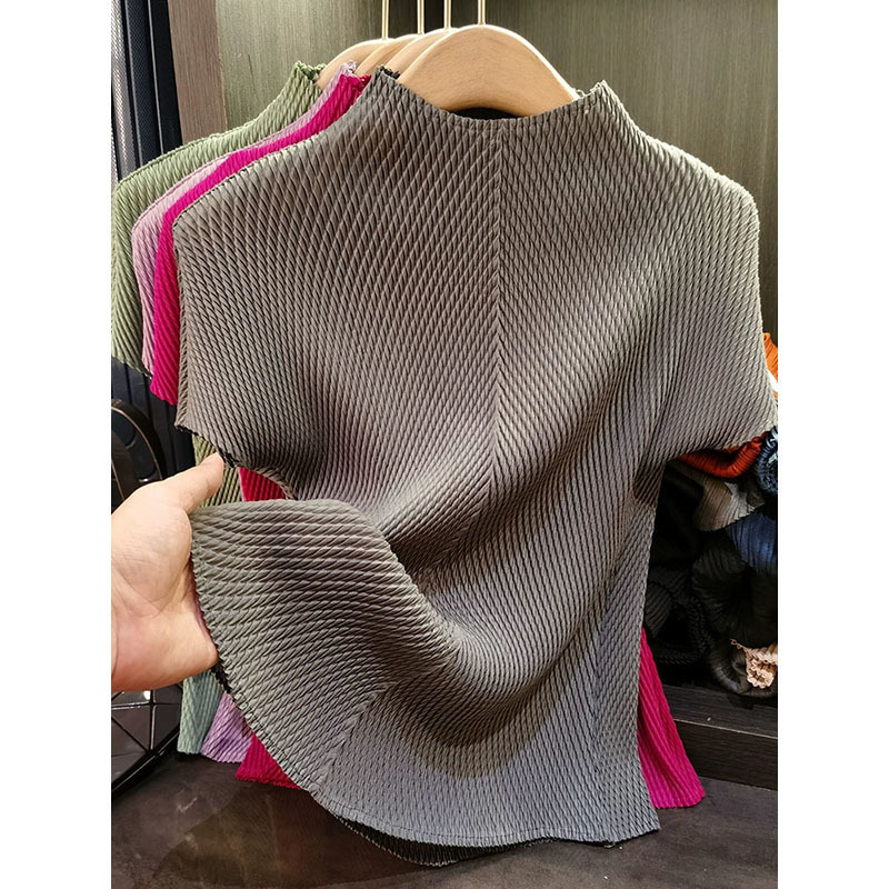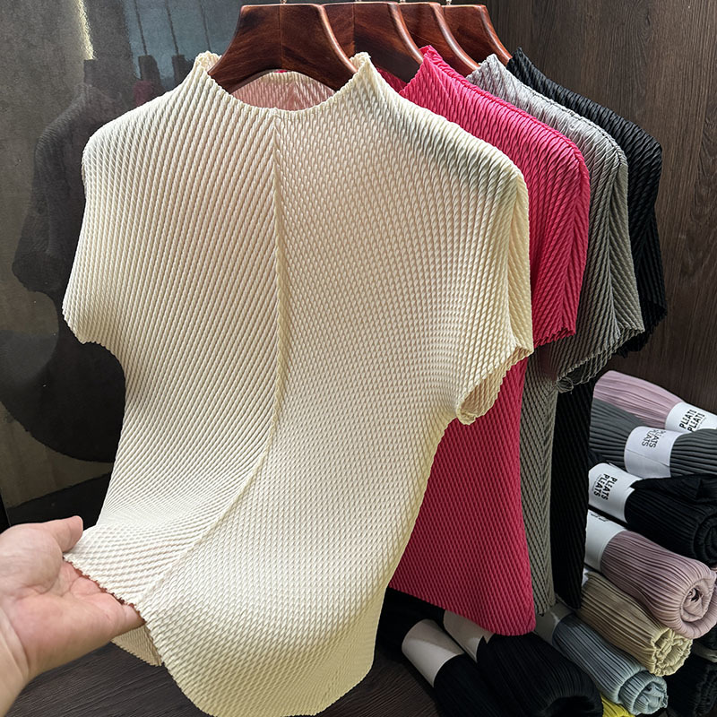 미야케 스탠드 칼라 단색 드래곤 스케일 주름 짧은 소매 티셔츠 하이 엔드 올 매치 슬림 외국 스타일