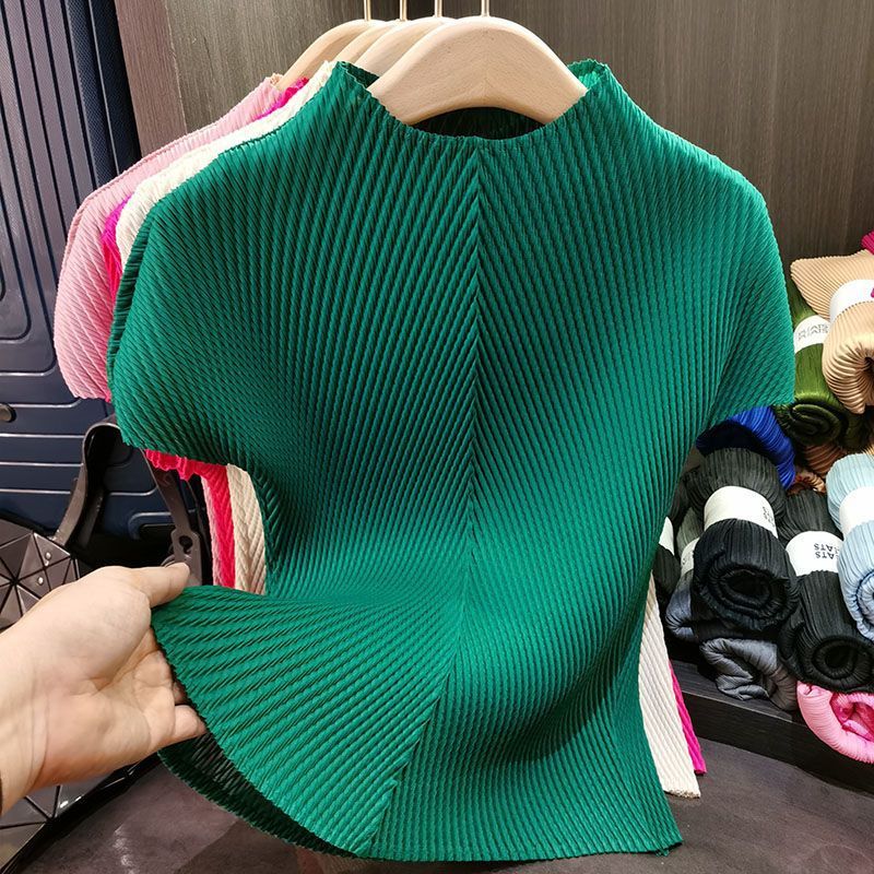 미야케 스탠드 칼라 단색 드래곤 스케일 주름 짧은 소매 티셔츠 하이 엔드 올 매치 슬림 외국 스타일스토어 가기