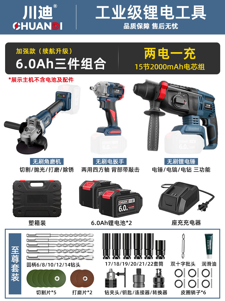 • 전동 해머 + 앵글 그라인더 + 전동 드릴 [15섹션 6.0Ah] 배터리 2개 및 충전기 1개 + 액세서리 선물 팩