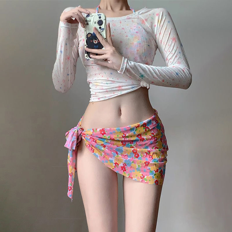 꽃 신선한 컬러 인쇄 된 플리츠 비키니 스틸 브래킷 작은 가슴 모임 온천 해변 휴일 수영복 여성