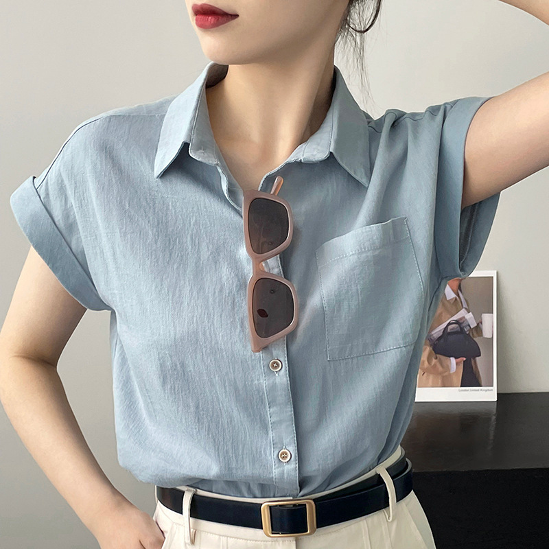 프랑스 통근 짧은 소매 셔츠 여성의 여름 새로운 틈새 디자인 캐주얼 솔리드 컬러 쉬폰 카디건 탑스토어 가기