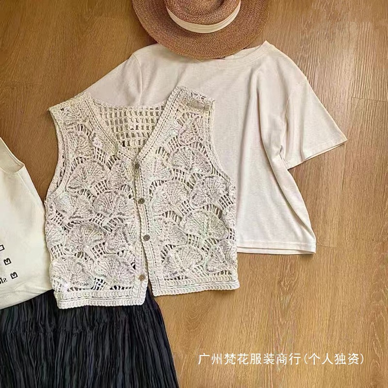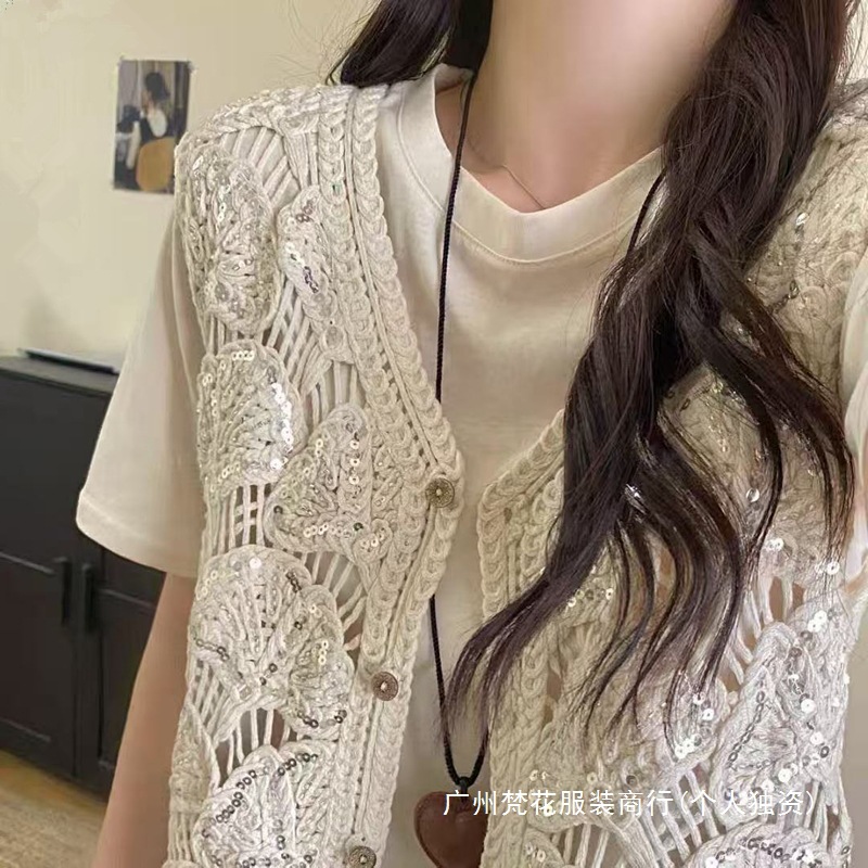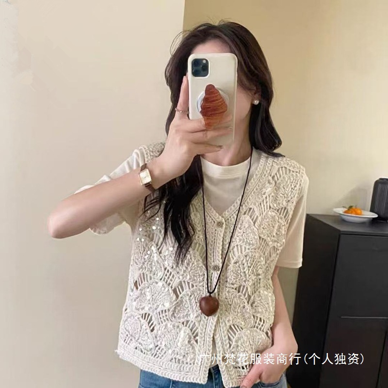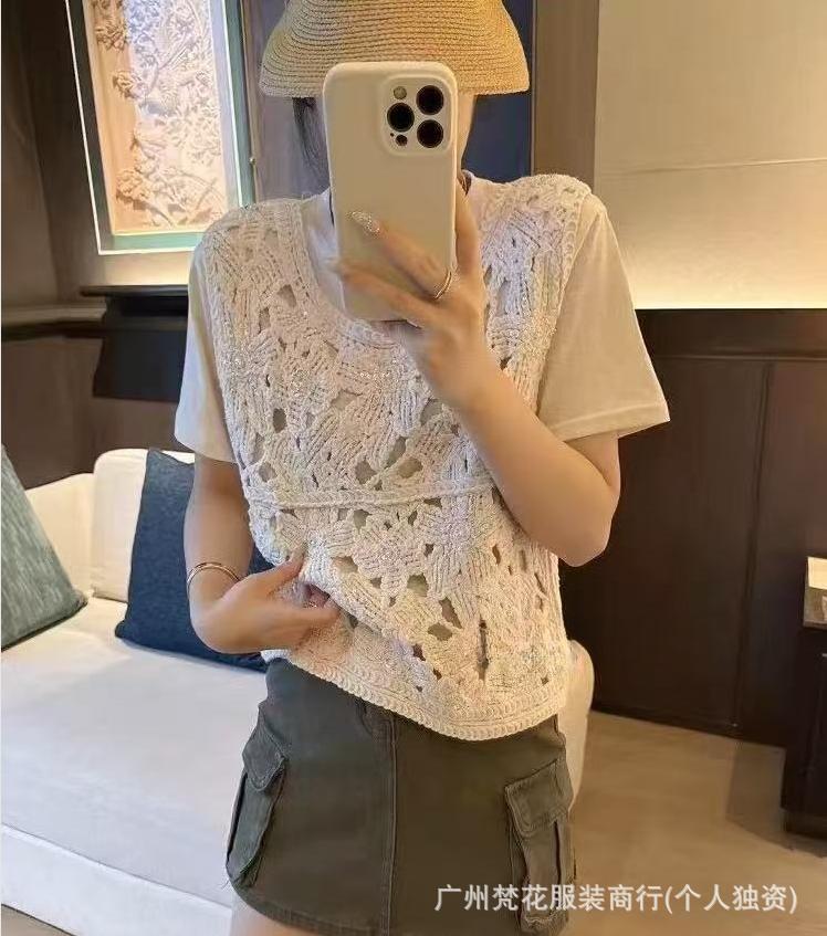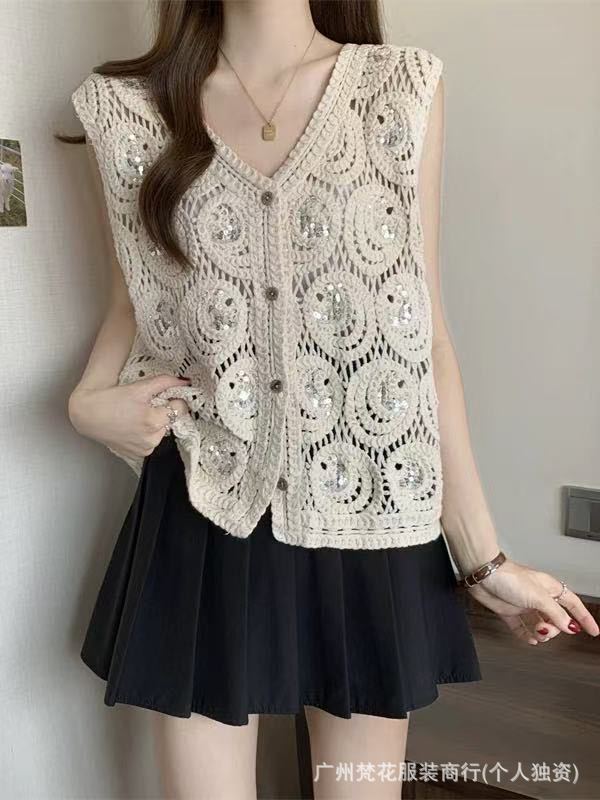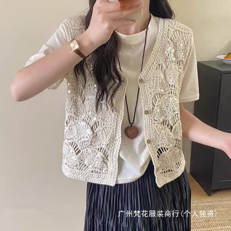 새로운 빈티지 할로우 아웃 후크 아웃 착용 헤비 듀티 니트 조끼 카디건 여자 올 매치 V-넥 쇼트 조끼 여름