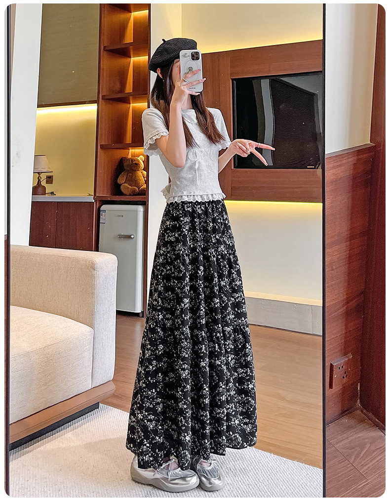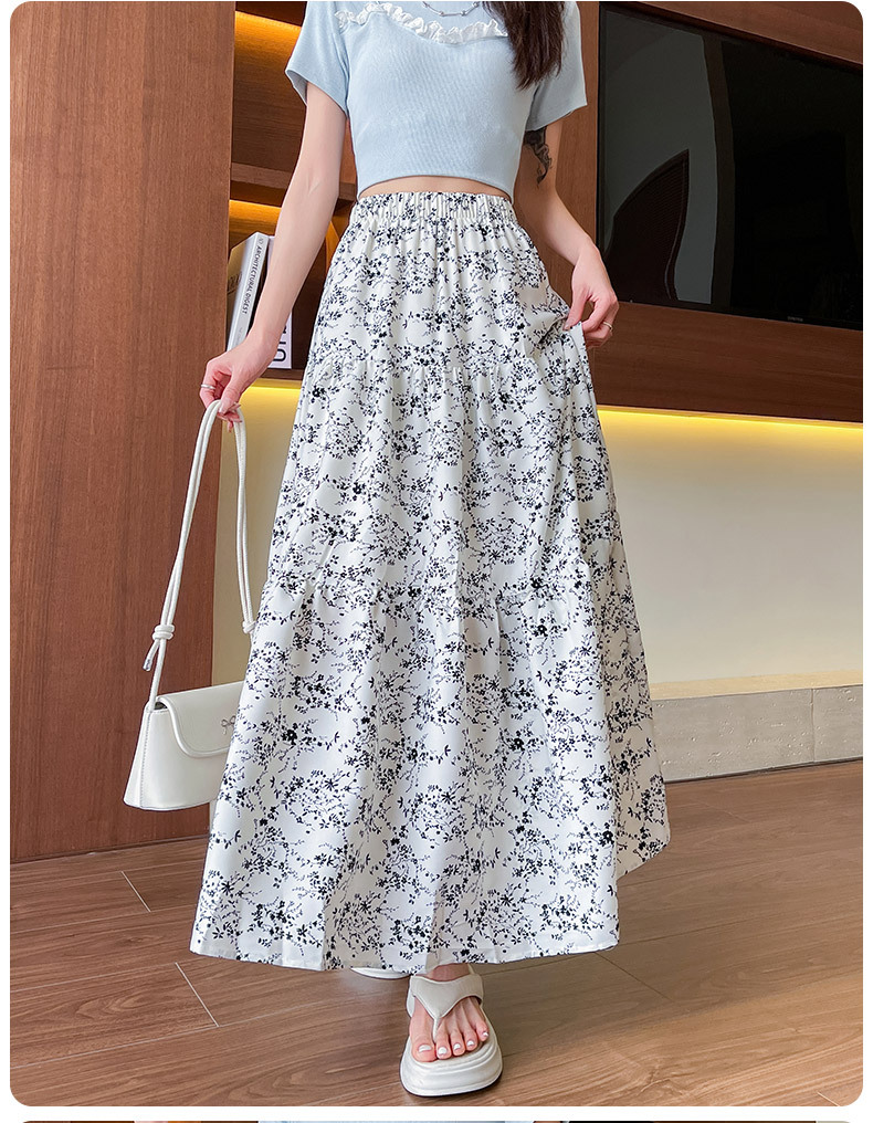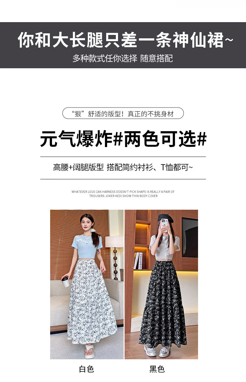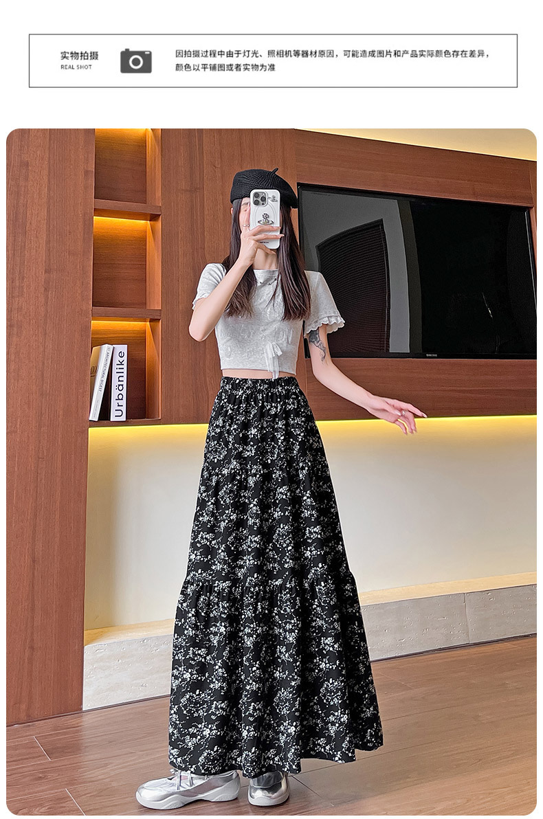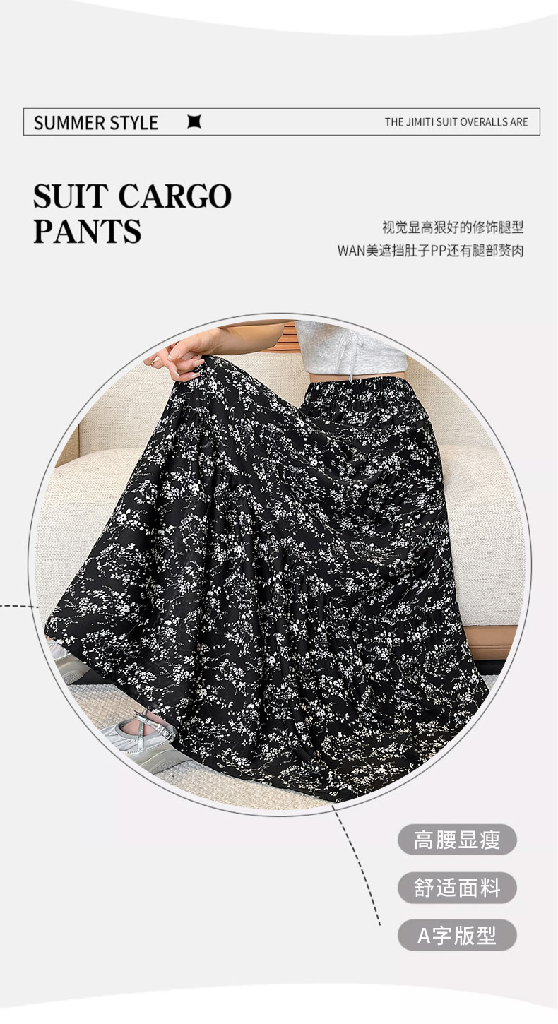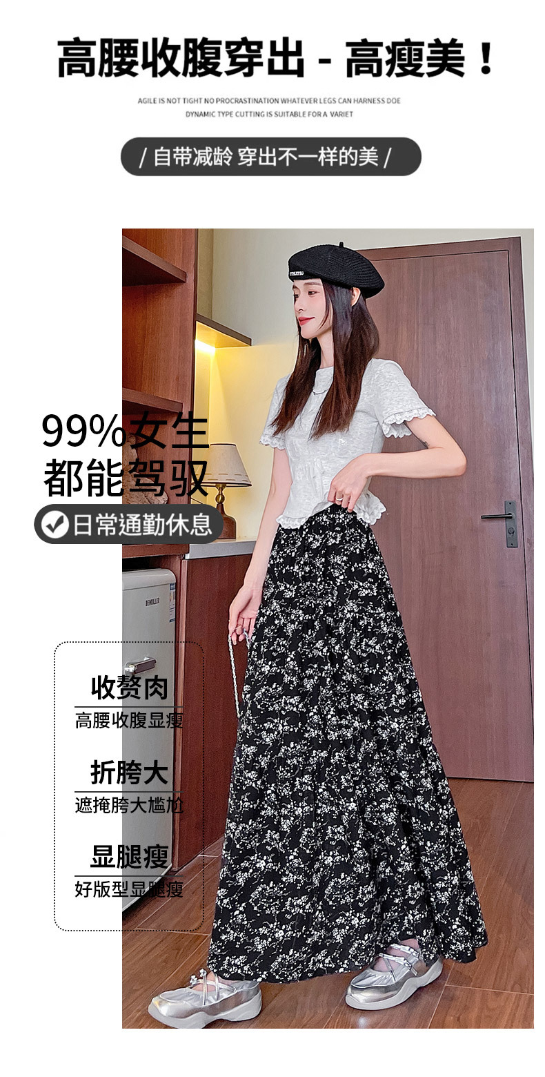 꽃 치마 여성의 새로운 봄과 여름 검은 중간 길이의 높은 허리 레트로 슬리밍 고관절을 덮고있는 대형 A 라인 우산 치마스토어 가기