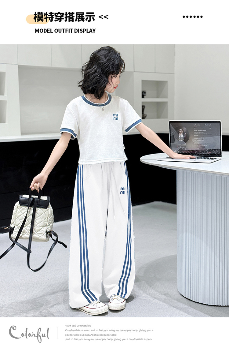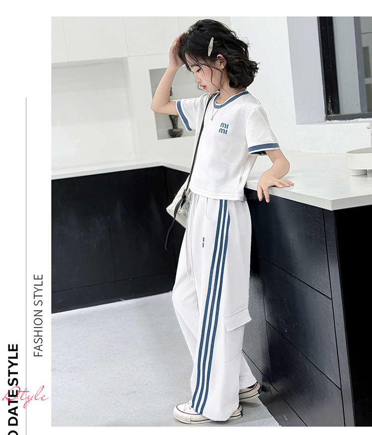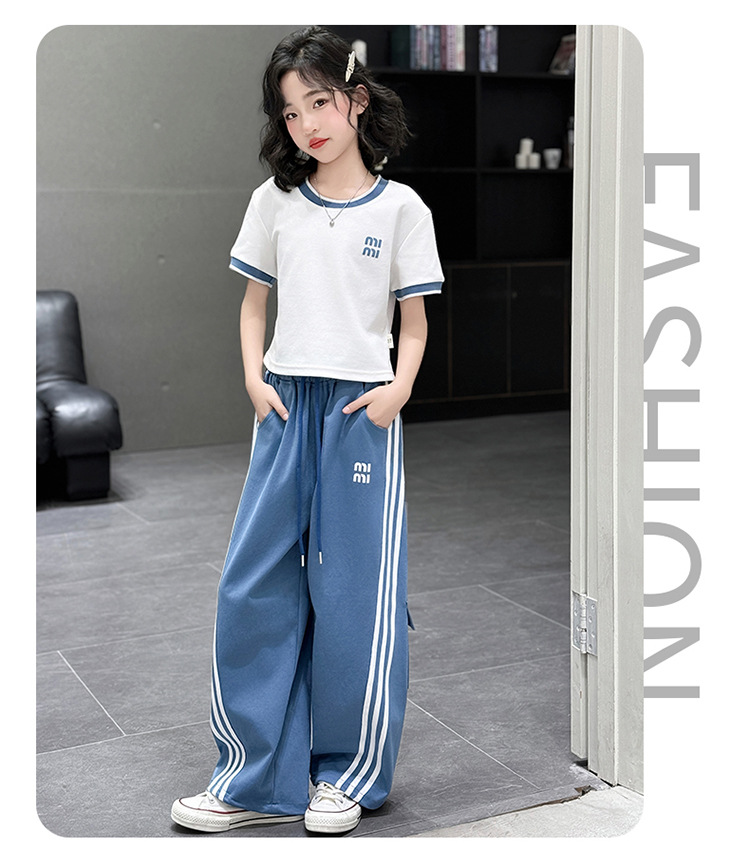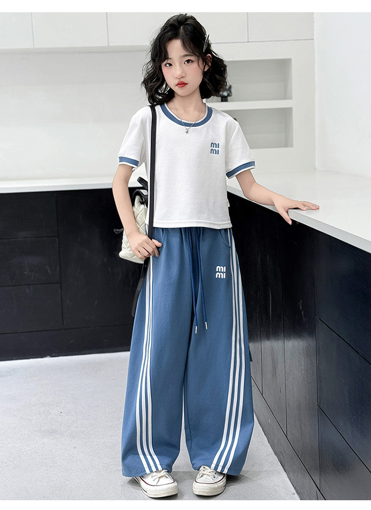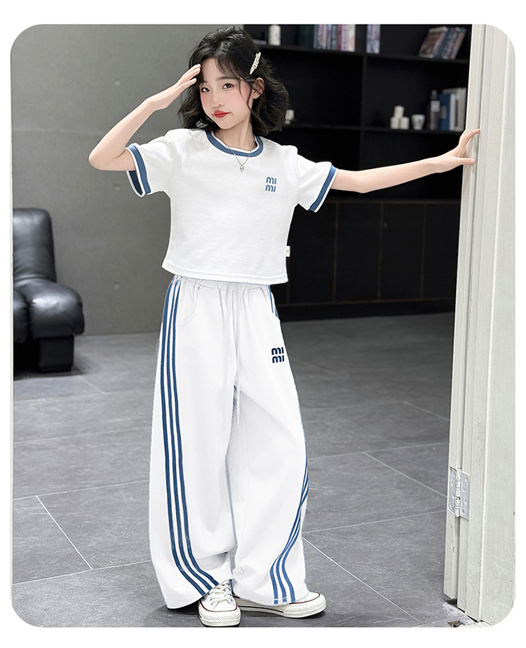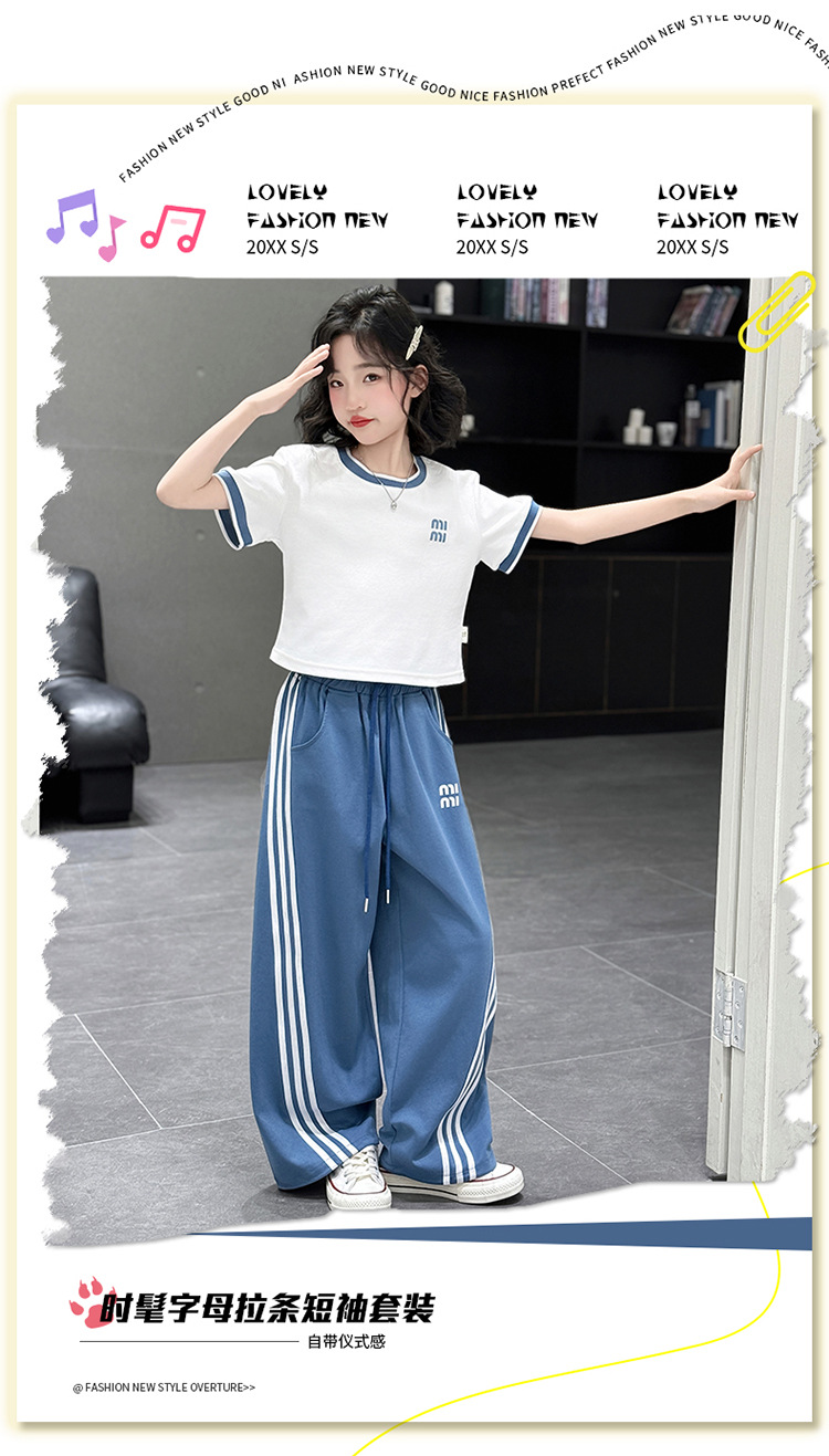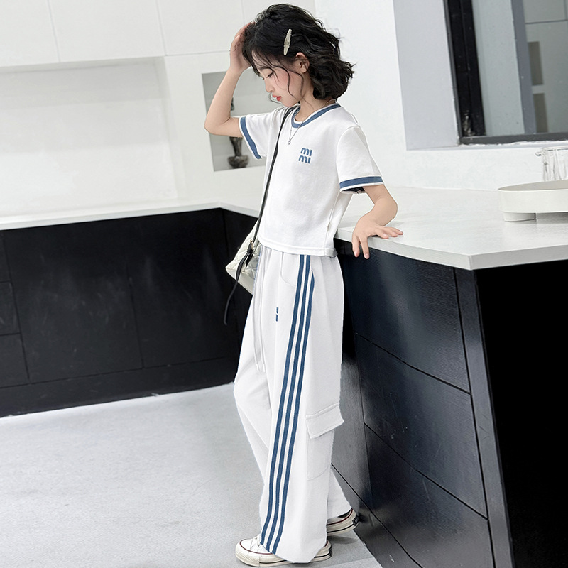 여자 스포츠웨어 세트 여름 2025 새로운 cuhk 어린이 대학 스타일의 편지 티셔츠는 넓은 다리 바지를 캐주얼