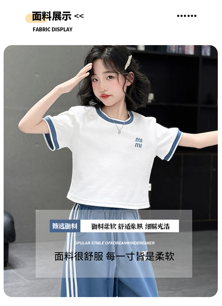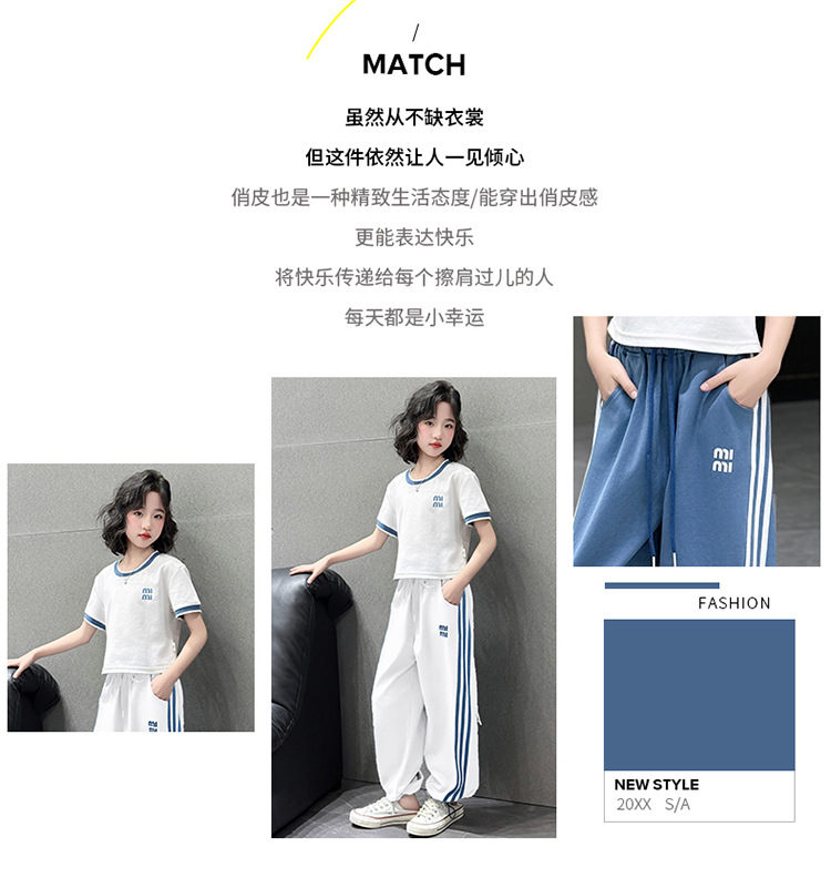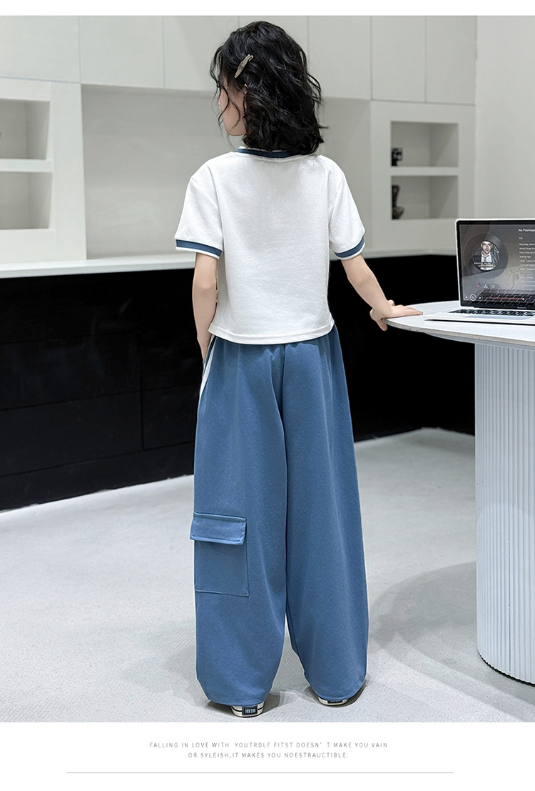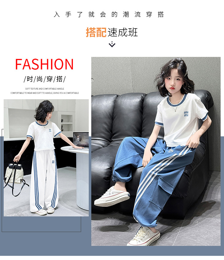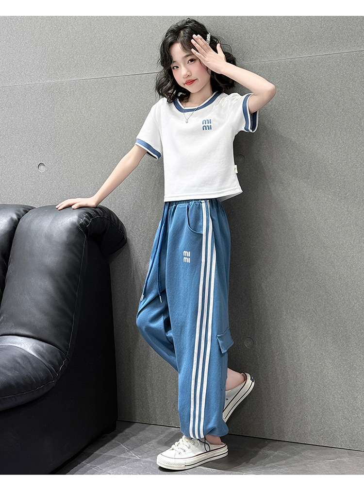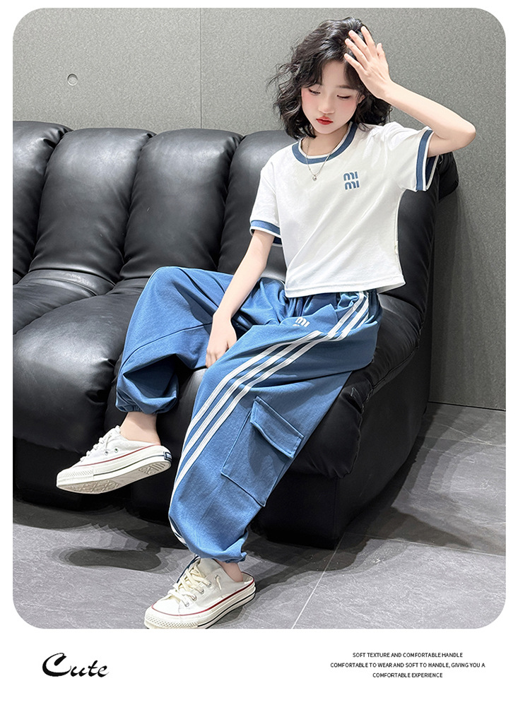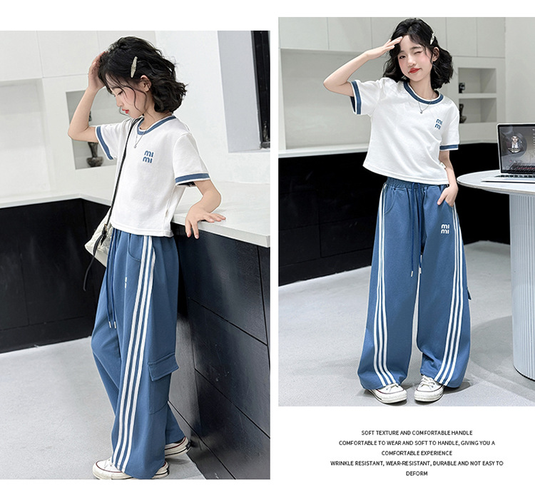 여자 스포츠웨어 세트 여름 2025 새로운 cuhk 어린이 대학 스타일의 편지 티셔츠는 넓은 다리 바지를 캐주얼