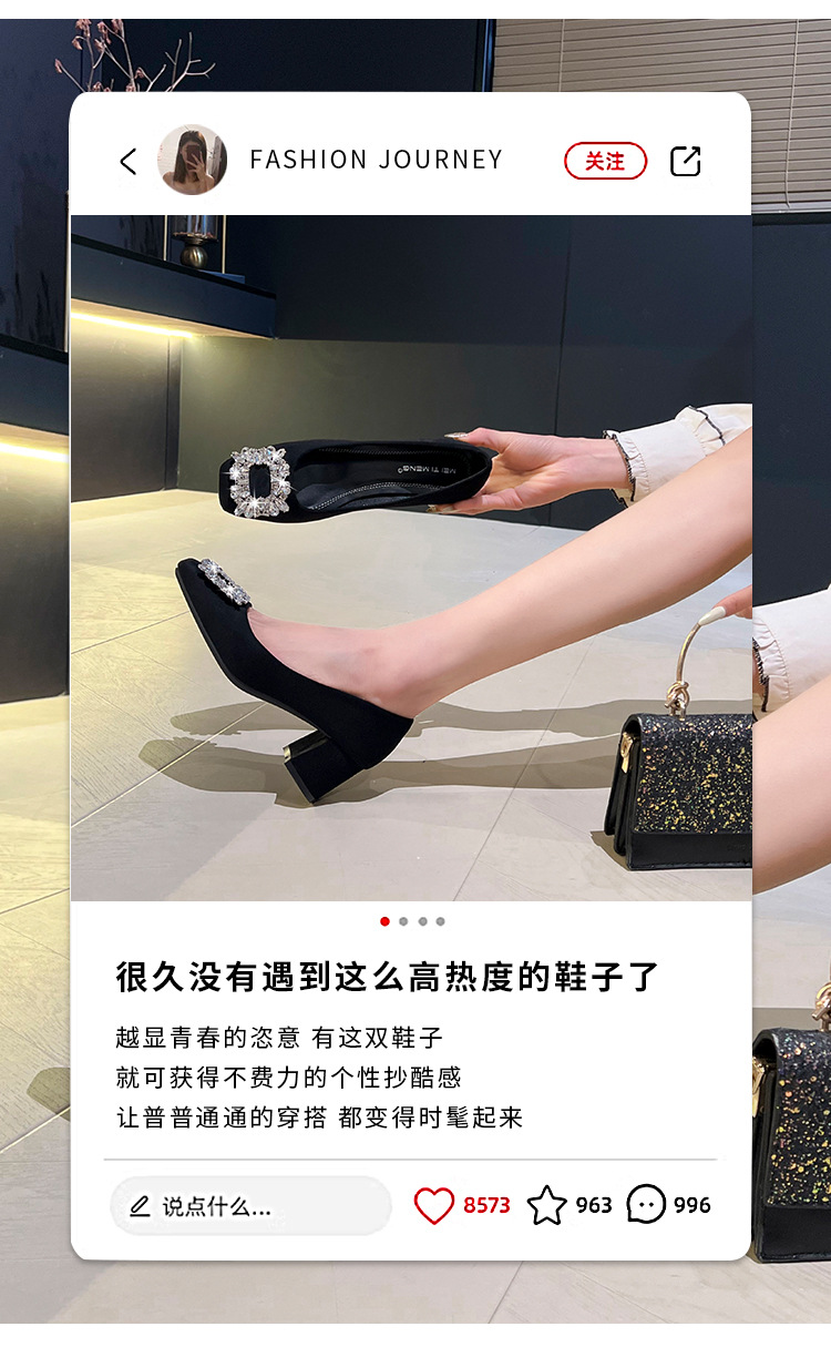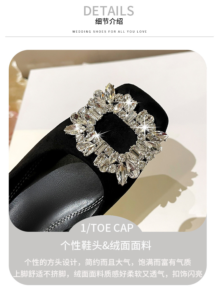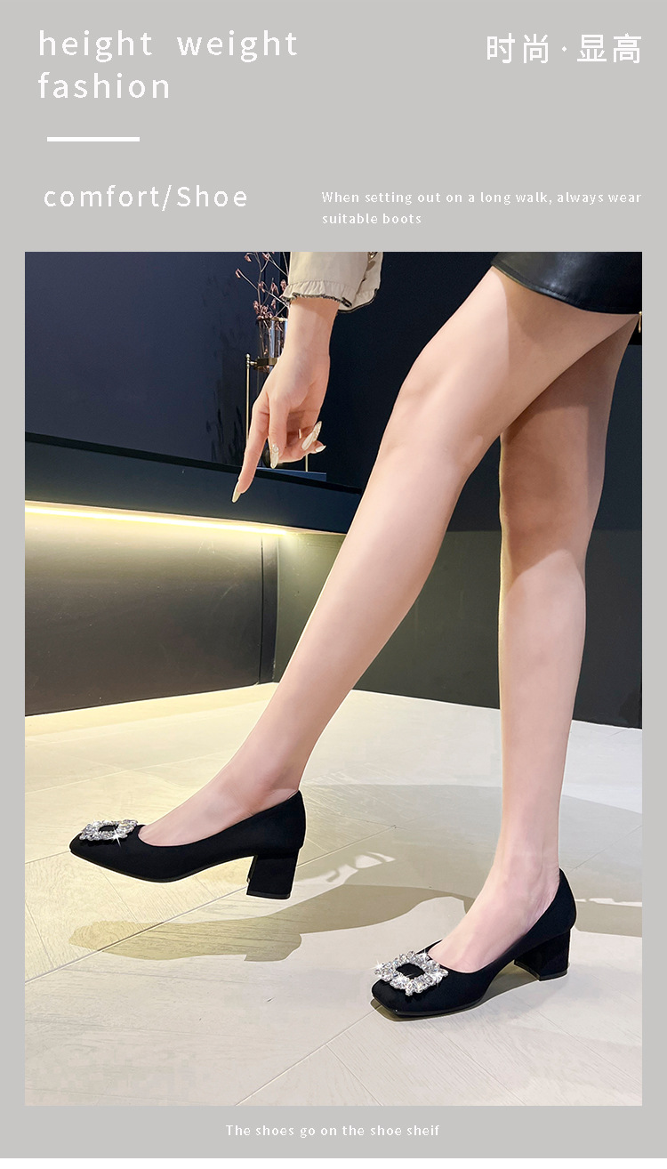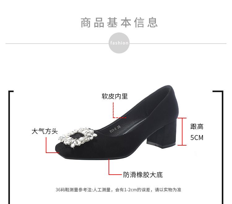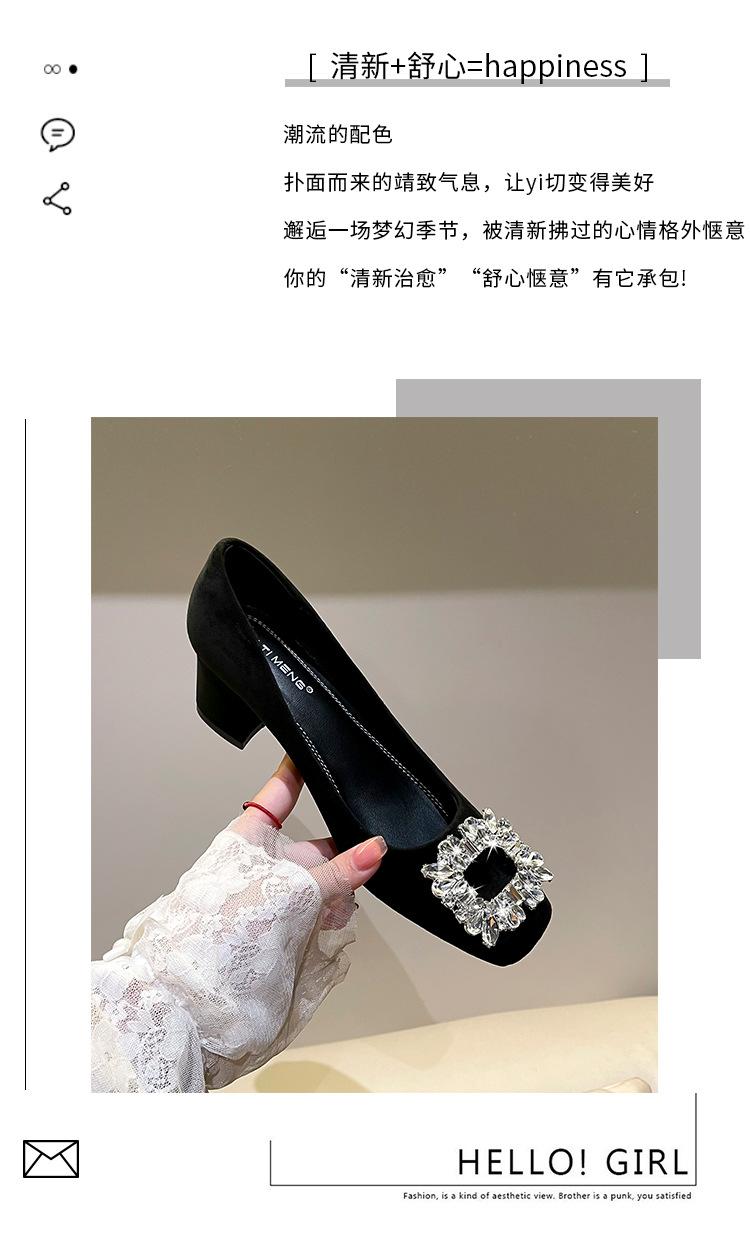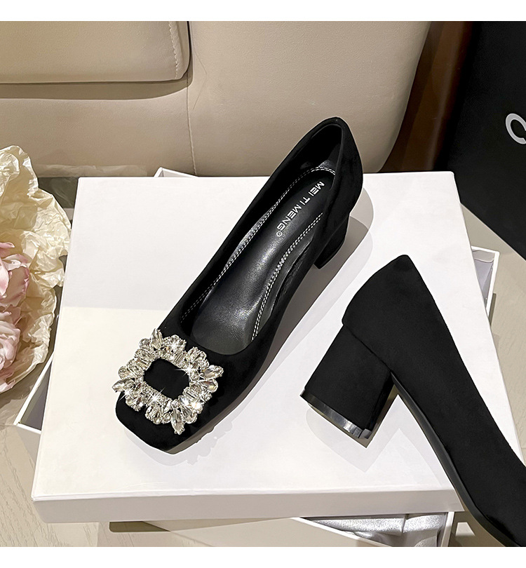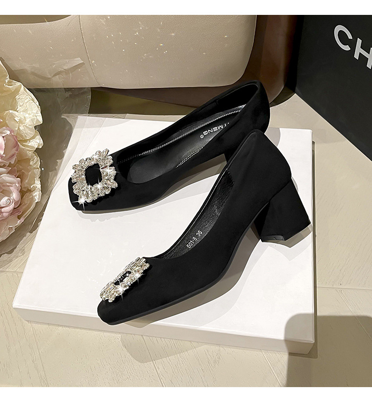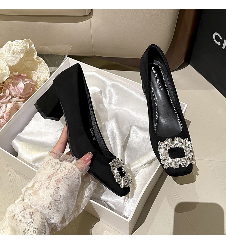 블랙 스웨이드 통근 하이힐 여성 2025 년 봄과 가을 새 광장 발가락 두꺼운 힐 얕은 입 라인스톤 전문 프랑스 싱글 신발스토어 가기