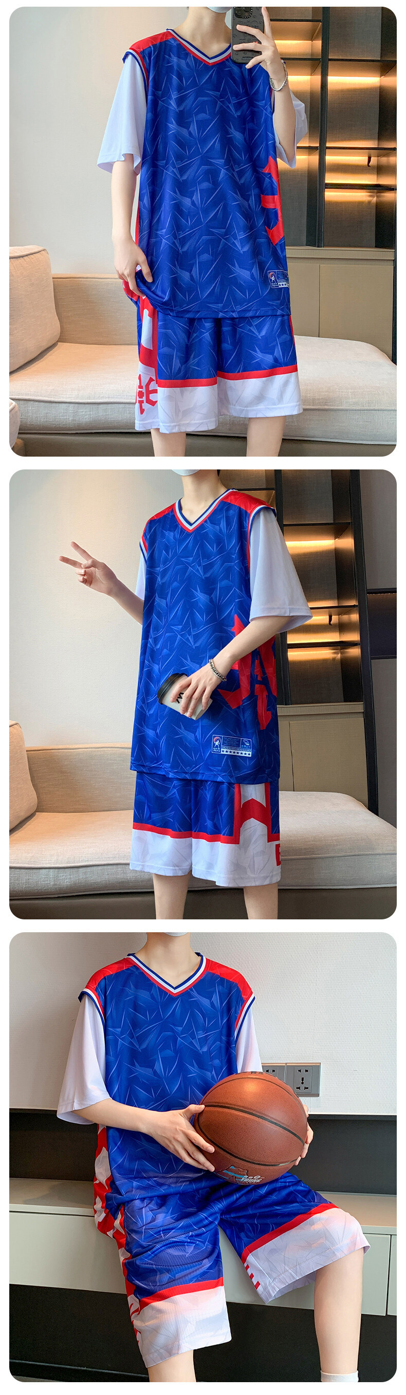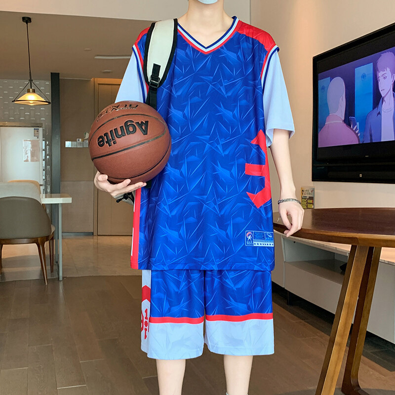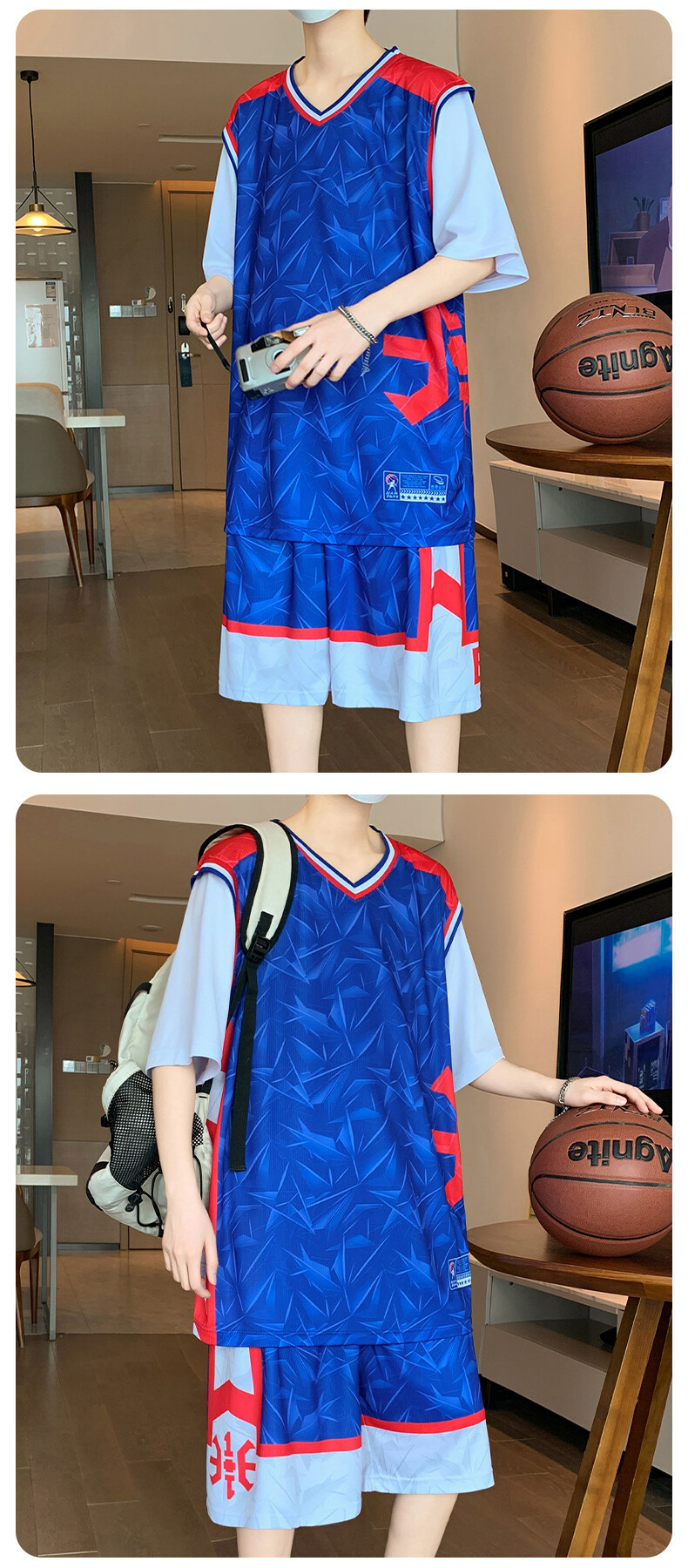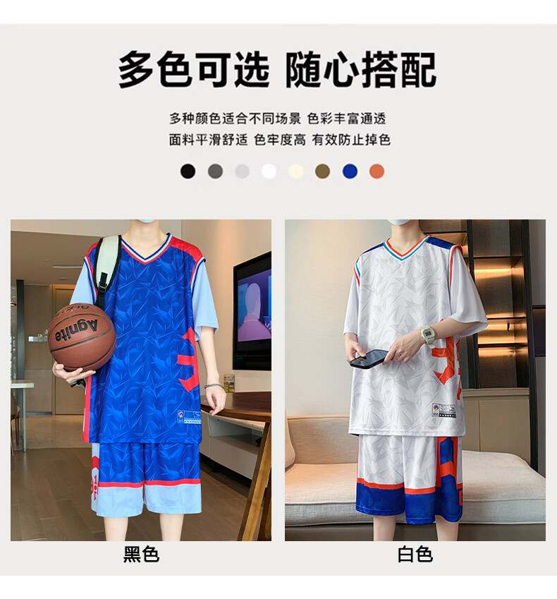 청소년 레저 스포츠 세트 남자 여름 아이스 실크 빠른 건조 농구 세트 학생 가짜 투피스 티셔츠 반바지 저지스토어 가기