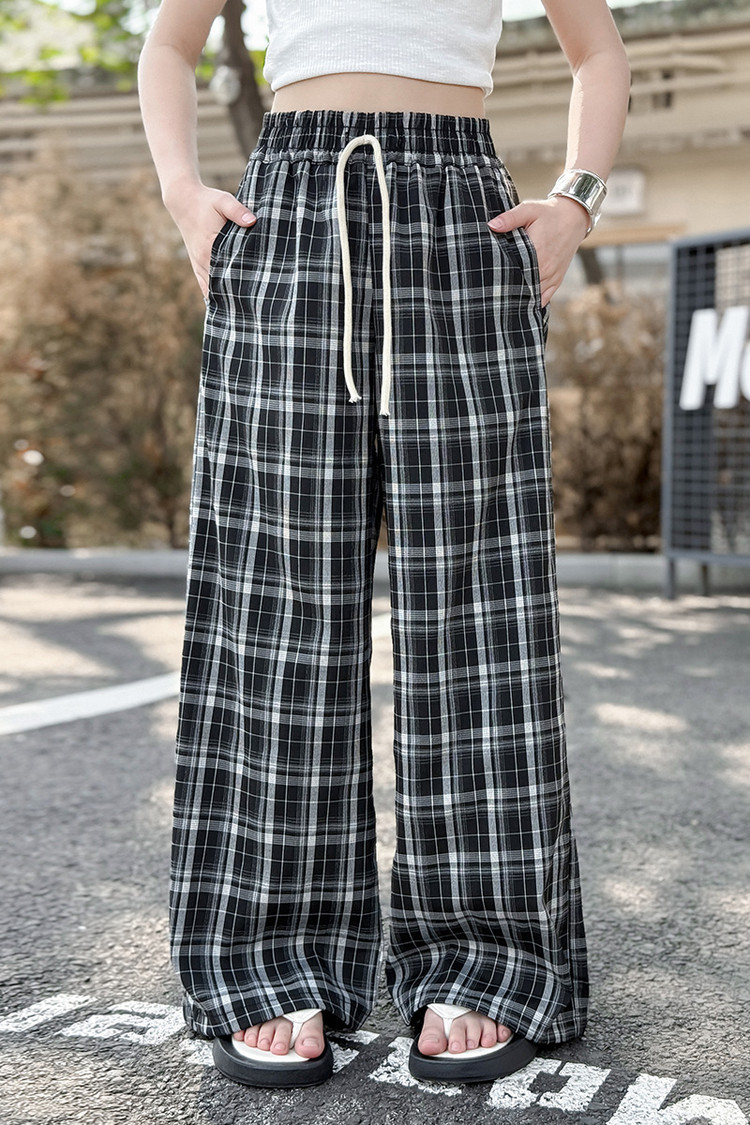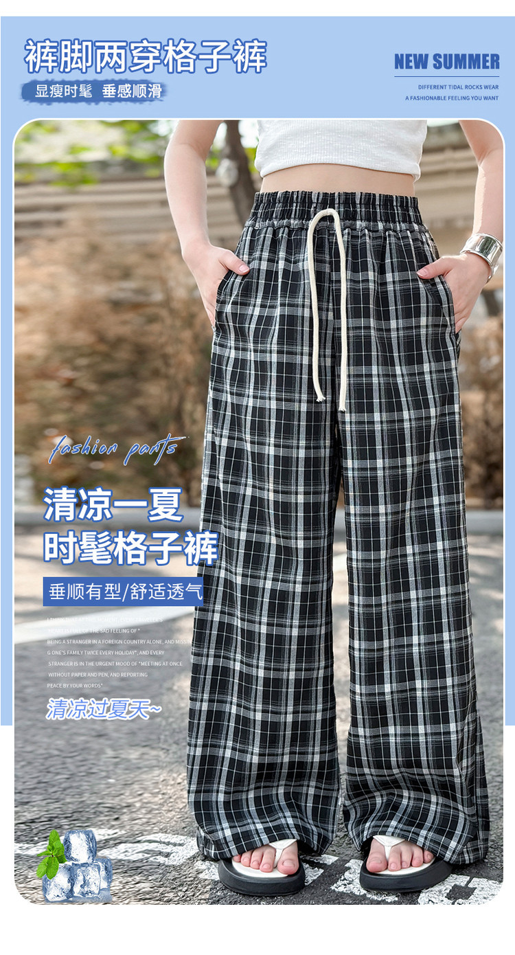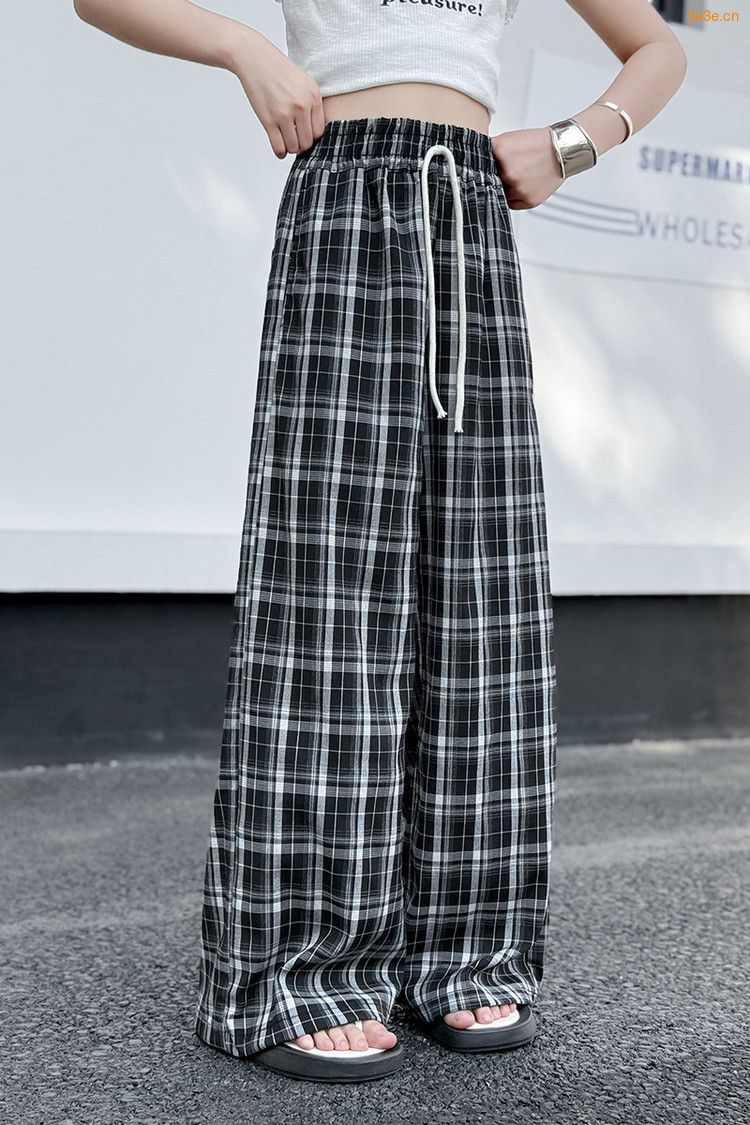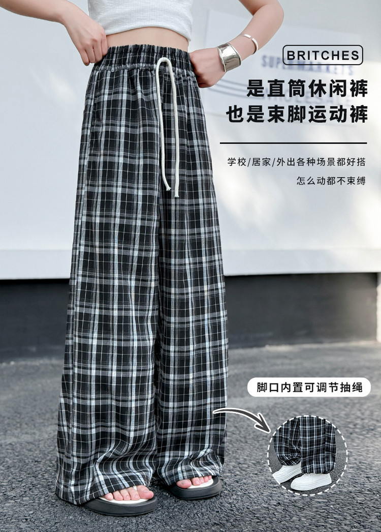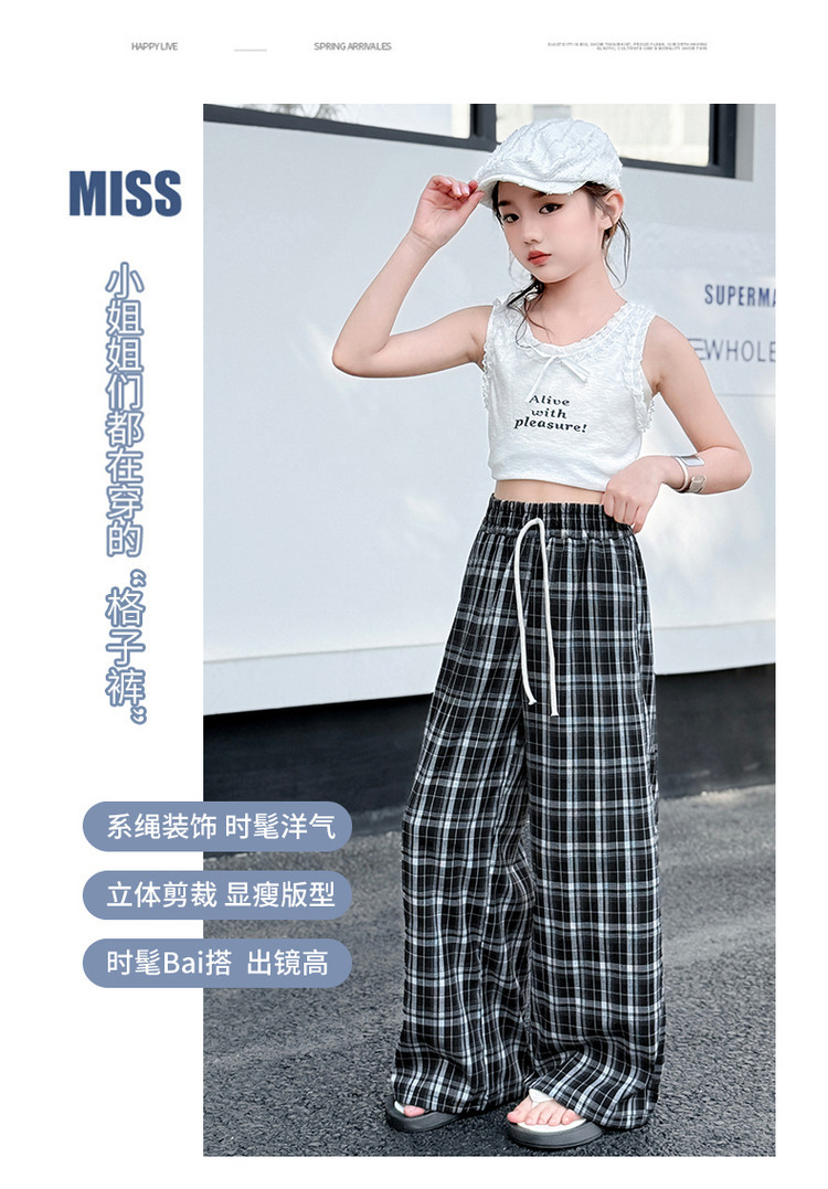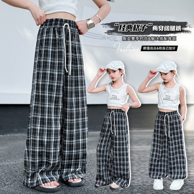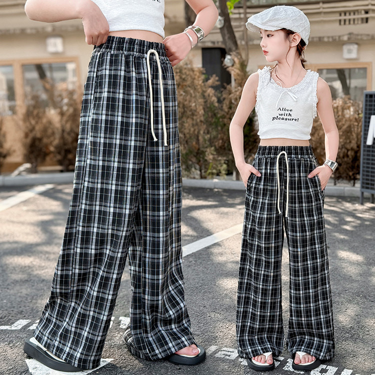 여아용 새로운 여름 스타일 흑백 격자 무늬 와이드 팬츠, 중대형 아동용 하이 웨이스트 루즈 드레이프 스트레이트 모조 린넨 바닥 길이 바지스토어 가기