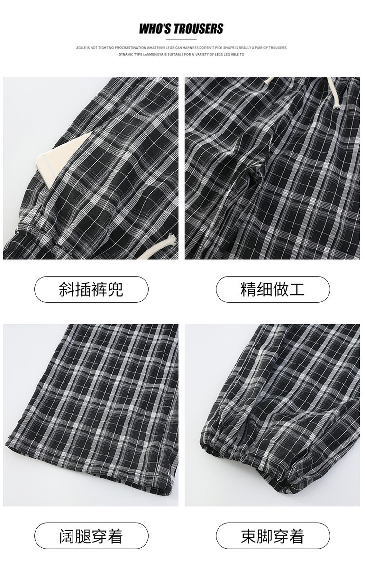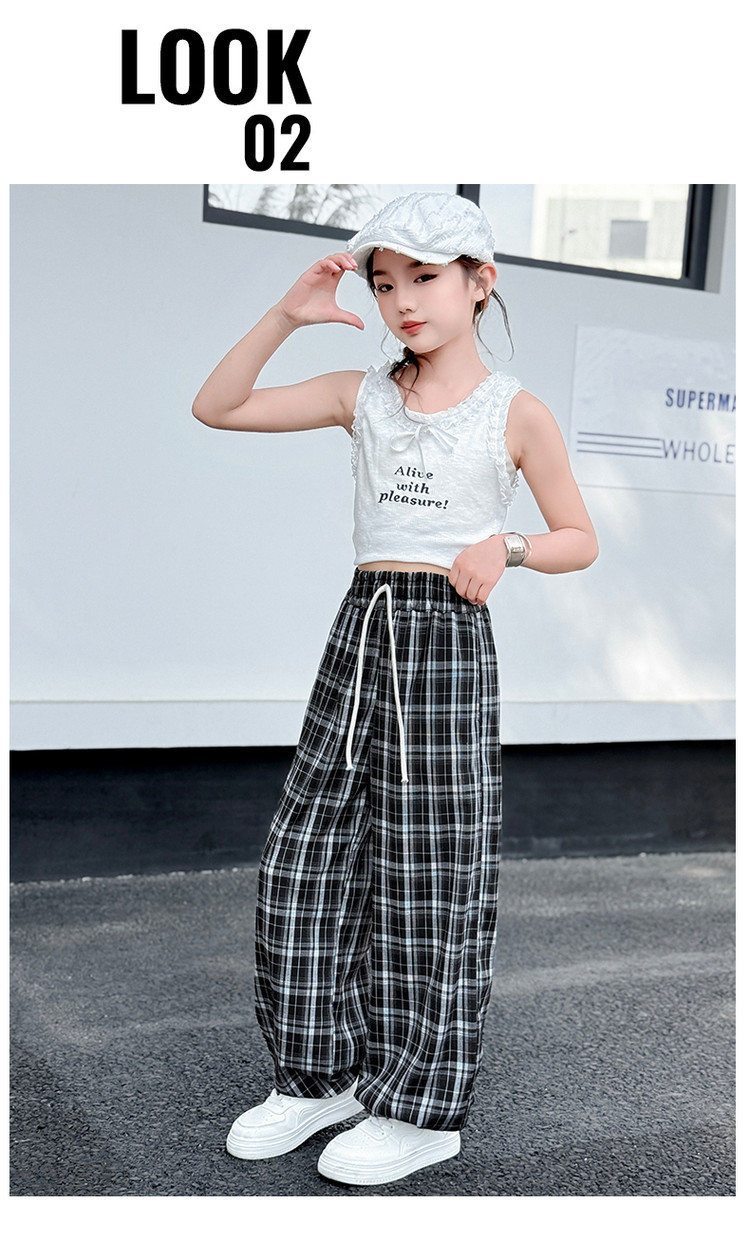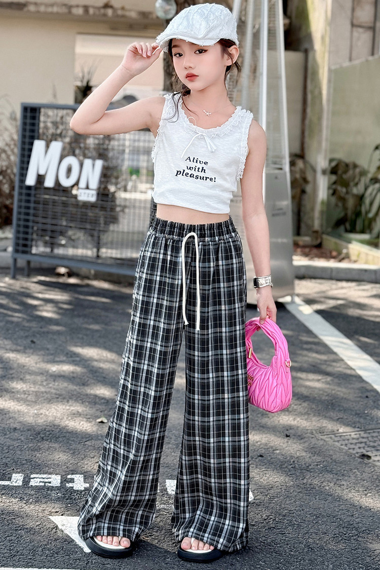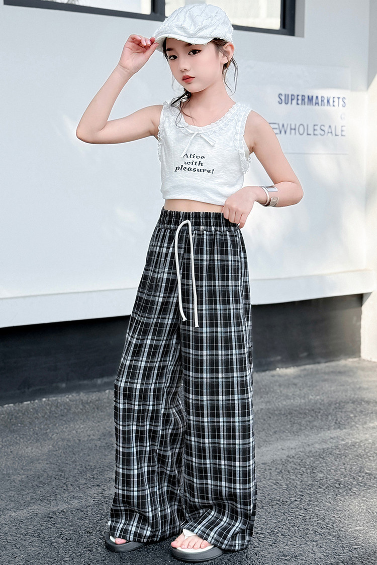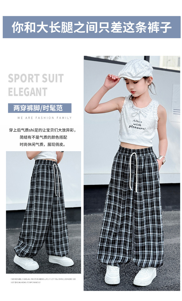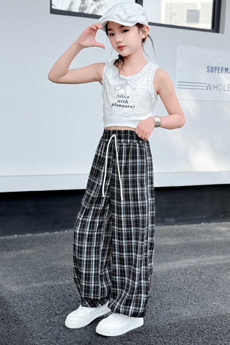 여아용 새로운 여름 스타일 흑백 격자 무늬 와이드 팬츠, 중대형 아동용 하이 웨이스트 루즈 드레이프 스트레이트 모조 린넨 바닥 길이 바지스토어 가기