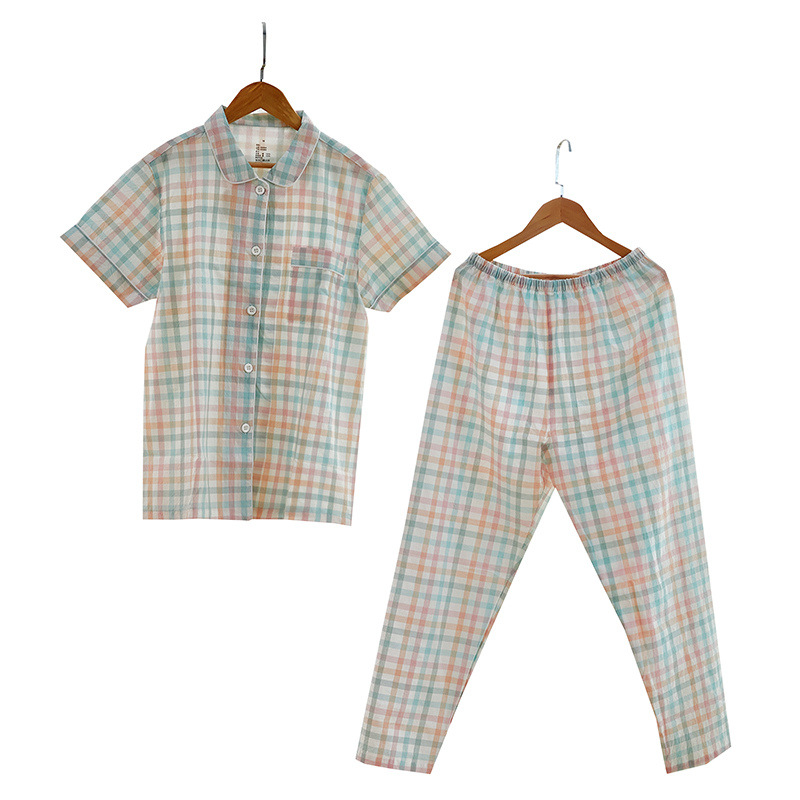 여성용 오리지널 품질 잠옷, 더블 레이어 거즈 순면 긴팔 봄, 가을, 여름 얇은 반팔 남성 커플 격자 무늬 가정복