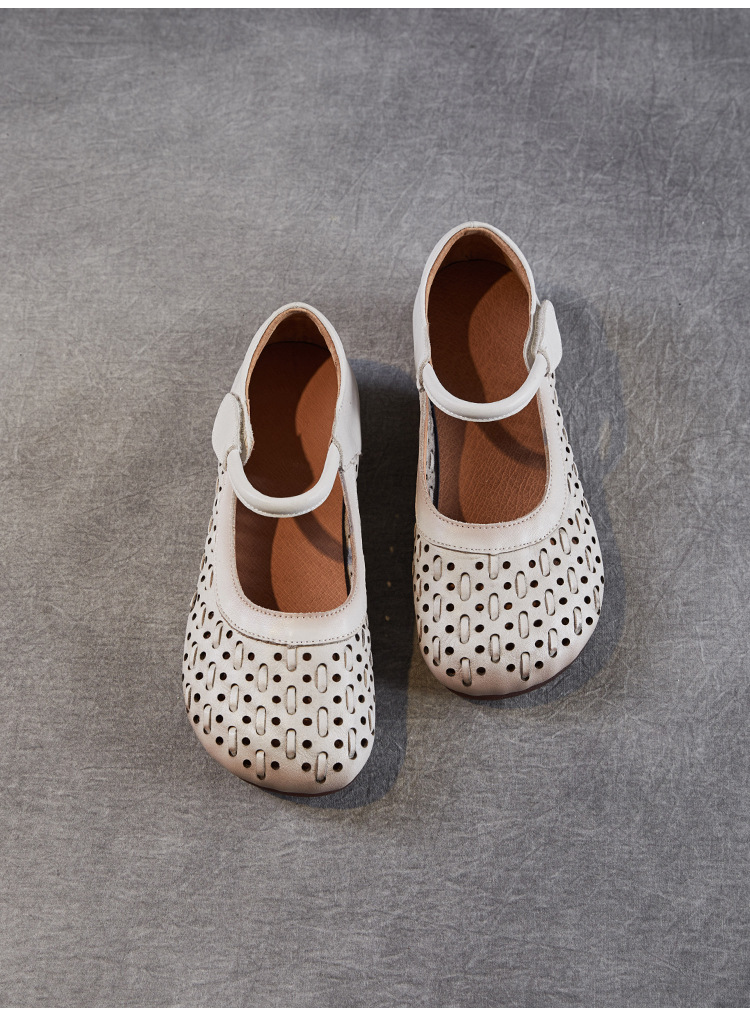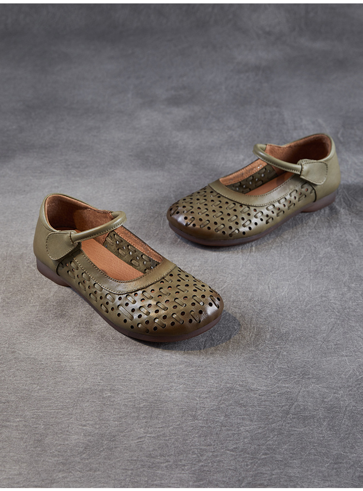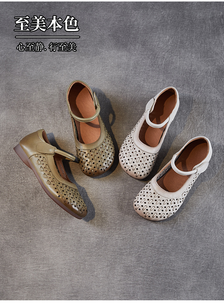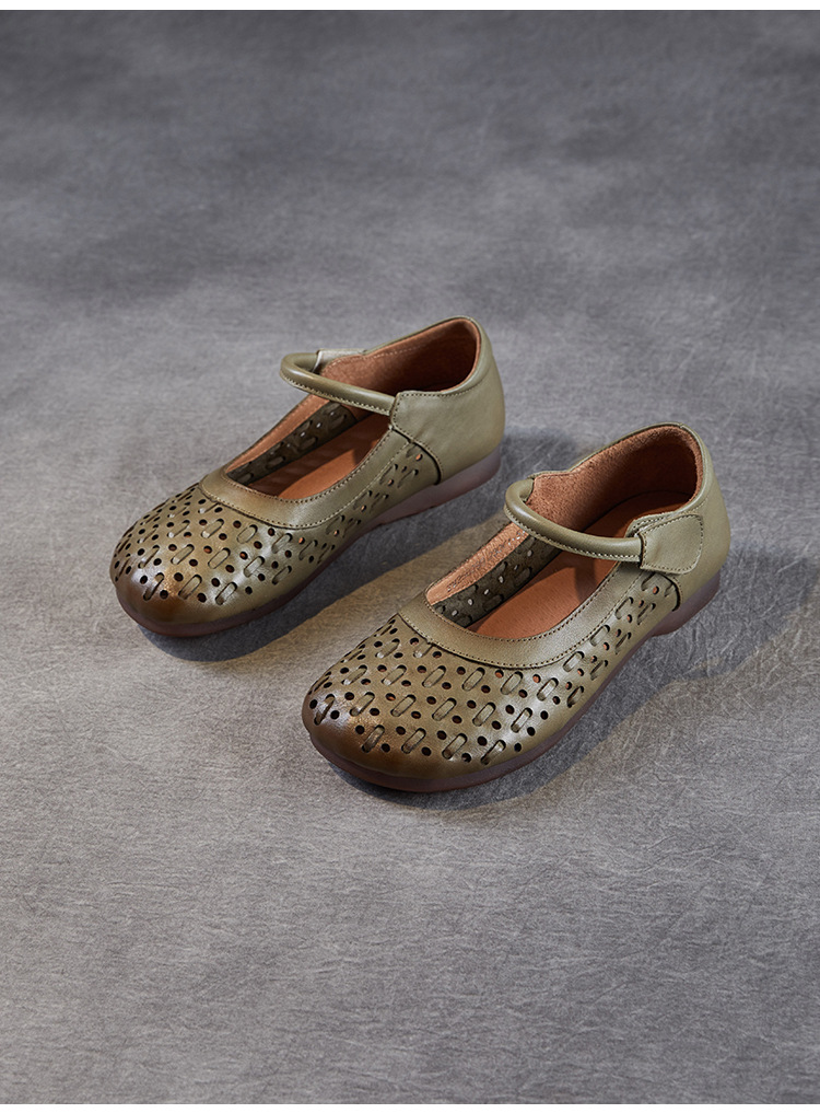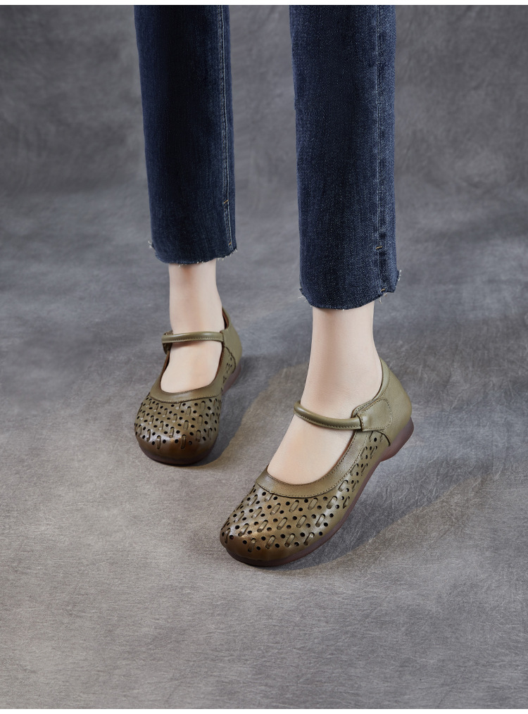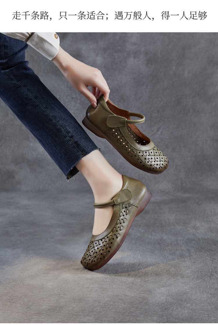 정품 가죽 싱글 레이어 신발 여성 2025 년 봄과 여름 새로운 중공 통기성 샌들 플랫 슈즈 소프트 단독 편안한 중년 엄마 신발