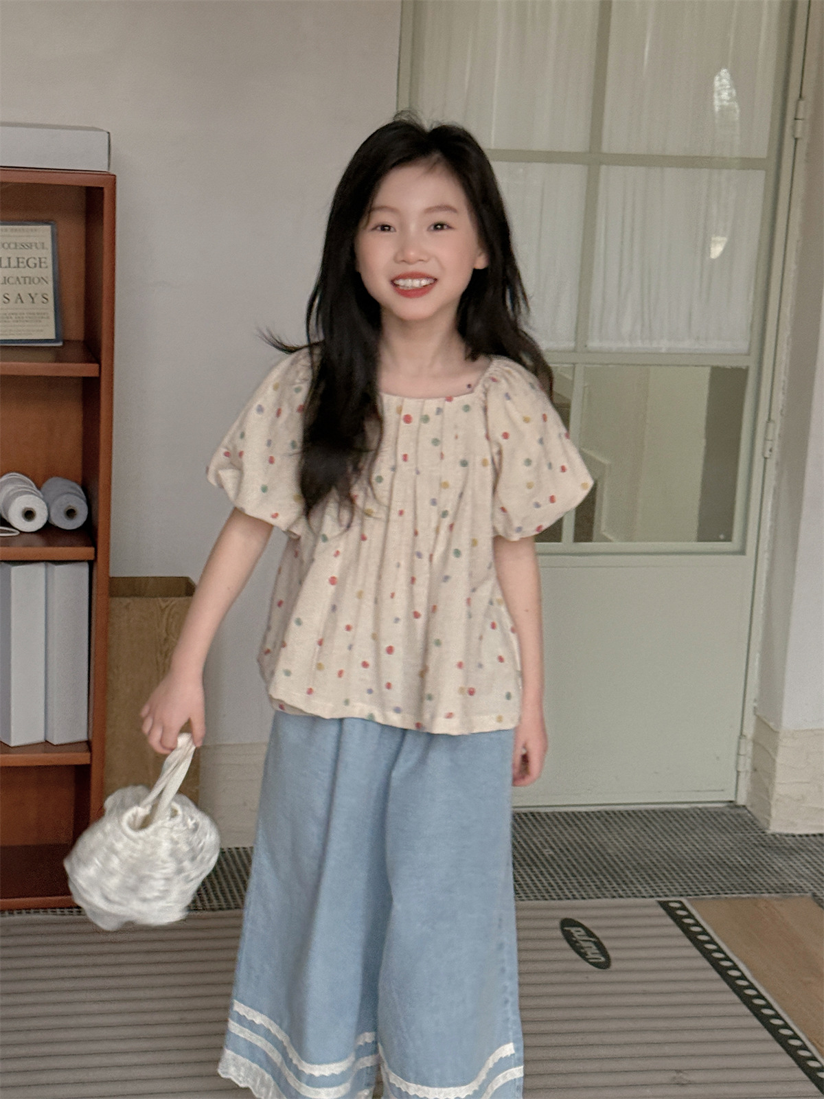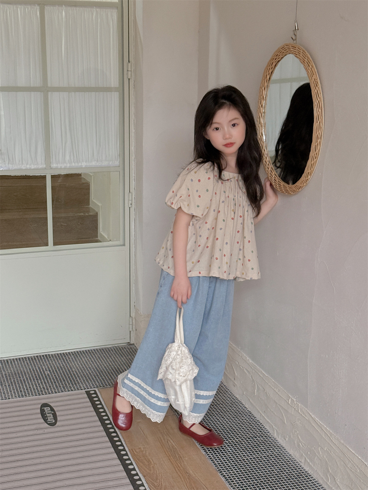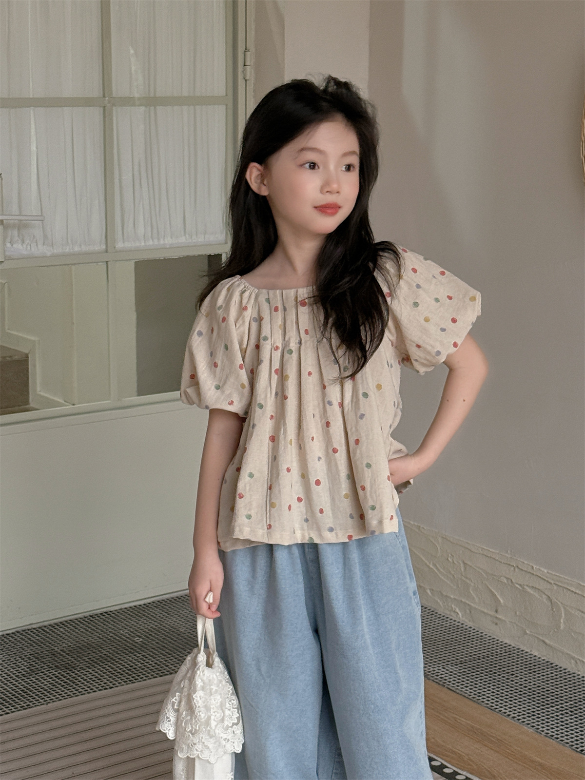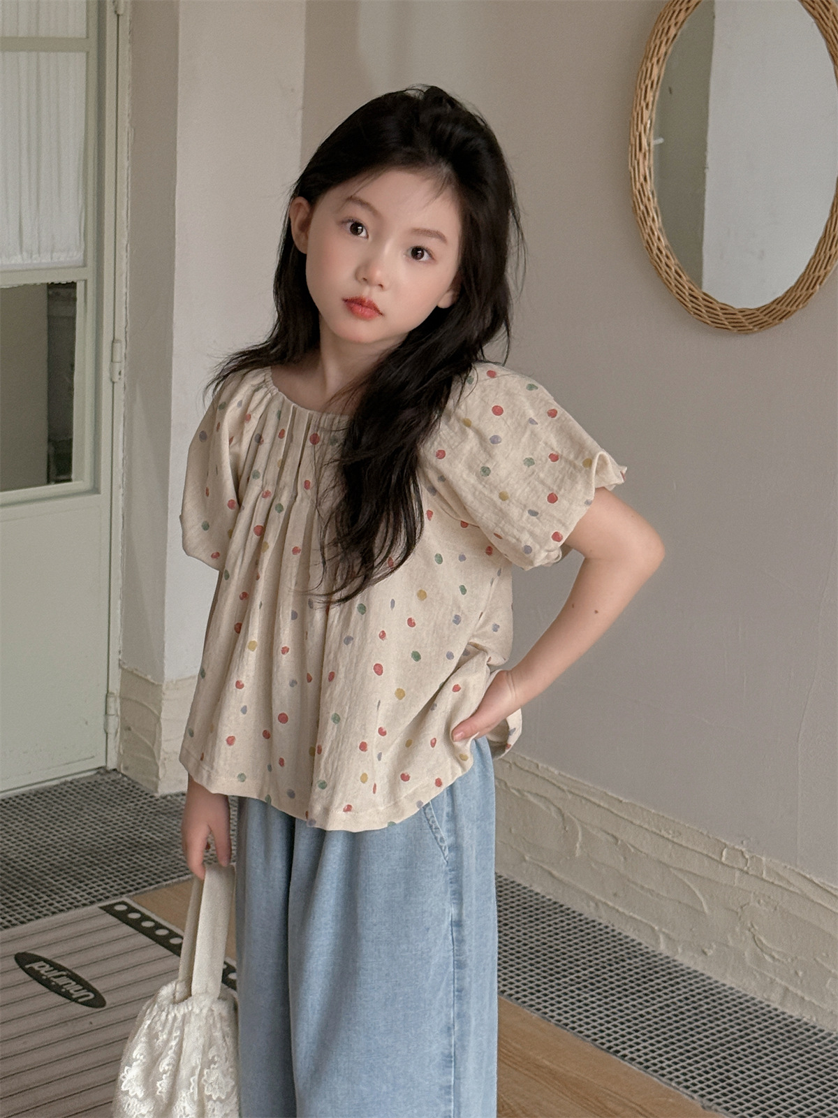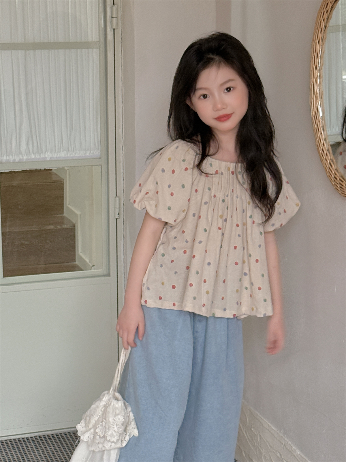 꽃과 추구 어린이 착용 소녀 인형 셔츠 2025 여름 새로운 순수 면화 웨이브 도트 서양식 최고 소녀 셔츠 트렌디스토어 가기
