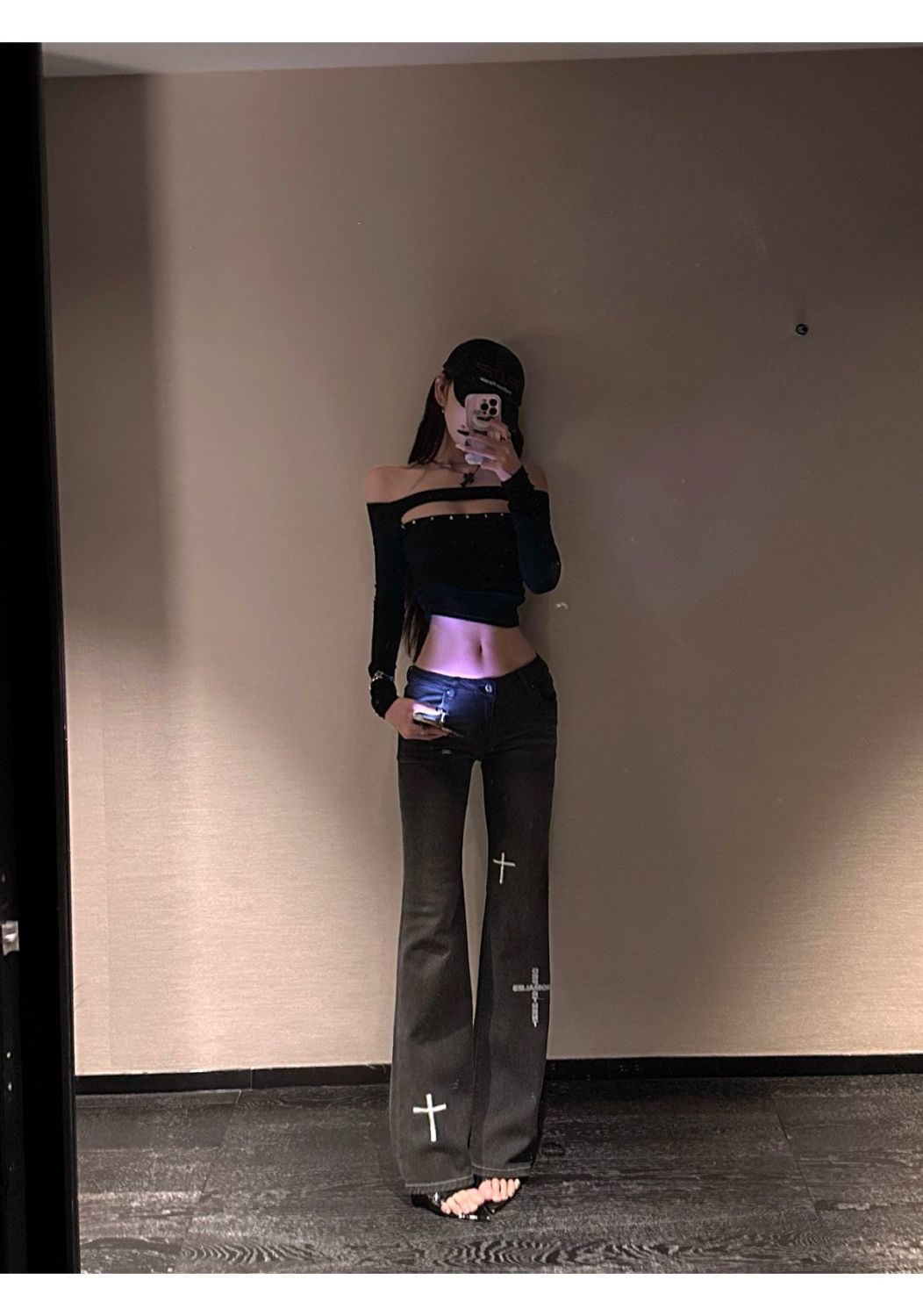 [260g 코튼 모달] 류 네일 할로우 어깨 긴 소매 티셔츠 여성용 어깨 쇼트 탑
