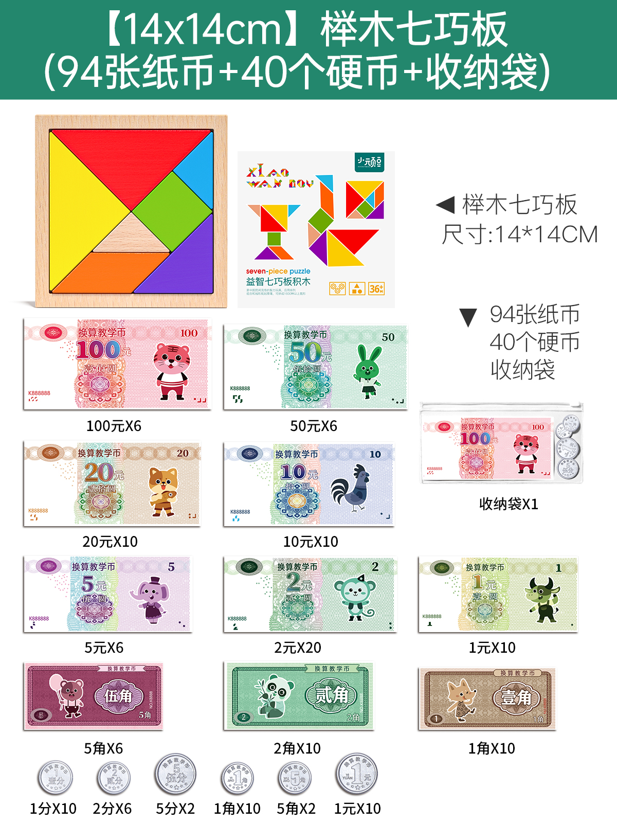 • [14x14cm] 너도밤나무 탱그램 + (지폐 94장 + 동전 40장 + 수납가방)