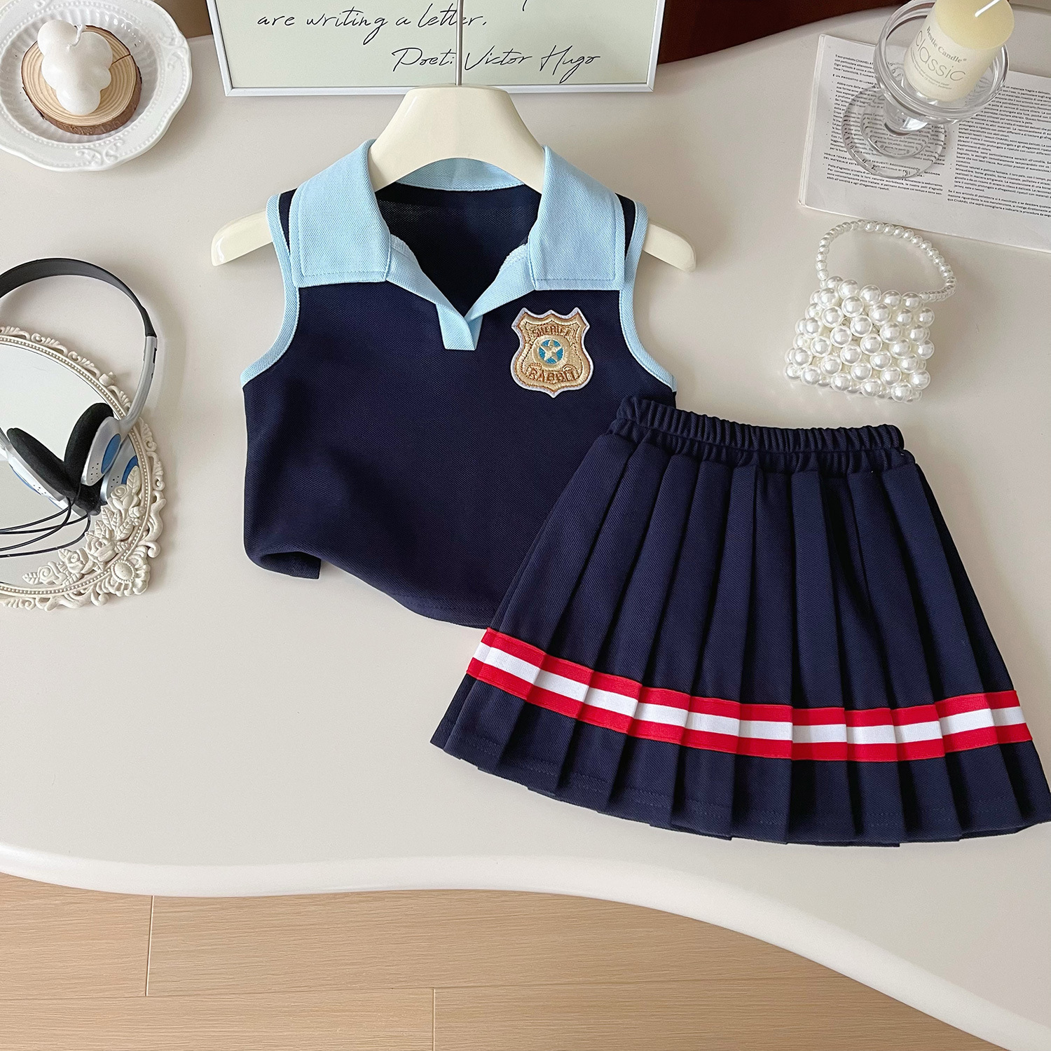 2024 여름 새로운 한국 스타일 여자 대학 스타일 소녀 민소매 상쾌한 귀여운 주름 치마 정장스토어 가기