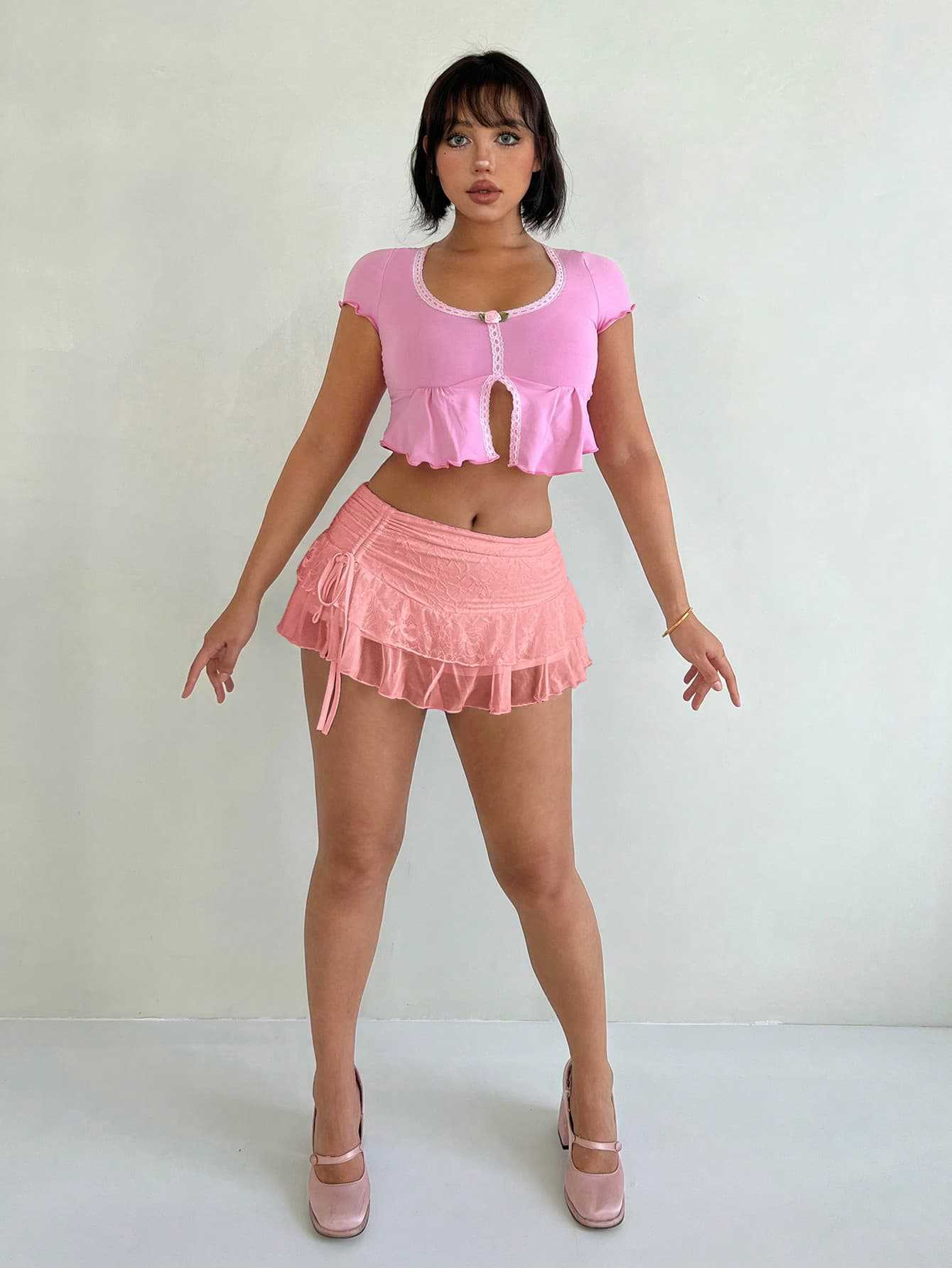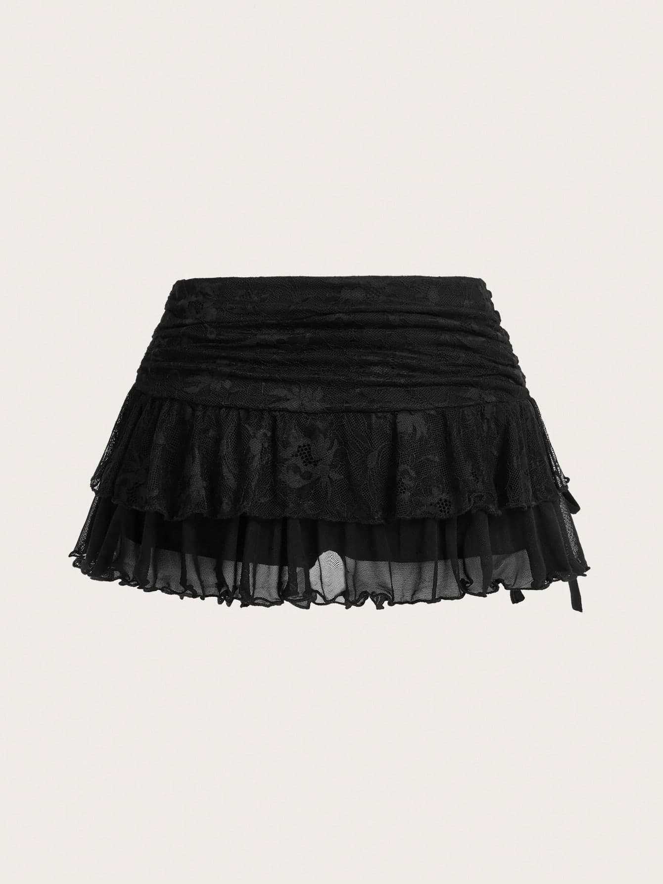 유럽과 미국 여성의 초저 허리 보우 레이스 메쉬 더블 플리츠 미니 스커트 아마존 크로스 보더 스커트